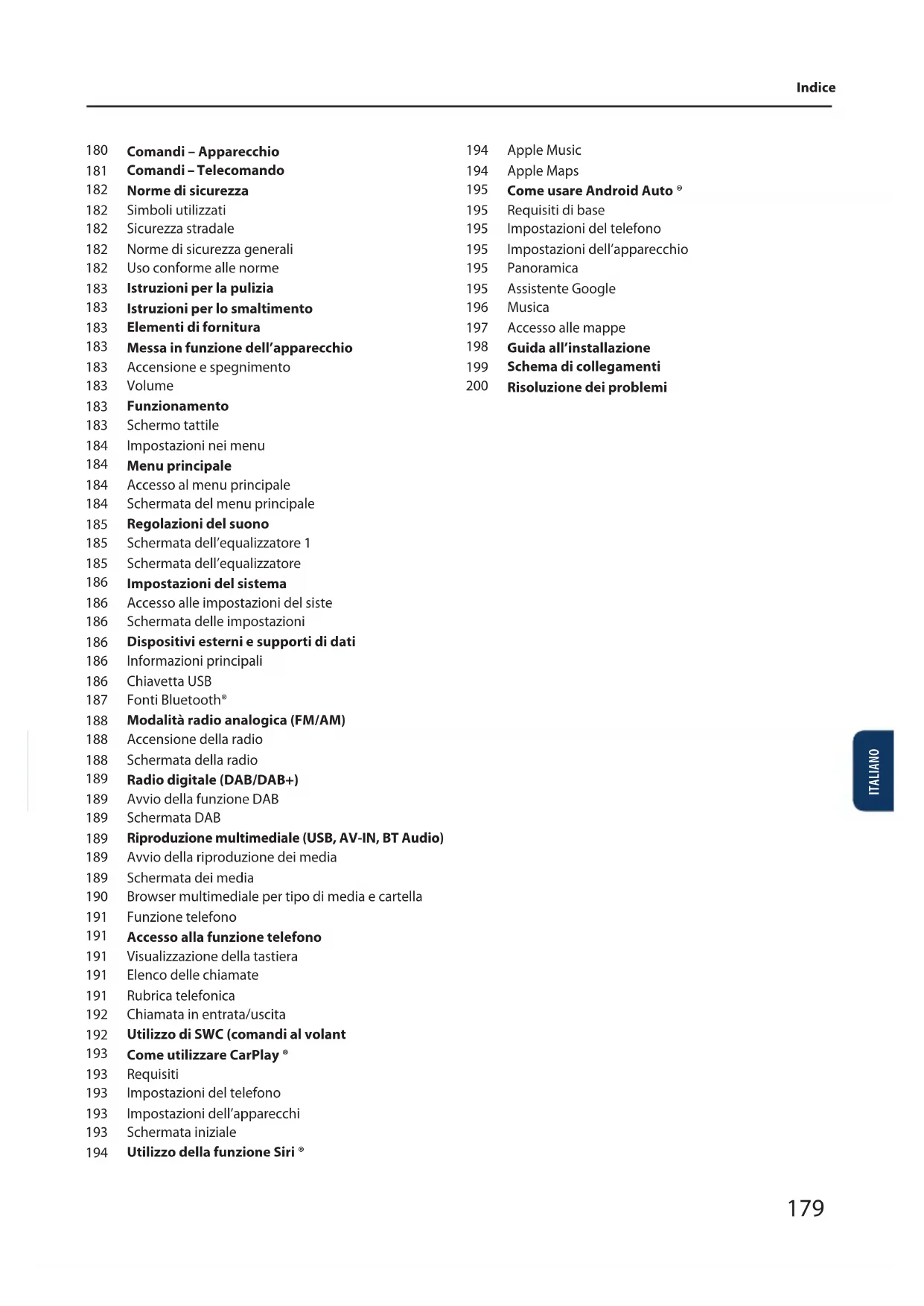 Apple Music Apple Maps Come usare Android Auto ® Requisiti di base Impostazioni del telefono Impostazioni dell’apparecchio Panoramica Assistente Google Musica Accesso alle mappe Guida all’installazione Schema di collegamenti Risoluzione dei problemi Indice ITALIANO 179Comandi - Apparecchio