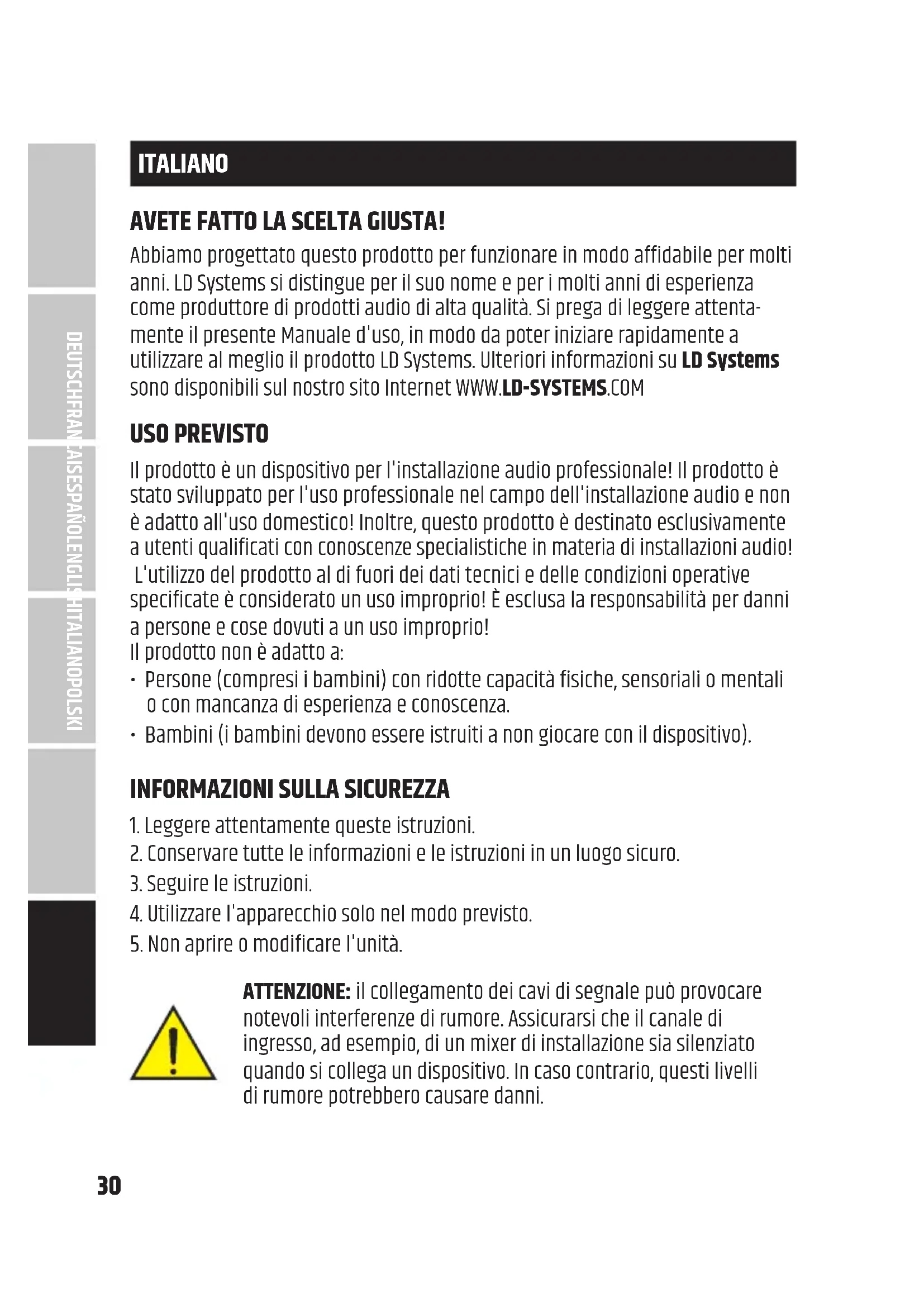 ENGLISH30 ITALIANO AVETE FATTO LA SCELTA GIUSTA! Abbiamo progettato questo prodotto per funzionare in modo affidabile per molti anni LD Systems si distingue per il suo nome e per i molti anni di esperienza come produttore di prodotti audio di alta qualità Si prega di leggere attenta- mente il presente Manuale d'uso, in modo da poter iniziare rapidamente a utilizzare al meglio il prodotto LD Systems Ulteriori informazioni su LD Systems sono disponibili sul nostro sito Internet WWWLD-SYSTEMSCOM USO PREVISTO Il prodotto è un dispositivo per l'installazione audio professionale! Il prodotto è stato sviluppato per l'uso professionale nel campo dell'installazione audio e non è adatto all'uso domestico! Inoltre, questo prodotto è destinato esclusivamente a utenti qualificati con conoscenze specialistiche in materia di installazioni audio! L'utilizzo del prodotto al di fuori dei dati tecnici e delle condizioni operative specificate è considerato un uso improprio! È esclusa la responsabilità per danni a persone e cose dovuti a un uso improprio! Il prodotto non è adatto a: