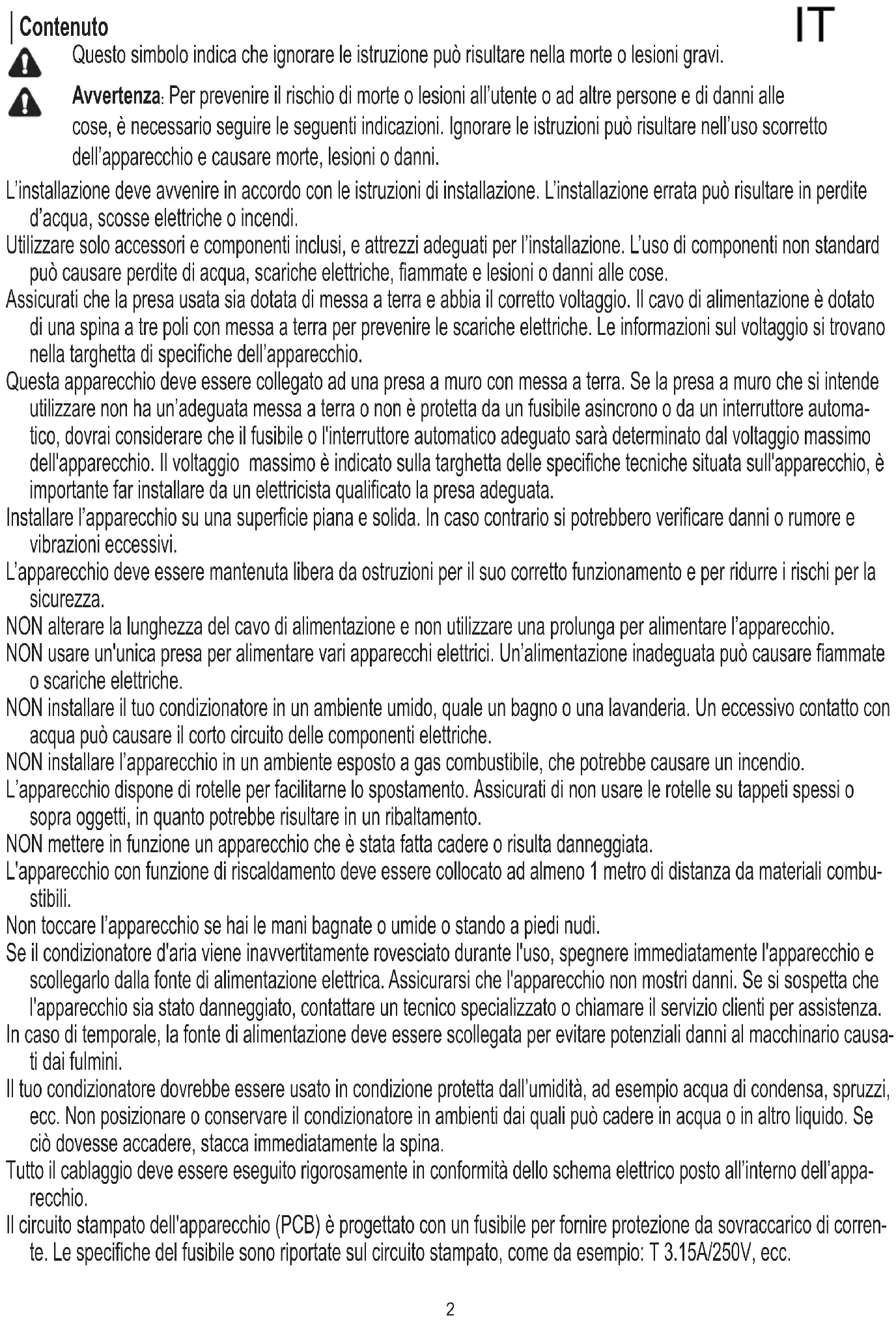 - NOTA IT2 │Contenuto Questo simbolo indica che ignorare le istruzione può risultare nella morte o lesioni gravi. Avvertenza: Per prevenire il rischio di morte o lesioni all’utente o ad altre persone e di danni alle cose, è necessario seguire le seguenti indicazioni. Ignorare le istruzioni può risultare nell’uso scorretto dell’apparecchio e causare morte, lesioni o danni. L’installazione deve avvenire in accordo con le istruzioni di installazione. L’installazione errata può risultare in perdite d’acqua, scosse elettriche o incendi. Utilizzare solo accessori e componenti inclusi, e attrezzi adeguati per l’installazione. L’uso di componenti non standard può causare perdite di acqua, scariche elettriche, fiammate e lesioni o danni alle cose. Assicurati che la presa usata sia dotata di messa a terra e abbia il corretto voltaggio. Il cavo di alimentazione è dotato di una spina a tre poli con messa a terra per prevenire le scariche elettriche. Le informazioni sul voltaggio si trovano nella targhetta di specifiche dell’apparecchio. Questa apparecchio deve essere collegato ad una presa a muro con messa a terra. Se la presa a muro che si intende utilizzare non ha un’adeguata messa a terra o non è protetta da un fusibile asincrono o da un interruttore automa- tico, dovrai considerare che il fusibile o l'interruttore automatico adeguato sarà determinato dal voltaggio massimo dell'apparecchio. Il voltaggio massimo è indicato sulla targhetta delle specifiche tecniche situata sull'apparecchio, è importante far installare da un elettricista qualificato la presa adeguata. Installare l’apparecchio su una superficie piana e solida. In caso contrario si potrebbero verificare danni o rumore e vibrazioni eccessivi. L’apparecchio deve essere mantenuta libera da ostruzioni per il suo corretto funzionamento e per ridurre i rischi per la sicurezza. NON alterare la lunghezza del cavo di alimentazione e non utilizzare una prolunga per alimentare l’apparecchio. NON usare un'unica presa per alimentare vari apparecchi elettrici. Un’alimentazione inadeguata può causare fiammate o scariche elettriche. NON installare il tuo condizionatore in un ambiente umido, quale un bagno o una lavanderia. Un eccessivo contatto con acqua può causare il corto circuito delle componenti elettriche. NON installare l’apparecchio in un ambiente esposto a gas combustibile, che potrebbe causare un incendio. L’apparecchio dispone di rotelle per facilitarne lo spostamento. Assicurati di non usare le rotelle su tappeti spessi o sopra oggetti, in quanto potrebbe risultare in un ribaltamento. NON mettere in funzione un apparecchio che è stata fatta cadere o risulta danneggiata. L'apparecchio con funzione di riscaldamento deve essere collocato ad almeno 1 metro di distanza da materiali combu- stibili. Non toccare l’apparecchio se hai le mani bagnate o umide o stando a piedi nudi. Se il condizionatore d'aria viene inavvertitamente rovesciato durante l'uso, spegnere immediatamente l'apparecchio e scollegarlo dalla fonte di alimentazione elettrica. Assicurarsi che l'apparecchio non mostri danni. Se si sospetta che l'apparecchio sia stato danneggiato, contattare un tecnico specializzato o chiamare il servizio clienti per assistenza. In caso di temporale, la fonte di alimentazione deve essere scollegata per evitare potenziali danni al macchinario causa- ti dai fulmini. Il tuo condizionatore dovrebbe essere usato in condizione protetta dall’umidità, ad esempio acqua di condensa, spruzzi, ecc. Non posizionare o conservare il condizionatore in ambienti dai quali può cadere in acqua o in altro liquido. Se ciò dovesse accadere, stacca immediatamente la spina. Tutto il cablaggio deve essere eseguito rigorosamente in conformità dello schema elettrico posto all’interno dell’appa- recchio. Il circuito stampato dell'apparecchio (PCB) è progettato con un fusibile per fornire protezione da sovraccarico di corren- te. Le specifiche del fusibile sono riportate sul circuito stampato, come da esempio: T 3.15A/250V, ecc. IT3 │Contenuto Precauzioni Questo apparecchio non può essere utilizzato da bambini di età pari o superiore agli 8 anni e da persone con ridotte ca- pacità fisiche, sensoriali o mentali oppure senza la necessaria esperienza e conoscenza, a meno che non sia dietro supervisione o che abbiano ricevuto una formazione circa l'utilizzo sicuro dell'apparecchio in modo da comprenderne i potenziali pericoli. I bambini non devono mai giocare con l'apparecchio. La pulizia e la manutenzione non devono mai essere eseguite da bambini senza supervisione (norma applicabile nei paesi europei) Questo apparecchio non è destinato all'uso da parte di persone (compresi i bambini) con capacità fisiche o mentali sensoriali ridotte o mancanza di esperienza e conoscenza, a meno che non siano supervisionati o siano stati istruiti sull'uso dell'apparecchio da parte di una persona responsabile della loro salvaguardia. (norma applicabile in altri paesi eccetto i paesi europei) I bambini devono essere costantemente sorvegliati per assicurarsi che non giochino con l'apparecchio (si I bambini devono essere costantemente sorvegliati in presenza dell'apparecchio Se il cavo di alimentazione è danneggiato, questo dovrà essere sostituito dal produttore, da un addetto all’assistenza o da personale qualificato in modo da evitare rischi. Prima della pulizia o di altro tipo di manutenzione, l’apparecchio deve essere scollegato dalla fonte di alimentazione. Non rimuovere i coperchi fissi. Non mettere in funzione l’apparecchio se è stato fatto cadere o si presenta danneggiato. Non far passare il cavo di alimentazione sotto moquette o tappeti. Non coprire il cavo con tappeti, stuoie o rivestimenti simili. Non far passare il cavo sotto mobili o elettrodomestici. Posizionare il cavo lontano dall'area di maggior passag- gio e dove non sarà di inciampo. Non utilizzare l’apparecchio in presenza di cavo spina, fusibile o inte