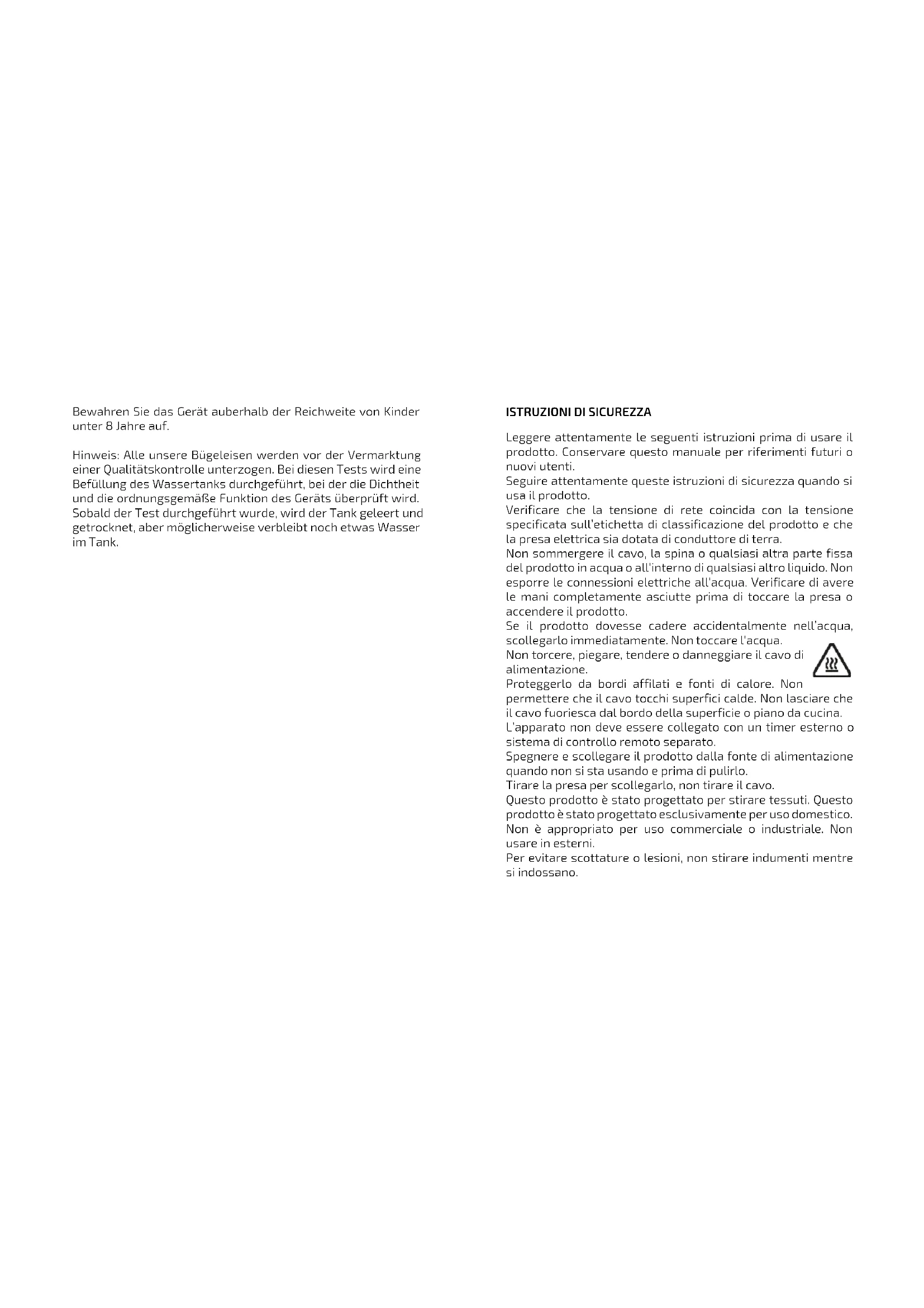 Leggere attentamente le seguenti istruzioni prima di usare il prodotto. Conservare questo manuale per riferimenti futuri o nuovi utenti. Seguire attentamente queste istruzioni di sicurezza quando si usa il prodotto. Verificare che la tensione di rete coincida con la tensione specificata sull’etichetta di classificazione del prodotto e che la presa elettrica sia dotata di conduttore di terra. Non sommergere il cavo, la spina o qualsiasi altra parte fissa del prodotto in acqua o all’interno di qualsiasi altro liquido. Non esporre le connessioni elettriche all’acqua. Verificare di avere le mani completamente asciutte prima di toccare la presa o accendere il prodotto. Se il prodotto dovesse cadere accidentalmente nell’acqua, scollegarlo immediatamente. Non toccare l’acqua. Non torcere, piegare, tendere o danneggiare il cavo di alimentazione. Proteggerlo da bordi affilati e fonti di calore. Non permettere che il cavo tocchi superfici calde. Non lasciare che il cavo fuoriesca dal bordo della superficie o piano da cucina. L’apparato non deve essere collegato con un timer esterno o sistema di controllo remoto separato. Spegnere e scollegare il prodotto dalla fonte di alimentazione quando non si sta usando e prima di pulirlo. Tirare la presa per scollegarlo, non tirare il cavo. Questo prodotto è stato progettato per stirare tessuti. Questo prodotto è stato progettato esclusivamente per uso domestico. Non è appropriato per uso commerciale o industriale. Non usare in esterni. Per evitare scottature o lesioni, non stirare indumenti mentre si indossano.Il mancato uso di accessori non suggeriti da Cecotec potrebbe provocare lesioni o danni. Collocare l’apparato su di una superficie asciutta, stabile, piatta e resistente al calore. La temperatura delle superfici accessibili potrebbe essere alta mentre si usa il prodotto e potrebbe causare bruciature. Non toccare le superfici calde mentre è in funzionamento e immediatamente dopo. Scollegare immediatamente il prodotto quando si osservano fiamme o fumo. Non lasciare l’apparato senza supervisione mentre è in uso. Scollegarlo dalla fonte di alimentazione quando non si sta usando o quando si abbandona la stanza. Il prodotto non deve essere collegato quando si riempie o si svuota il serbatoio dell’acqua. Il tappo del serbatoio dell’acqua non deve essere aperto quando il ferro risulta acceso. Si consiglia l’uso di acqua del rubinetto. Se l’acqua contiene troppo calcare, preparare un composto costituito da un 50% di acqua di rubinetto e un 50% di acqua a basso contenuto di sodio. Non usare solamente acqua dal basso residuo fisso. Le parti metalliche calde, l’acqua calda o il vapore potrebbero produrre scottature. Potrebbero esserci fughe di acqua calda. Prestare attenzione quando si riempie il serbatoio o si capovolge il ferro da stiro. Per evitare scottature o lesioni, non dirigere il vapore verso persone o animali. Il ferro da stiro deve essere usato su superfici stabili. Verificare che l’apparato sia collocato su di una superficie piana e stabile. Mantenere il ferro da stiro a massima temperatura per un periodo di tempo prolungato potrebbe causare una decolorazione dello stesso che non ripercuoterà sul suo funzionamento. Non cercare di riparare il prodotto per conto proprio. Contattare il Servizio di Assistenza Tecnica ufficiale di Cecotec. La pulizia e la manutenzione del prodotto devono essere effettuate secondo quanto indicato in questo manuale di istruzioni per garantire il corretto funzionamento dello stesso. Spegnere e scollegare il prodotto prima di muoverlo o pulirlo. Lasciare raffreddare completamente prima di pulirlo o conservarlo. La pulizia e manutenzione non devono essere effettuate da bambini. Conservare il prodotto e il manuale di istruzioni in un luogo asciutto e sicuro quando non usato. Cecotec non si farà responsabile di danni o lesioni che siano la conseguenza dell’uso inappropriato del prodotto. L’uso non corretto delle istruzioni di questo manuale non prevede la garanzia del prodotto e le responsabilità del fabbricante. Se il cavo di alimentazione risulta danneggiato, deve essere sostituito da Cecotec, dal servizio di post-vendita o da personale qualificato per evitare pericoli. L’apparato non deve essere usato da bambini da 0 a 8 anni. Questo elettrodomestico può essere utilizzato da bambini a partire dagli 8 anni sotto la supervisione continua di un adulto. Questo prodotto può essere usato da persone con capacità fisiche, sensoriali o mentali limitate, o con mancanza di esperienza e conoscenza solo sotto supervisione o avendo ricevuto istruzioni riguardanti l’uso dell’apparato in modo sicuro e comprendono i rischi che lo stesso implica. Supervisionare i bambini per assicurarsi che non giochino con il prodotto. È necessario sorvegliare rigidamente nel caso in cui il prodotto venga utilizzato da o vicino a bambini. Mantenere l’apparato e il suo cavo fuori dalla portata dei bambini di età inferiore a 8 anni.Avvertenza: tutta la gamma di ferri da stiro passa un controllo di qualità prima di essere commercializzata. Viene effettuato un riempimento del serbatoio d’acqua nel quale viene verificata la raccolta e il corretto funzionamento. Effettuata la prova, si procede con lo svuotamento e asciugatura del serbatoio nel quale potrebbero rimanere dei residui d’acqua.