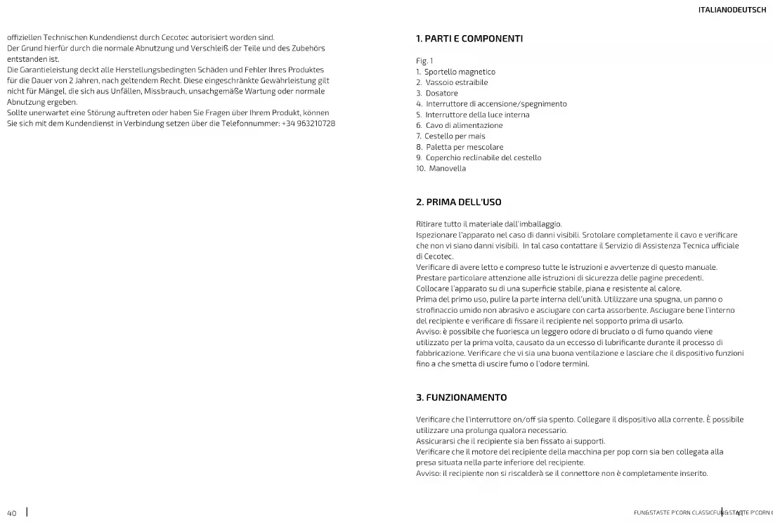 - Se il problema è stato generato da un’usura normale dei pezzi dovuta all’uso. Il servizio di garanzia copre tutti i difetti di fabbricazione per 2 anni secondo la legislazione in vigore, ad eccezione dei pezzi consumabili. Nel caso di cattivo uso da parte dell’utente, il servizio di garanzia non si farà responsabile della riparazione. Qualora ci fosse un problema con il prodotto o avere una consulenza, contattare il Servizio di Assistenza Tecnica uciale di Cecotec attraverso il numero di telefono +34 96 321 07 28. Utilizzare il dosatore fornito per introdurre un cucchiaio d’olio nel recipiente. Si consiglia l’uso di olio vegetale per ottenere i migliori risultati. Utilizzare il dosatore di chicchi di mais per introdurre il mais nel recipiente. Avviso: quando si usano chicchi di mais con il contenuto precedentemente pesato, si consiglia di usare sia il bicchiere che il dosatore per pesare di nuovo gli ingredienti. Seguire le seguenti misurazioni: 1 cucchiaio di olio + 57 g di mais = 8 bicchieri di mais (non eccedere i 71 g di chicchi di mais). Accendere il dispositivo e chiudere lo sportello. Dopo alcuni secondi è possibile sentire scoppiettare i pop corn. I pop corn caldi usciranno dai coperchi ribaltabili del recipiente. Accendere l’interruttore della luce per vericare lo stato di preparazione dei pop corn. Utilizzare la manovella per svuotare il contenuto del cestello. Terminato lo scoppiettio dei pop corn, spegnere il dispositivo. Svuotare i pop corn dal recipiente. Per fare ciò, sostenere la macchina per pop corn dal manico e inclinarlo. Aprire lo sportello, rimuovere il vassoio con i pop corn e servirli. Consigli per l’uso La fuoriuscita di fumo durante il processo di cottura potrebbe essere dovuta da un accumulo di grasso. Per evitare eventuali fuoriuscite di fumo, pulire la parte interna del recipiente tra un uso e l’altro. Per migliori risultati utilizzare chicchi di mais sgusciati e naturali. I chicchi di mais di alcune marche possono avere il guscio più duro che potrebbe causare che altri chicchi non si preparino. Utilizzare olio vegetale per ottenere migliori risultati.