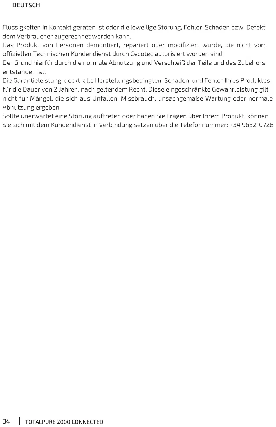 Questo prodotto ha una garanzia di 2 anni a partire dalla data di acquisto, sempre e quando viene conservata e inviata la fattura di acquisto, il prodotto stia in perfetto stato sico e si utilizzi in modo adeguato così come indicato nel manuale di istruzioni. La garanzia non coprirà: Se il prodotto è stato utilizzato al di fuori della sua capacità o di utilizzo, maltrattato, colpito, esposto ad umidità, sommerso da qualche liquido o sostanza corrosiva, così come qualsiasi altra mancanza attribuibile al consumatore. Se il prodotto è stato smontato, modicato o riparato da persone non autorizzate dal SAT ufciale di Cecotec. Se il problema è stato generato da un’usura normale dei pezzi dovuta all’uso. Il servizio di garanzia copre tutti i difetti di fabbricazione per 2 anni secondo la legislazione in vigore, ad eccezione dei pezzi consumabili. Nel caso di cattivo uso da parte dell’utente, il servizio di garanzia non si farà responsabile della riparazione. Qualora ci fosse un problema con il prodotto o avere una consulenza, contattare il Servizio di Assistenza Tecnica ufciale di Cecotec attraverso il numero di telefono +34 96 321 07 28.39 PORTUGUÊS TOTALPURE 2000 CONNECTED