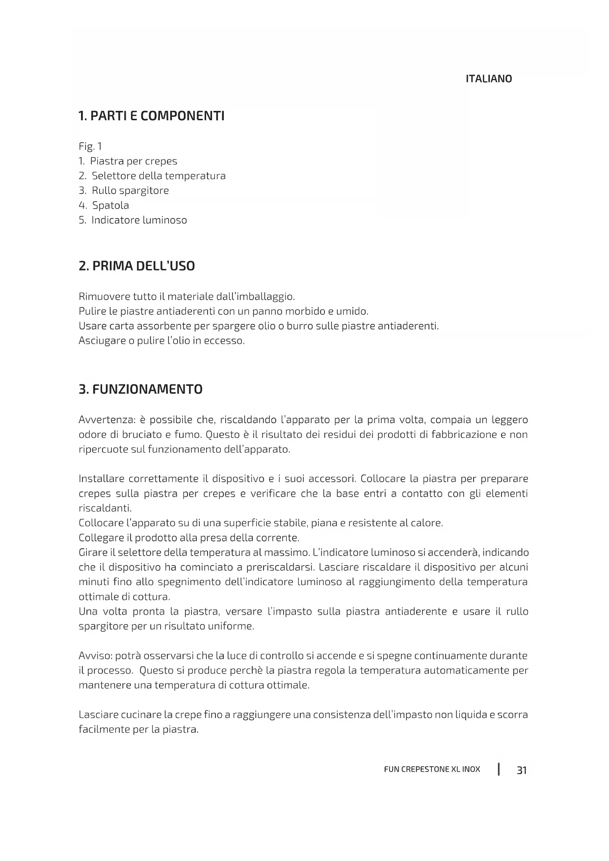 Avvertenza: è possibile che, riscaldando l’apparato per la prima volta, compaia un leggero odore di bruciato e fumo. Questo è il risultato dei residui dei prodotti di fabbricazione e non ripercuote sul funzionamento dell’apparato. Installare correttamente il dispositivo e i suoi accessori. Collocare la piastra per preparare crepes sulla piastra per crepes e verificare che la base entri a contatto con gli elementi riscaldanti. Collocare l’apparato su di una superficie stabile, piana e resistente al calore. Collegare il prodotto alla presa della corrente. Girare il selettore della temperatura al massimo. L’indicatore luminoso si accenderà, indicando che il dispositivo ha cominciato a preriscaldarsi. Lasciare riscaldare il dispositivo per alcuni minuti fino allo spegnimento dell’indicatore luminoso al raggiungimento della temperatura ottimale di cottura. Una volta pronta la piastra, versare l’impasto sulla piastra antiaderente e usare il rullo spargitore per un risultato uniforme. Avviso: potrà osservarsi che la luce di controllo si accende e si spegne continuamente durante il processo. Questo si produce perchè la piastra regola la temperatura automaticamente per mantenere una temperatura di cottura ottimale. Lasciare cucinare la crepe fino a raggiungere una consistenza dell’impasto non liquida e scorra facilmente per la piastra. 08019_Crepera Fun Crepestone XL Inox_Manual_YV_01200723docx.indd 3108019_Crepera Fun Crepestone XL Inox_Manual_YV_01200723docx.indd 31 24/7/20 12:4824/7/20 12:48FUN CREPESTONE XL INOX