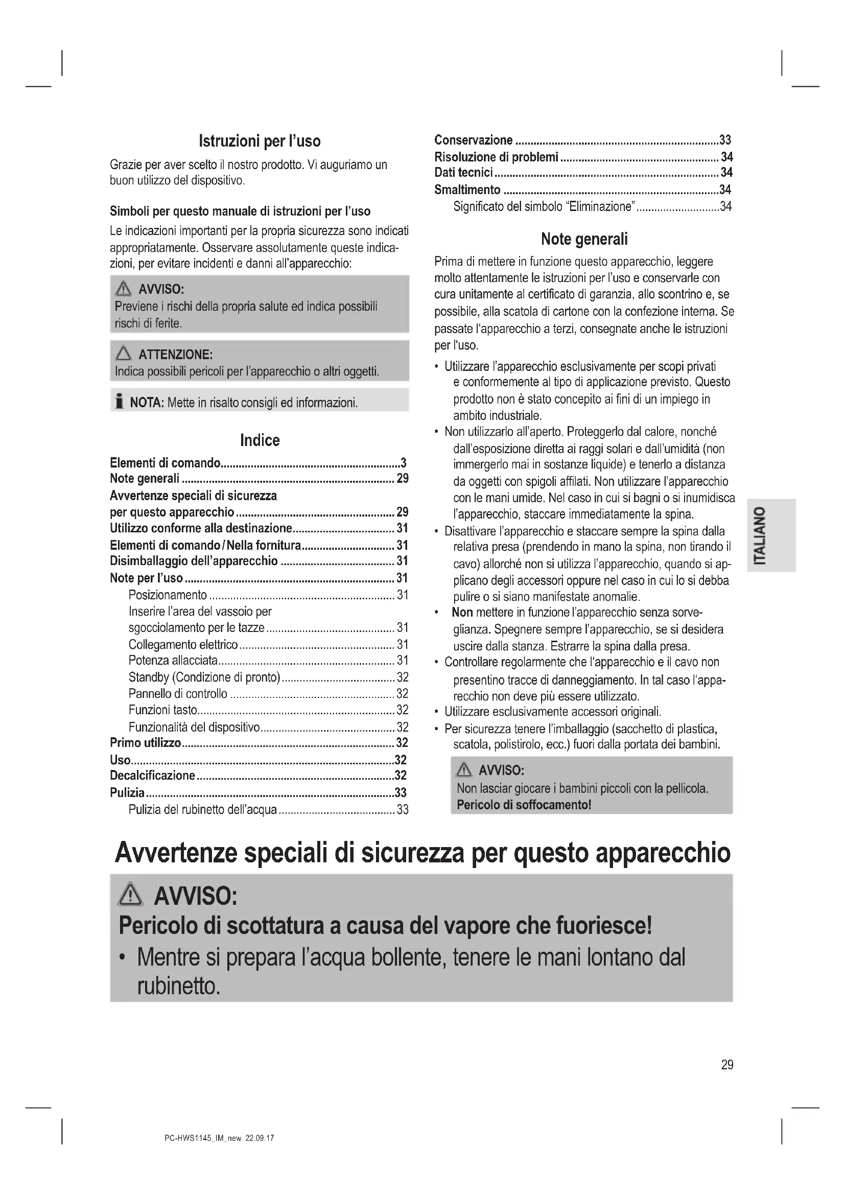 - Mentre si prepara l’acqua bollente, tenere le mani lontano dal rubinetto.30 PC-HWS1145_IM_new 22.09.17 AVVISO: Rischio di ustioni!