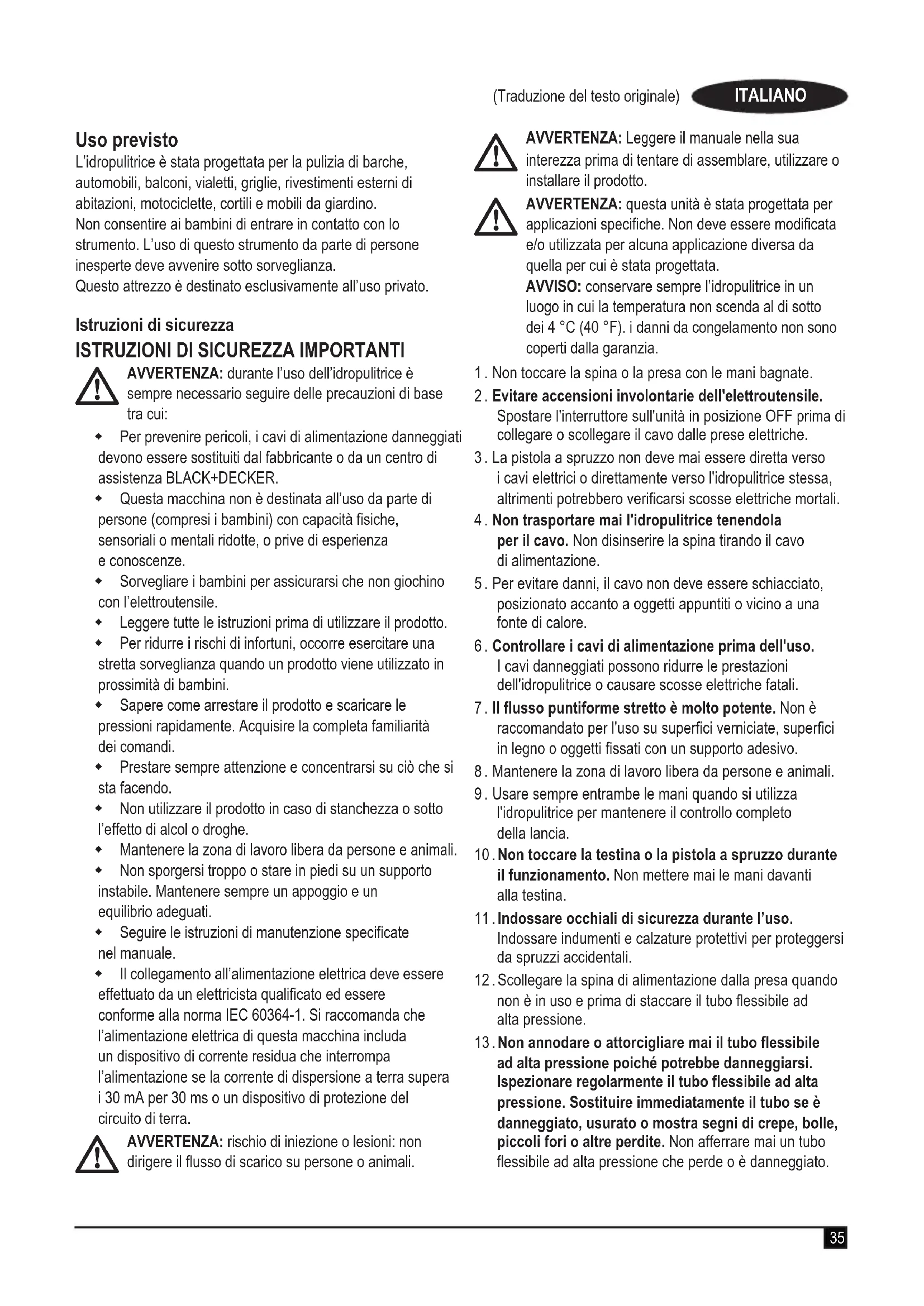 AVVERTENZA: durante l’uso dell’idropulitrice è sempre necessario seguire delle precauzioni di base tra cui: Per prevenire pericoli, i cavi di alimentazione danneggiati devono essere sostituiti dal fabbricante o da un centro di assistenza BLACK+DECKER. Questa macchina non è destinata all’uso da parte di persone (compresi i bambini) con capacità siche, sensoriali o mentali ridotte, o prive di esperienza e conoscenze. Sorvegliare i bambini per assicurarsi che non giochino con l’elettroutensile. Leggere tutte le istruzioni prima di utilizzare il prodotto. Per ridurre i rischi di infortuni, occorre esercitare una stretta sorveglianza quando un prodotto viene utilizzato in prossimità di bambini. Sapere come arrestare il prodotto e scaricare le pressioni rapidamente. Acquisire la completa familiarità dei comandi. Prestare sempre attenzione e concentrarsi su ciò che si sta facendo. Non utilizzare il prodotto in caso di stanchezza o sotto l’effetto di alcol o droghe. Mantenere la zona di lavoro libera da persone e animali. Non sporgersi troppo o stare in piedi su un supporto instabile. Mantenere sempre un appoggio e un equilibrio adeguati. Seguire le istruzioni di manutenzione specicate nel manuale. Il collegamento all’alimentazione elettrica deve essere effettuato da un elettricista qualicato ed essere conforme alla norma IEC 60364‑1. Si raccomanda che l’alimentazione elettrica di questa macchina includa un dispositivo di corrente residua che interrompa l’alimentazione se la corrente di dispersione a terra supera i 30 mA per 30 ms o un dispositivo di protezione del circuito di terra.