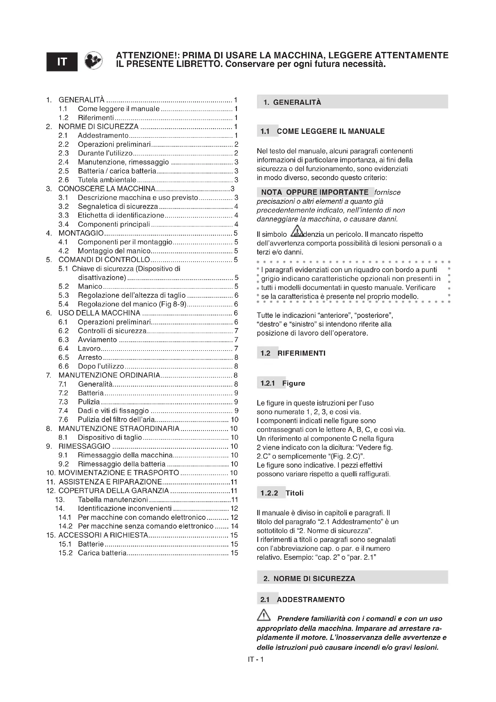 Intervento Periodicità Note MACCHINA Controllo di tutti i ssaggi Prima di ogni uso par. 7.4 Controlli di sicurezza / Verica dei comandi Prima di ogni uso par. 6.2IT - 12 Verica del dispositivo di taglio Prima di ogni uso par. 6.2.1 Verica dello stato di carica della batteria Prima di ogni uso * Ricarica della batteria Al termine di ogni uso par. 7.2.2 * Pulizia generale e controllo Al termine di ogni uso par. 7.3 Verica di eventuali danni presenti sulla macchina. Se necessario, contattare il centro di assistenza autorizzato. Al termine di ogni uso - Pulizia del ltro dell’aria Una volta al mese par. 7.6 Pulizia della trasmissione 1-2 volte all’anno par. 7.5 Sostituzione dispositivo di taglio - par. 8.1 *** Regolazione della trazione *** **
