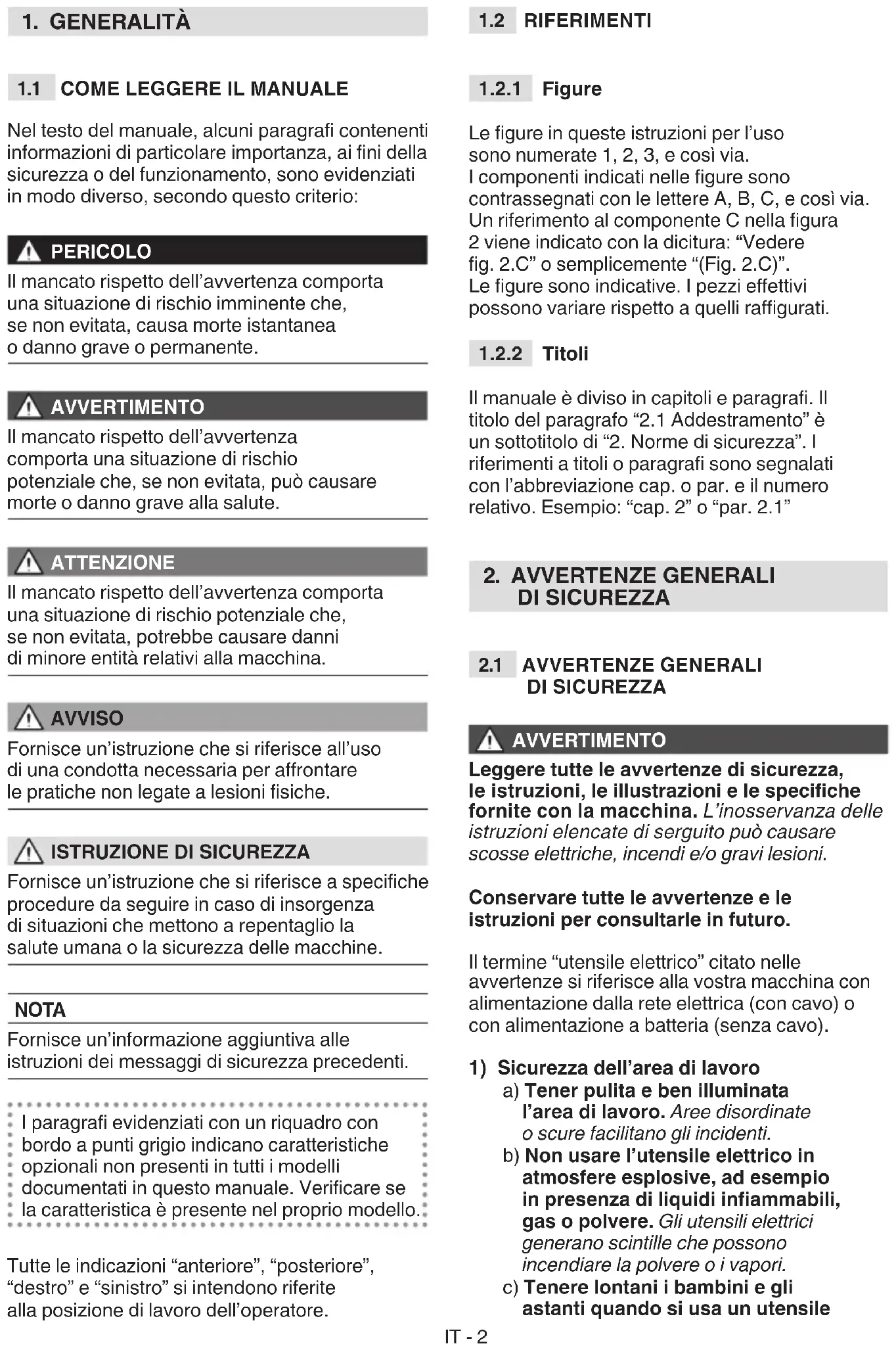 Il manuale è diviso in capitoli e paragra. Il titolo del paragrafo “2.1 Addestramento” è un sottotitolo di “2. Norme di sicurezza”. I riferimenti a titoli o paragra sono segnalati con l’abbreviazione cap. o par. e il numero relativo. Esempio: “cap. 2” o “par. 2.1”