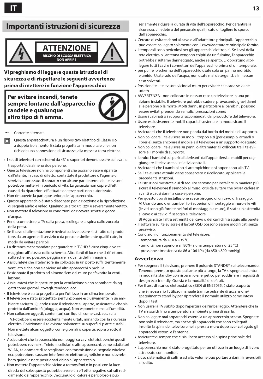 - AVVERTENZA - non collocare in nessun caso un televisore in una po- sizione instabile. Il televisore potrebbe cadere, provocando gravi danni alle persone o la morte. Molti danni, in particolare ai bambini, possono essere evitati prendendo semplici precauzioni come: