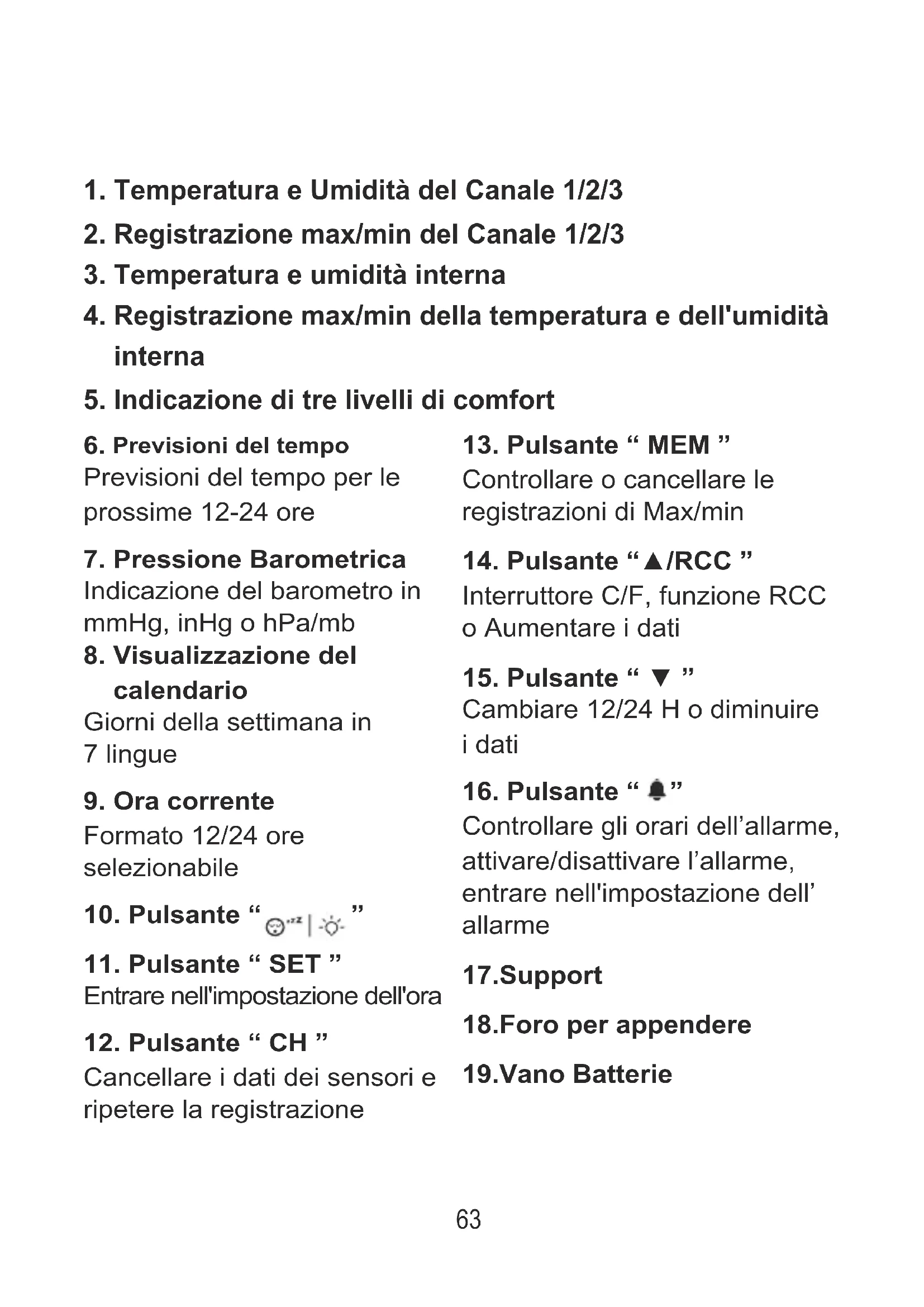 I seguenti articoli sono inclusi nella confezione: 1 x Unità principale della stazione meteo 3 x Sensori remoti 1 x adattatore CA 1 x Manuale utente 65INIZIO