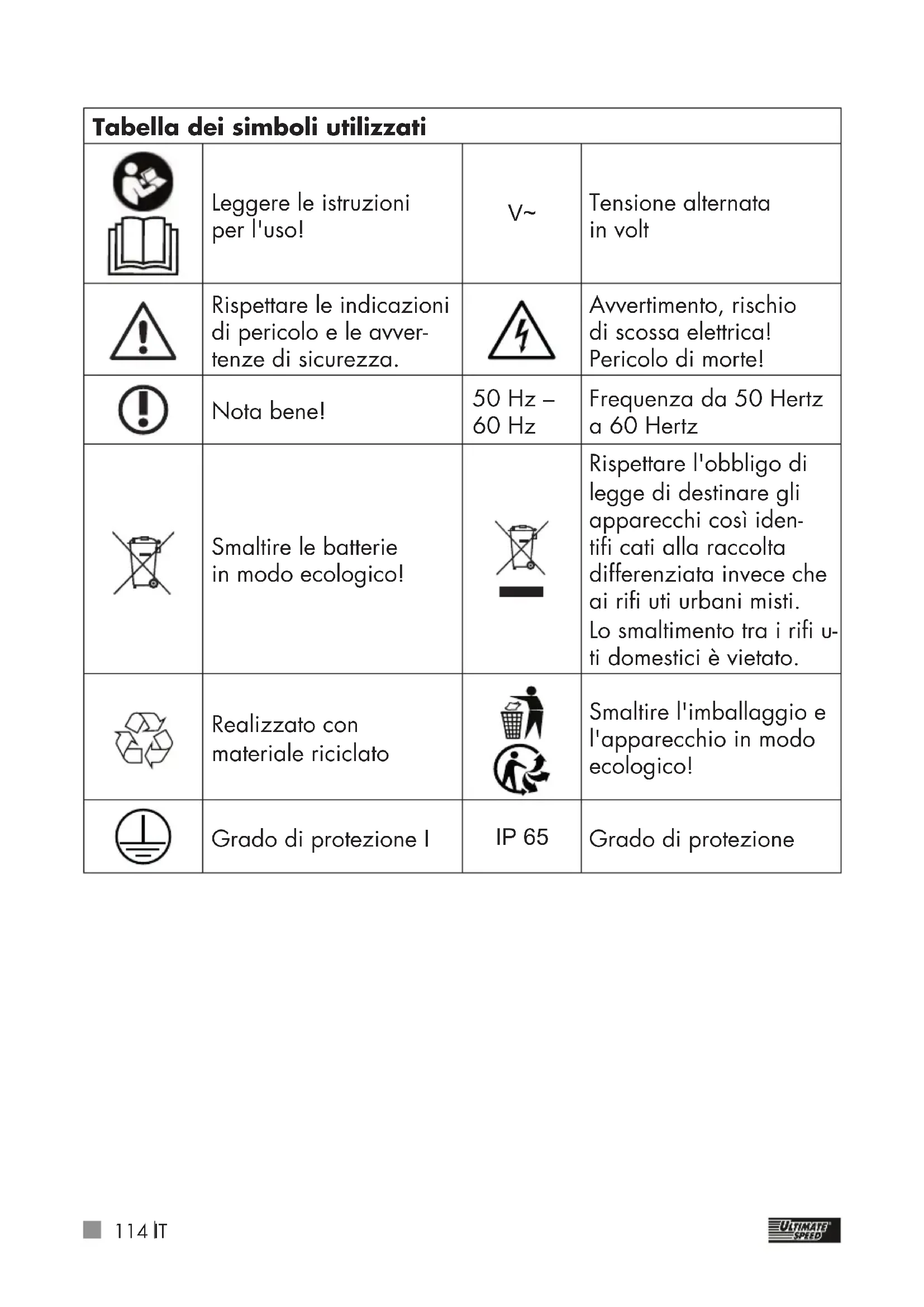 Tensione alternata in volt Rispettare le indicazioni di pericolo e le avver- tenze di sicurezza. Avvertimento, rischio di scossa elettrica! Pericolo di morte! Nota bene! 50 Hz – 60 Hz Frequenza da 50 Hertz a 60 Hertz Smaltire le batterie in modo ecologico! Rispettare l'obbligo di legge di destinare gli apparecchi così iden- tifi cati alla raccolta differenziata invece che ai rifi uti urbani misti. Lo smaltimento tra i rifi u- ti domestici è vietato. Realizzato con materiale riciclato Smaltire l'imballaggio e l'apparecchio in modo ecologico! Grado di protezione I IP 65 Grado di protezione115IT