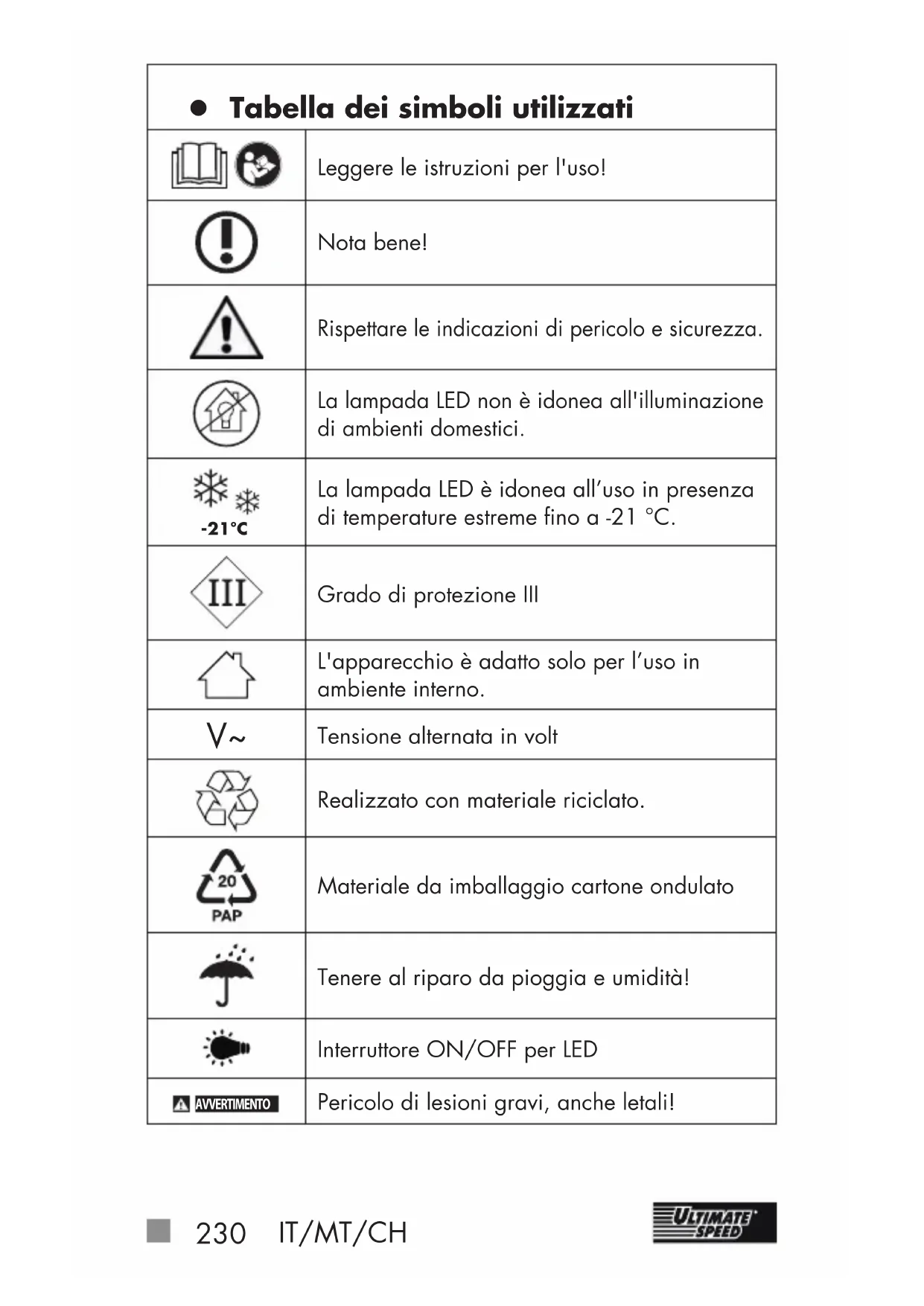 Tabella dei simboli utilizzati ............................ Pagina 230 Introduzione ...................................................... Pagina 231 Uso corretto .......................................................Pagina 232 Oggetto della fornitura ........................................ Pagina 232 Descrizione dei componenti ................................. Pagina 233 Specifiche tecniche ............................................. Pagina 234 Indicazioni di sicurezza generali .....................Pagina 235 Indicazioni di sicurezza specifiche ................... Pagina 239 Messa in funzione ............................................. Pagina 240 Controllare la capacità dell'Ausilio porta- tile per avviamento auto con Powerbank ................ Pagina 240 Carica dell'Ausilio portatile per avviamento auto con Powerbank .......................... Pagina 241 Utilizzo della funzione di ausilio per avviamento .... Pagina 242 Ricarica di cellulari e tablet ..................................Pagina 244 Utilizzare l'uscita da 12 V DC 8 A con l'adattatore per accendisigari............................... Pagina 245 Attivazione delle luci ........................................... Pagina 245 FAQ ..................................................................... Pagina 246 Eliminazione dei guasti .................................... Pagina 246 Pulizia ................................................................Pagina 247 Conservazione ................................................... Pagina 247 Indicazioni per l’ambiente e lo smaltimento .. Pagina 248 Dichiarazione di conformità UE originale .......Pagina 250 Indicazioni relative alla garanzia e al servizio di assistenza ................................... Pagina 251 Condizioni di garanzia ....................................... Pagina 251 Periodo di garanzia e diritti legali di rivendicazione divizi .......................................... Pagina 252 Garanzia...........................................................Pagina 252 Gestione dei casi di garanzia .............................. Pagina 253 Assistenza tecnica ............................................. Pagina 254230 IT/MT/CH z Tabella dei simboli utilizzati Leggere le istruzioni per l'uso! Nota bene! Rispettare le indicazioni di pericolo e sicurezza. La lampada LED non è idonea all'illuminazione di ambienti domestici. -21°C La lampada LED è idonea all’uso in presenza di temperature estreme fino a -21 °C. Grado di protezione III L'apparecchio è adatto solo per l’uso in ambiente interno.
