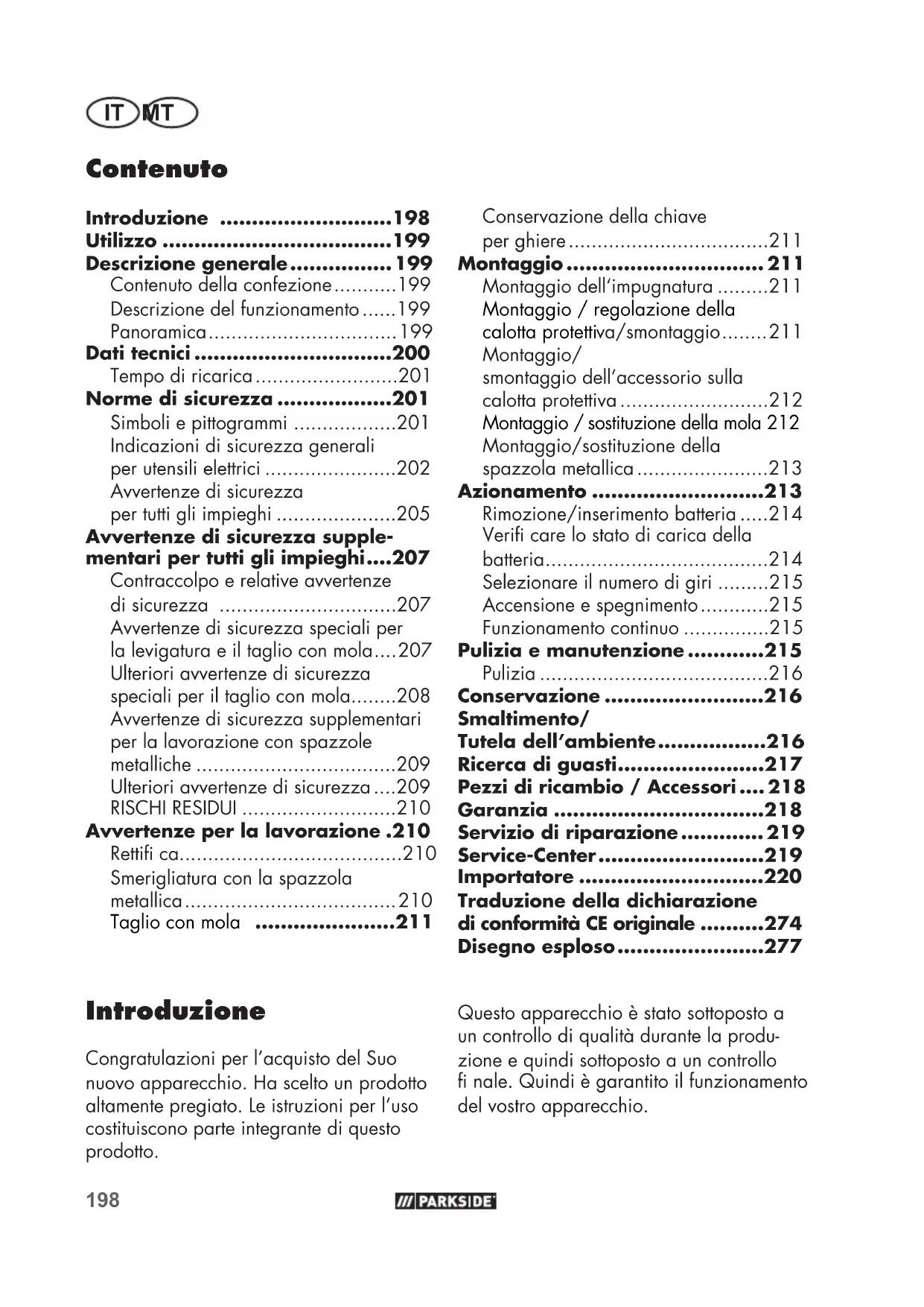 Servicio España Tel.:900984989 E-Mail: grizzly@lidl.es IAN 411383_2107 Importador Por favor, observe que la siguiente direc- ción no es una dirección de servicio. Contacteprimeramentealcentrode servicio mencionado arriba. Grizzly Tools GmbH & Co. KG Stockstädter Straße 20 63762 Großostheim Alemania www.grizzlytools.de198 IT MT Contenuto Introduzione ...........................198 Utilizzo ....................................199 Descrizione generale ................ 199 Contenutodellaconfezione ...........199 Descrizione del funzionamento ......199 Panoramica ................................. 199 Dati tecnici ...............................200 Tempodiricarica .........................201 Norme di sicurezza ..................201 Simboli e pittogrammi ..................201 Indicazioni di sicurezza generali per utensili elettrici .......................202 Avvertenze di sicurezza per tutti gli impieghi .....................205 Avvertenze di sicurezza supple- mentari per tutti gli impieghi ....207 Contraccolpoerelativeavvertenze di sicurezza ...............................207 Avvertenze di sicurezza speciali per la levigatura e il taglio con mola .... 207 Ulteriori avvertenze di sicurezza speciali per il taglio con mola ........208 Avvertenze di sicurezza supplementari per la lavorazione con spazzole metalliche ...................................209 Ulteriori avvertenze di sicurezza ....209 RISCHIRESIDUI ...........................210 Avvertenze per la lavorazione .210 Rettica.......................................210 Smerigliatura con la spazzola metallica ..................................... 210 Taglioconmola ......................211 Introduzione Congratulazioniperl’acquistodelSuo nuovo apparecchio. Ha scelto un prodotto altamente pregiato. Le istruzioni per l’uso costituiscono parte integrante di questo prodotto. Conservazionedellachiave per ghiere ...................................211 Montaggio ............................... 211 Montaggio dell‘impugnatura .........211 Montaggio / regolazione della calotta protetti va/smontaggio ........ 211 Montaggio/ smontaggio dell’accessorio sulla calotta protettiva ..........................212 Montaggio / sostituzione della mola 212 Montaggio/sostituzione della spazzola metallica .......................213 Azionamento ...........................213 Rimozione/inserimento batteria .....214 Vericarelostatodicaricadella batteria .......................................214 Selezionare il numero di giri .........215 Accensione e spegnimento ............215 Funzionamento continuo ...............215 Pulizia e manutenzione ............215 Pulizia ........................................216 Conservazione .........................216 Smaltimento/ Tutela dell’ambiente .................216 Ricerca di guasti .......................217 Pezzi di ricambio / Accessori .... 218 Garanzia .................................218 Servizio di riparazione ............. 219 Service-Center ..........................219 Importatore .............................220 Traduzione della dichiarazione di conformità CE originale ..........274 Disegno esploso .......................277 Questoapparecchioèstatosottopostoa uncontrollodiqualitàdurantelaprodu- zione e quindi sottoposto a un controllo nale.Quindiègarantitoilfunzionamento del vostro apparecchio.199 IT MT Contengonoindicazioniimportanti per la sicurezza, l’uso e lo smalti- mento. Prima dell’uso del prodotto, si raccomanda di familiarizzare con tutte le indicazioni di comando e di sicurezza. Usare il prodotto solo come descritto e per i campi d’impiegospecicati.Conservarele istruzioni in un luogo sicuro e conse- gnare la documentazione in caso di cessione del prodotto a terzi. Utilizzo Lasmerigliatriceangolareèunappa- recchio che serve a tagliare, levigare e sgrossare o spazzolare materiali di me- tallo, pietra e legno, plastica, piastrelle e metalli non ferrosi (metalli NE) senza l’uso di acqua. L‘apparecchiononèconcepitoperqualsia- si altro tipo di utilizzo (ad esempio la levi- gatura con utensili non adeguati, la leviga- tura con liquidi refrigeranti, la levigatura o il taglio di materiali nocivi come l‘amianto). È adatto all‘uso nell‘ambito di piccoli lavoridiriparazionedomestici.Nonè stato concepito per l‘impiego aziendale prolungato. L‘apparecchioèdestinatoall‘utilizzodaparte di adulti. I giovani sopra i 16 anni possono im- piegarlo solo sotto sorveglianza. Il produttore non si fa carico di eventuali danni causati da un uso improprio o da un azionamento errato. L’apparecchio fa parte della serie Parksi- deX20VTEAMefunzionamediantele batteriedellaserieParksideX20VTEAM. Le batterie possono essere caricate solo con i caricabatterie della serie Parkside X20VTEAM. Descrizione generale Le immagini si trovano sulle pagine pieghevoli anteriori e posteriori. Contenuto della confezione Rimuovere l’apparecchio dalla confezione e controllareseècompleto.Smaltireilmateri- ale di imballaggio secondo le disposizioni. - Smerigliatrice angolare ricaricabile - Impugnatura - Accessorio, calotta protettiva - Chiaveperghiere - Mola da taglio - Istruzioni per l’uso Batteria e caricabatteria non compresi nella confezione. Descrizione del funzionamento La smerigliatrice angolare serve a tagliare, levigare e sgrossare o spazzolare mate- riali di metallo, pietra e legno, plastica, piastrelle e metalli non ferrosi (metalli NE) senza l‘uso di acqua. Per i singoli impieghi sono previste mole speciali. Prestare atten- zione alle indicazioni del produttore delle mole. La seguente descrizione illustra il funziona- mento dei componenti. Panoramica 1 Impugnatura 2 Filettatura per l’impugnatura 3 Interruttore On/Off 4 Tastidisbloccaggiobatteria 5 Batteria 6 Regolatore del numero di giri 7 Calottaprotettiva 8 Mola da taglio200 IT MT 9 Tastodiarrestodelmandrino 10 Chiaveperghiere 11 Accessorio, calotta protettiva 12 Flangia di supporto 13 Dado di bloccaggio 14 Mandrino di supporto 15 Mola 16 Vite 17 Dis