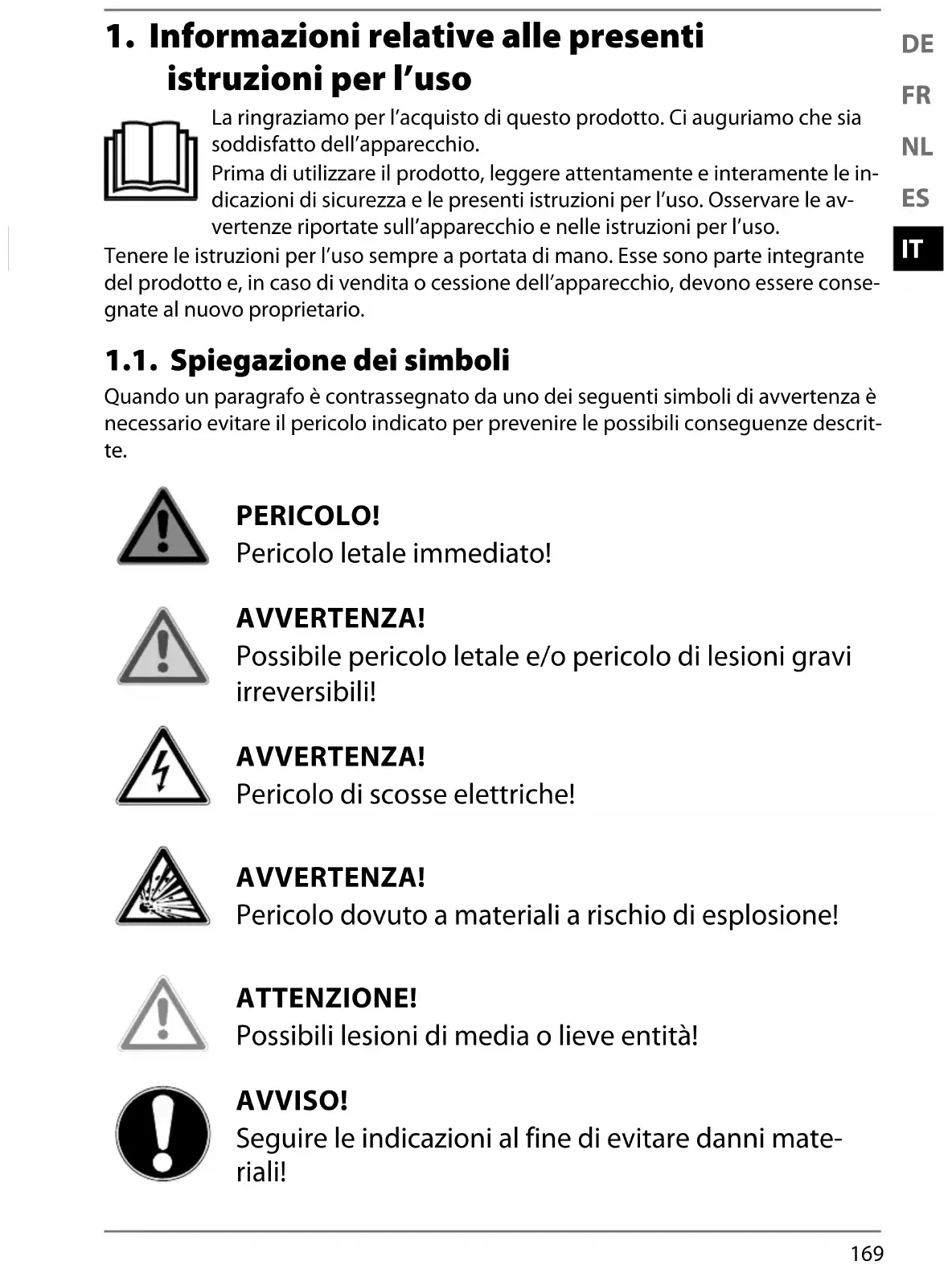 istruzioni per l’uso La ringraziamo per l’acquisto di questo prodotto. Ci auguriamo che sia soddisfatto dell’apparecchio. Prima di utilizzare il prodotto, leggere attentamente e interamente le in- dicazioni di sicurezza e le presenti istruzioni per l’uso. Osservare le av- vertenze riportate sull’apparecchio e nelle istruzioni per l’uso. Tenere le istruzioni per l’uso sempre a portata di mano. Esse sono parte integrante del prodotto e, in caso di vendita o cessione dell’apparecchio, devono essere conse- gnate al nuovo proprietario. 1.1. Spiegazione dei simboli Quando un paragrafo è contrassegnato da uno dei seguenti simboli di avvertenza è necessario evitare il pericolo indicato per prevenire le possibili conseguenze descrit- te. PERICOLO! Pericolo letale immediato! AVVERTENZA! Possibile pericolo letale e/o pericolo di lesioni gravi irreversibili! AVVERTENZA! Pericolo di scosse elettriche! AVVERTENZA! Pericolo dovuto a materiali a rischio di esplosione! ATTENZIONE! Possibili lesioni di media o lieve entità! AVVISO! Seguire le indicazioni al fine di evitare danni mate- riali!170 Ulteriori informazioni sull’utilizzo dell’apparecchio! Osservare le indicazioni contenute nelle istruzioni per l’uso!