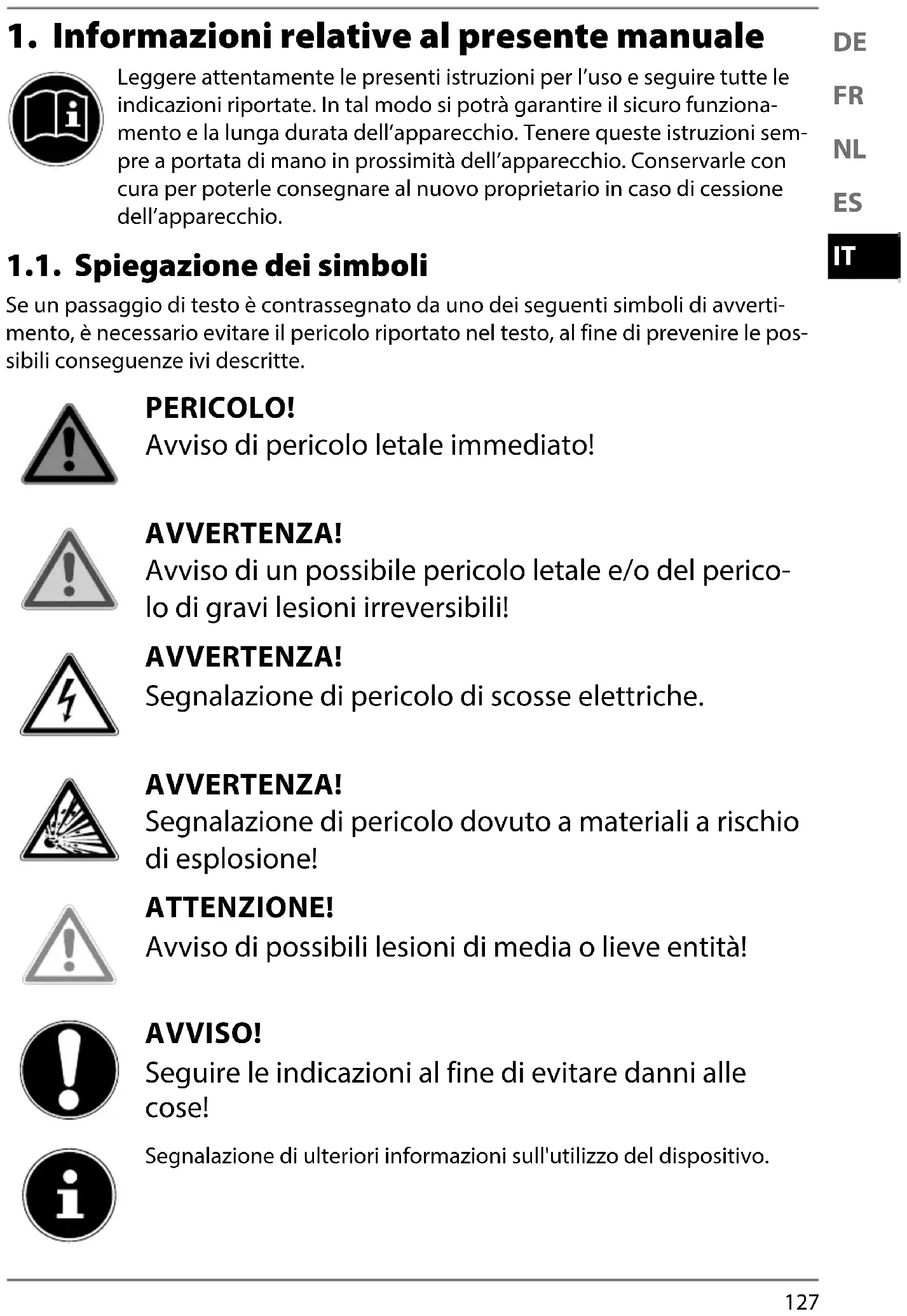 Leggere attentamente le presenti istruzioni per l’uso e seguire tutte le indicazioni riportate. In tal modo si potrà garantire il sicuro funziona- mento e la lunga durata dell’apparecchio. Tenere queste istruzioni sem- pre a portata di mano in prossimità dell’apparecchio. Conservarle con cura per poterle consegnare al nuovo proprietario in caso di cessione dell’apparecchio. 1.1. Spiegazione dei simboli Se un passaggio di testo è contrassegnato da uno dei seguenti simboli di avverti- mento, è necessario evitare il pericolo riportato nel testo, al fine di prevenire le pos- sibili conseguenze ivi descritte. PERICOLO! Avviso di pericolo letale immediato! AVVERTENZA! Avviso di un possibile pericolo letale e/o del perico- lo di gravi lesioni irreversibili! AVVERTENZA! Segnalazione di pericolo di scosse elettriche. AVVERTENZA! Segnalazione di pericolo dovuto a materiali a rischio di esplosione! ATTENZIONE! Avviso di possibili lesioni di media o lieve entità! AVVISO! Seguire le indicazioni al fine di evitare danni alle cose! Segnalazione di ulteriori informazioni sull'utilizzo del dispositivo.128 AVVISO! Osservare gli avvisi nelle istruzioni per l'uso.