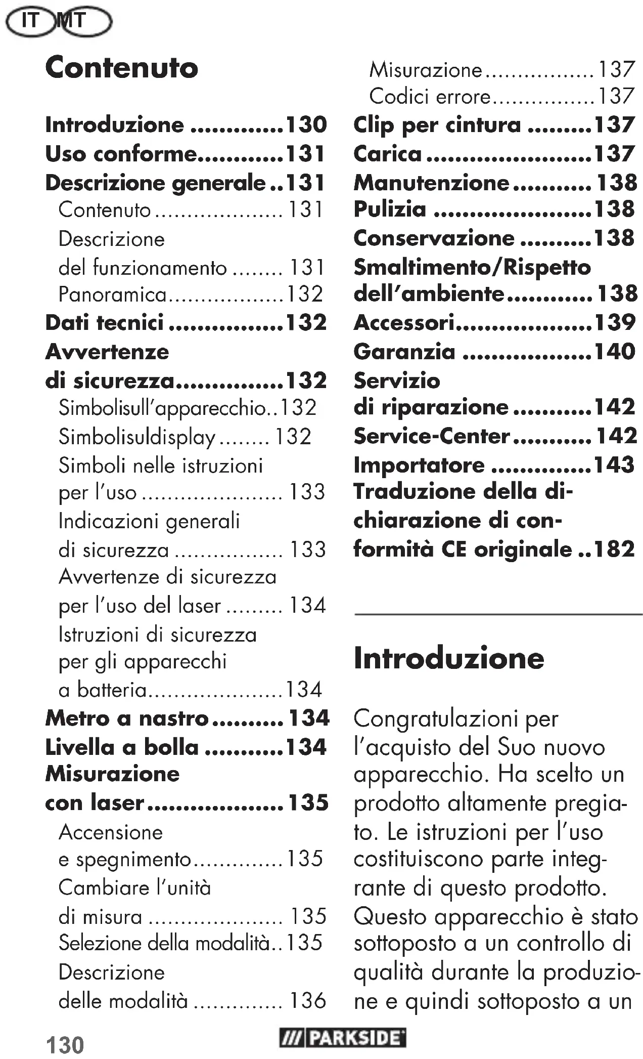 - Importatore Introduzione Congratulazioni per l’acquisto del Suo nuovo apparecchio. Ha scelto un prodotto altamente pregia- to. Le istruzioni per l’uso costituiscono parte integ- rante di questo prodotto. Questo apparecchio è stato sottoposto a un controllo di qualità durante la produzio- ne e quindi sottoposto a un131 MTIT controllo nale. Quindi è garantito il funzionamento del vostro apparecchio. Contengono indicazio- ni importanti per la sicurezza, l’uso e lo smalti- mento. Prima dell’uso del prodotto, si raccomanda di familiarizzare con tutte le indicazioni di comando e di sicurezza. Usare il prodotto solo come descritto e per i campi d’impiego specicati. Conservare le istruzioni in un luogo sicuro e consegnare la documentazione in caso di cessione del prodotto a terzi. Uso conforme Il metro a nastro con laser e livella è progettato per misurare le distanze. L’apparecchio è destinato all’utilizzo da parte di adulti. L’utente o operatore è respon- sabile di eventuali incidenti o danni ad altre persone o alla loro proprietà. Il produttore non è responsabile dei danni causati da un uso improprio o da una manipolazione scorretta. L’apparecchio non è destinato ad un uso commer- ciale. Un eventuale utilizzo commerciale comporta l’estinzione della garanzia. Il dispositivo è idoneo per l’uso esclusivamente in luoghi chiusi. Descrizione generale Sulla pagina ripiegabile sono presenti le immagini. Contenuto Estrarre l’apparecchio dall’imballaggio e vericar- ne l’integrità. - Misuratore al laser con metro - Cavo di carica USB-C - Istruzioni per l’uso Smaltire il materiale di imballaggio ai sensi della normativa vigente. Descrizione del funzionamento La seguente descrizione illustra il funzionamento dei componenti.132 IT MT Panoramica 1 Livella 2 Display 3 Pulsante “Mode” 4 Pulsante “Laser” 5 Clip per cintura 6 Presa di carica 7 Cavo di carica USB-C 8 Connettore USB 9 Connettore USB-C 10 Metro a nastro 11 Tasto di sblocco 12 Foro di uscita del laser Dati tecnici Metro ricaricabile PLMB 4 B1 Tensione operativa p. 143