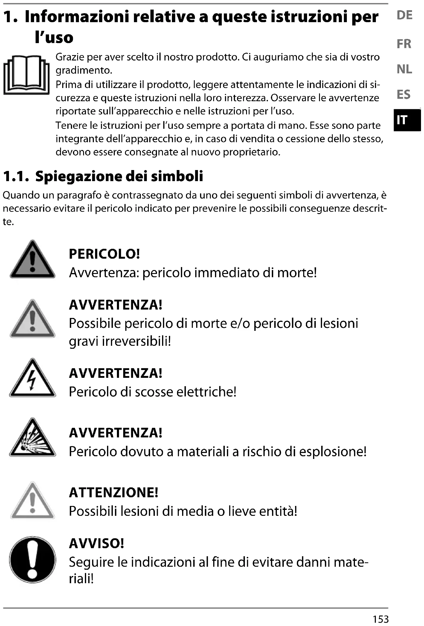 l’uso Grazie per aver scelto il nostro prodotto. Ci auguriamo che sia di vostro gradimento. Prima di utilizzare il prodotto, leggere attentamente le indicazioni di si- curezza e queste istruzioni nella loro interezza. Osservare le avvertenze riportate sull’apparecchio e nelle istruzioni per l’uso. Tenere le istruzioni per l’uso sempre a portata di mano. Esse sono parte integrante dell’apparecchio e, in caso di vendita o cessione dello stesso, devono essere consegnate al nuovo proprietario. 1.1. Spiegazione dei simboli Quando un paragrafo è contrassegnato da uno dei seguenti simboli di avvertenza, è necessario evitare il pericolo indicato per prevenire le possibili conseguenze descrit- te. PERICOLO! Avvertenza: pericolo immediato di morte! AVVERTENZA! Possibile pericolo di morte e/o pericolo di lesioni gravi irreversibili! AVVERTENZA! Pericolo di scosse elettriche! AVVERTENZA! Pericolo dovuto a materiali a rischio di esplosione! ATTENZIONE! Possibili lesioni di media o lieve entità! AVVISO! Seguire le indicazioni al fine di evitare danni mate- riali! 19305 ML Int.Sales 5007 0905 Content Final_rev2.indb 15319305 ML Int.Sales 5007 0905 Content Final_rev2.indb 153 11.04.2022 13:17:0011.04.2022 13:17:00154 Ulteriori informazioni sull’uso dell’apparecchio! Attenersi alle indicazioni contenute nelle istruzioni per l’uso!