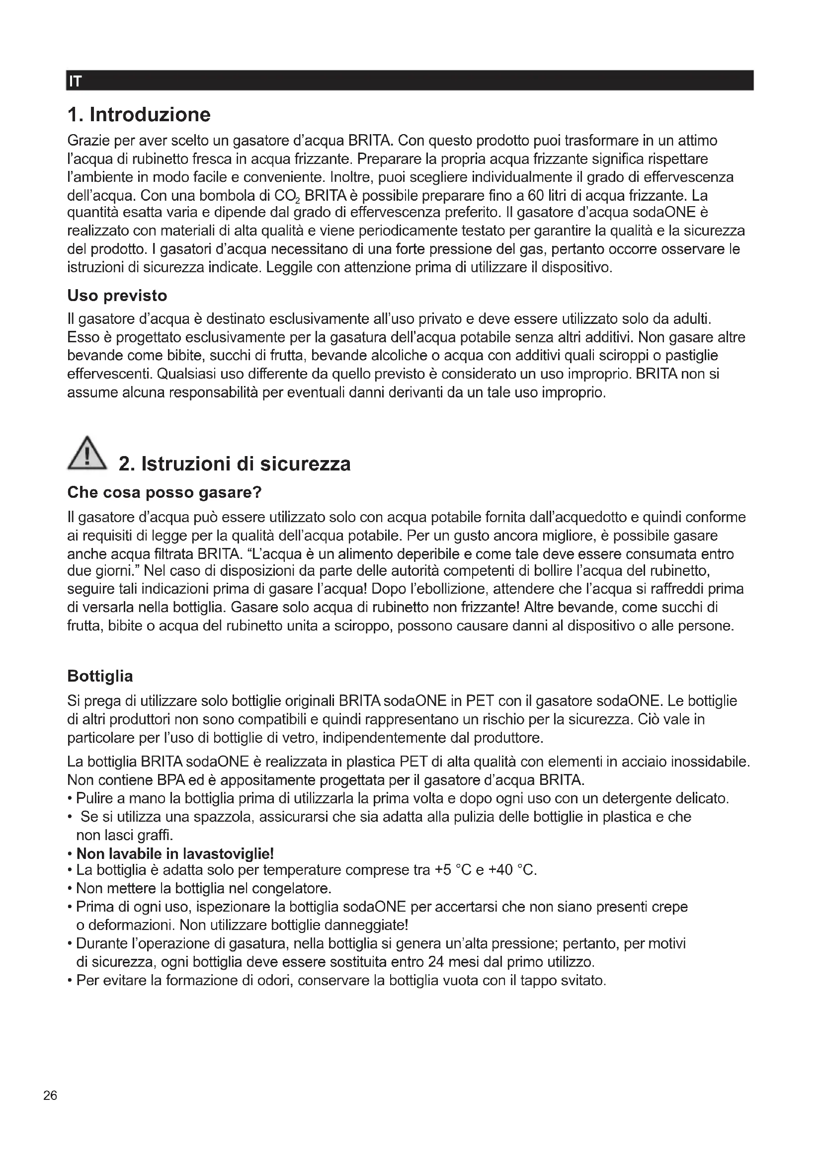 BRITA è possibile preparare fino a 60 litri di acqua frizzante. La quantità esatta varia e dipende dal grado di effervescenza preferito. Il gasatore d’acqua sodaONE è realizzato con materiali di alta qualità e viene periodicamente testato per garantire la qualità e la sicurezza del prodotto. I gasatori d’acqua necessitano di una forte pressione del gas, pertanto occorre osservare le istruzioni di sicurezza indicate. Leggile con attenzione prima di utilizzare il dispositivo. Uso previsto Il gasatore d’acqua è destinato esclusivamente all’uso privato e deve essere utilizzato solo da adulti. Esso è progettato esclusivamente per la gasatura dell’acqua potabile senza altri additivi. Non gasare altre bevande come bibite, succhi di frutta, bevande alcoliche o acqua con additivi quali sciroppi o pastiglie effervescenti. Qualsiasi uso differente da quello previsto è considerato un uso improprio. BRITA non si assume alcuna responsabilità per eventuali danni derivanti da un tale uso improprio.