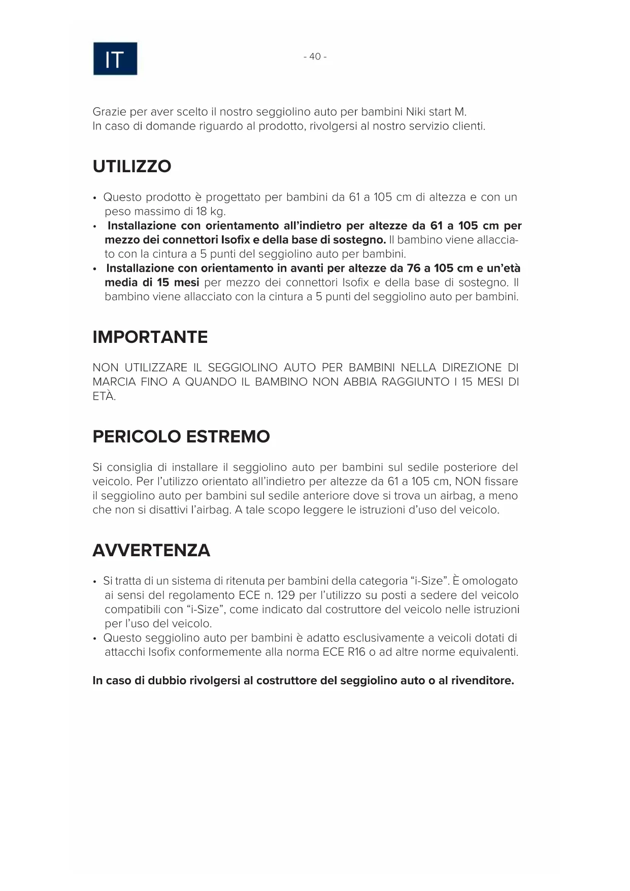 Grazie per aver scelto il nostro seggiolino auto per bambini Niki start M. In caso di domande riguardo al prodotto, rivolgersi al nostro servizio clienti. UTILIZZO