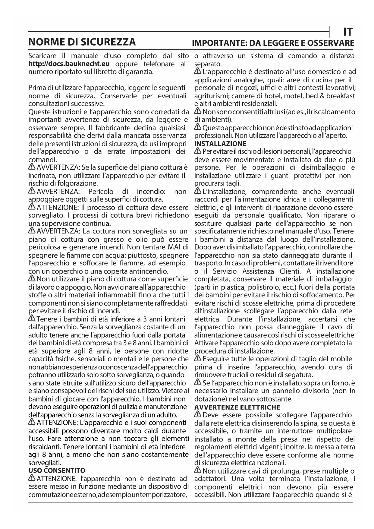 Scaricare il manuale d’uso completo dal sito http://docs.bauknecht.eu oppure telefonare al numero riportato sul libretto di garanzia. Prima di utilizzare l’apparecchio, leggere le seguenti norme di sicurezza. Conservarle per eventuali consultazioni successive. Queste istruzioni e l’apparecchio sono corredati da importanti avvertenze di sicurezza, da leggere e osservare sempre. Il fabbricante declina qualsiasi responsabilità che derivi dalla mancata osservanza delle presenti istruzioni di sicurezza, da usi impropri dell’apparecchio o da errate impostazioni dei comandi. AVVERTENZA: Se la supercie del piano cottura è incrinata, non utilizzare l’apparecchio per evitare il rischio di folgorazione. AVVERTENZA: Pericolo di incendio: non appoggiare oggetti sulle superci di cottura. ATTENZIONE: Il processo di cottura deve essere sorvegliato. I processi di cottura brevi richiedono una supervisione continua. AVVERTENZA: La cottura non sorvegliata su un piano di cottura con grasso e olio può essere pericolosa e generare incendi. Non tentare MAI di spegnere le amme con acqua: piuttosto, spegnere l’apparecchio e soocare le amme, ad esempio con un coperchio o una coperta antincendio. Non utilizzare il piano di cottura come supercie di lavoro o appoggio. Non avvicinare all’apparecchio stoe o altri materiali inammabili no a che tutti i componenti non si siano completamente rareddati per evitare il rischio di incendi. Tenere i bambini di età inferiore a 3 anni lontani dall’apparecchio. Senza la sorveglianza costante di un adulto tenere anche l’apparecchio fuori dalla portata dei bambini di età compresa tra 3 e 8 anni. I bambini di età superiore agli 8 anni, le persone con ridotte capacità siche, sensoriali o mentali e le persone che non abbiano esperienza o conoscenza dell’apparecchio potranno utilizzarlo solo sotto sorveglianza, o quando siano state istruite sull’utilizzo sicuro dell’apparecchio e siano consapevoli dei rischi del suo utilizzo. Vietare ai bambini di giocare con l’apparecchio. I bambini non devono eseguire operazioni di pulizia e manutenzione dell’apparecchio senza la sorveglianza di un adulto. ATTENZIONE: L’apparecchio e i suoi componenti accessibili possono diventare molto caldi durante l’uso. Fare attenzione a non toccare gli elementi riscaldanti. Tenere lontani i bambini di età inferiore agli 8 anni, a meno che non siano costantemente sorvegliati. USO CONSENTITO ATTENZIONE: l’apparecchio non è destinato ad essere messo in funzione mediante un dispositivo di commutazione esterno, ad esempio un temporiz zatore, o attraverso un sistema di comando a distanza separato. L’apparecchio è destinato all’uso domestico e ad applicazioni analoghe, quali: aree di cucina per il personale di negozi, uci e altri contesti lavorativi; agriturismi; camere di hotel, motel, bed & breakfast e altri ambienti residenziali. Non sono consentiti altri usi (ad es., il riscaldamento di ambienti). Questo apparecchio non è destinato ad applicazioni professionali. Non utilizzare l’apparecchio all’aperto. INSTALLAZIONE Per evitare il rischio di lesioni personali, l’apparecchio deve essere movimentato e installato da due o più persone. Per le operazioni di disimballaggio e installazione utilizzare i guanti protettivi per non procurarsi tagli. L’installazione, comprendente anche eventuali raccordi per l’alimentazione idrica e i collegamenti elettrici, e gli interventi di riparazione devono essere eseguiti da personale qualicato. Non riparare o sostituire qualsiasi parte dell’apparecchio se non specicatamente richiesto nel manuale d’uso. Tenere i bambini a distanza dal luogo dell’installazione. Dopo aver disimballato l’apparecchio, controllare che l’apparecchio non sia stato danneggiato durante il trasporto. In caso di problemi, contattare il rivenditore o il Servizio Assistenza Clienti. A installazione completata, conservare il materiale di imballaggio (parti in plastica, polistirolo, ecc.) fuori della portata dei bambini per evitare il rischio di soocamento. Per evitare rischi di scosse elettriche, prima di procedere all’installazione scollegare l’apparecchio dalla rete elettrica. Durante l’installazione, accertarsi che l’apparecchio non possa danneggiare il cavo di alimentazione e causare così rischi di scosse elettriche. Attivare l’apparecchio solo dopo avere completato la procedura di installazione. Eseguire tutte le operazioni di taglio del mobile prima di inserire l’apparecchio, avendo cura di rimuovere trucioli o residui di segatura. Se l’apparecchio non è installato sopra un forno, è necessario installare un pannello divisorio (non in dotazione) nel vano sottostante. AVVERTENZE ELETTRICHE Deve essere possibile scollegare l’apparecchio dalla rete elettrica disinserendo la spina, se questa è accessibile, o tramite un interruttore multipolare installato a monte della presa nel rispetto dei regolamenti elettrici vigenti; inoltre, la messa a terra dell’apparecchio deve essere conforme alle norme di sicurezza elettrica nazionali. Non utilizzare cavi di prolunga, prese multiple o adattatori. Una volta terminata l’installazione, i componenti elettrici non devono più essere accessibili. Non utilizzare l’apparecchio quando si è