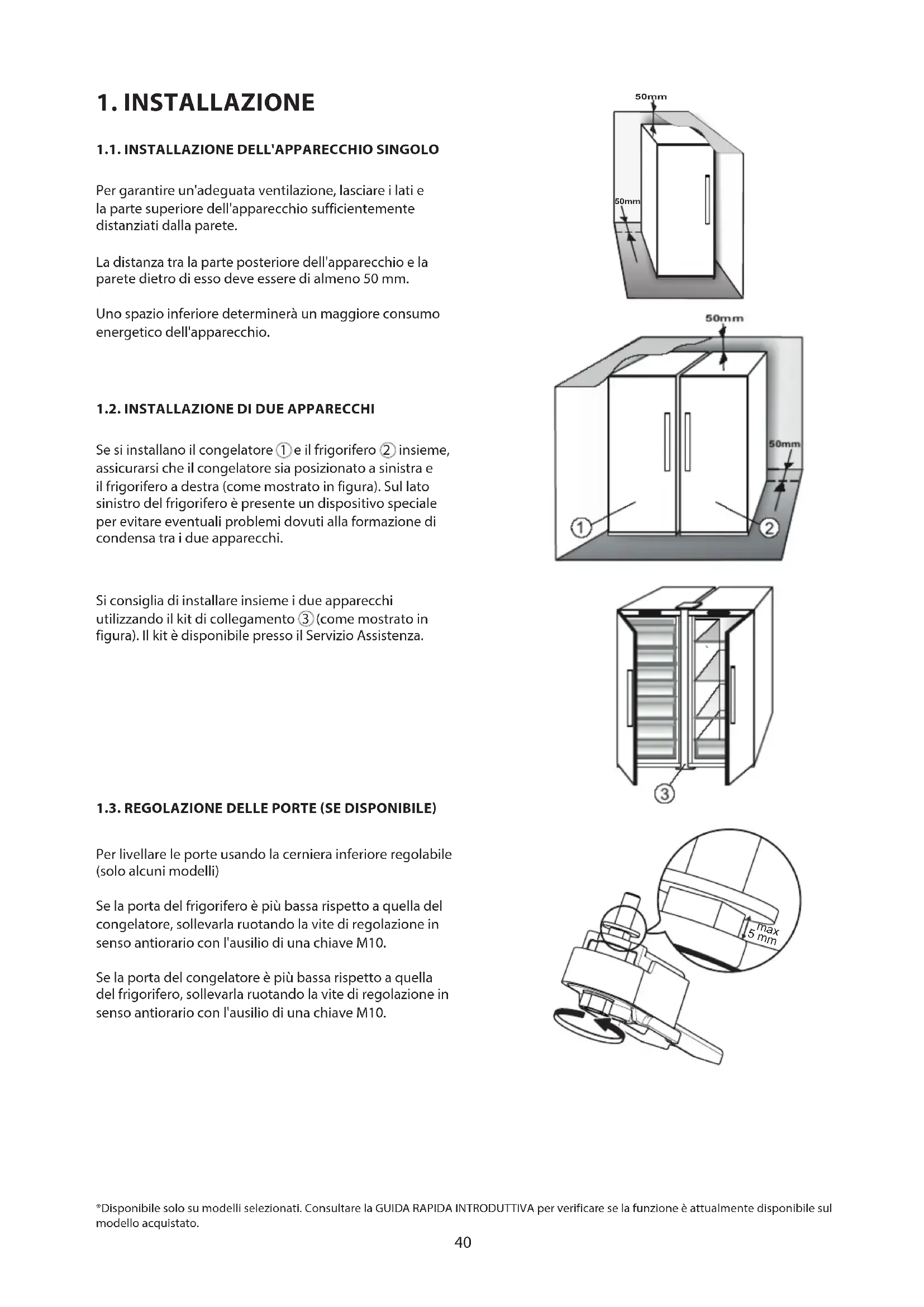(come mostrato in figura). Il kit è disponibile presso il Servizio Assistenza. 1.3. REGOLAZIONE DELLE PORTE (SE DISPONIBILE) Per livellare le porte usando la cerniera inferiore regolabile (solo alcuni modelli) Se la porta del frigorifero è più bassa rispetto a quella del congelatore, sollevarla ruotando la vite di regolazione in senso antiorario con l'ausilio di una chiave M10. Se la porta del congelatore è più bassa rispetto a quella del frigorifero, sollevarla ruotando la vite di regolazione in senso antiorario con l'ausilio di una chiave M10. *Disponibile solo su modelli selezionati. Consultare la GUIDA RAPIDA INTRODUTTIVA per verificare se la funzione è attualmente disponibile sul modello acquistato. 50mm 50mm 5 mm max41