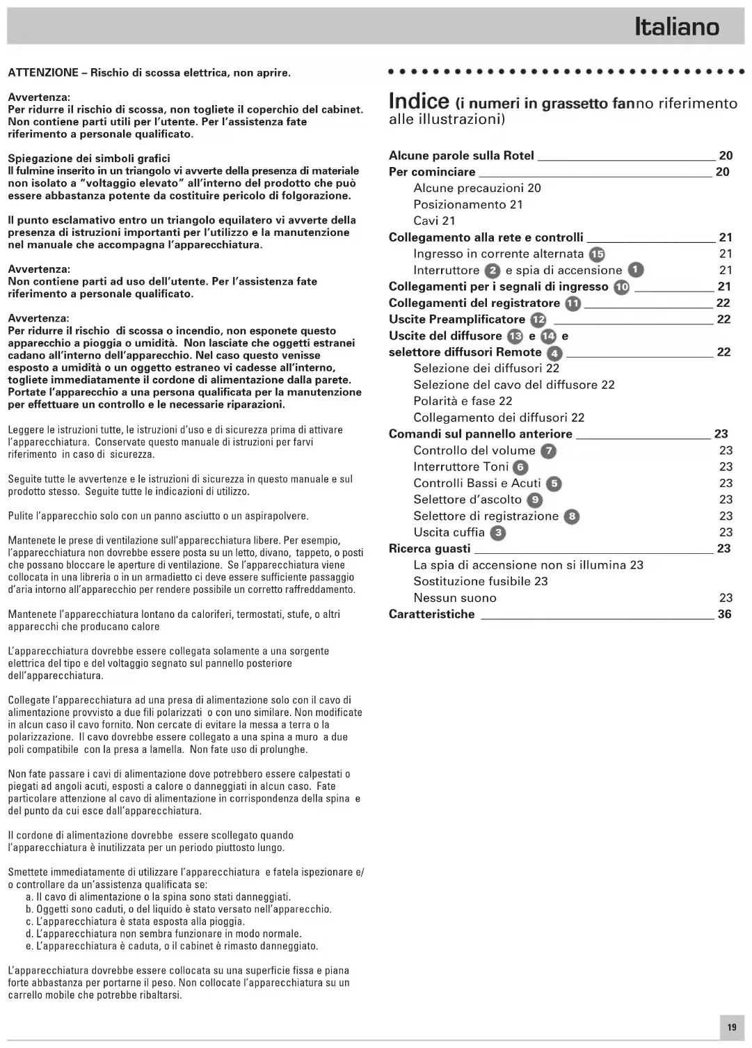 Italiano ○○○○○○○○○○○○○○○○○○○○○○○○○○○○○○○○○ Indice (i numeri in grassetto fanno riferimento alle illustrazioni) Alcune parole sulla Rotel _____________________________ 20 Per cominciare ______________________________________ 20 Alcune precauzioni 20 Posizionamento 21 Cavi 21 Collegamento alla rete e controlli _____________________ 21 Ingresso in corrente alternata
