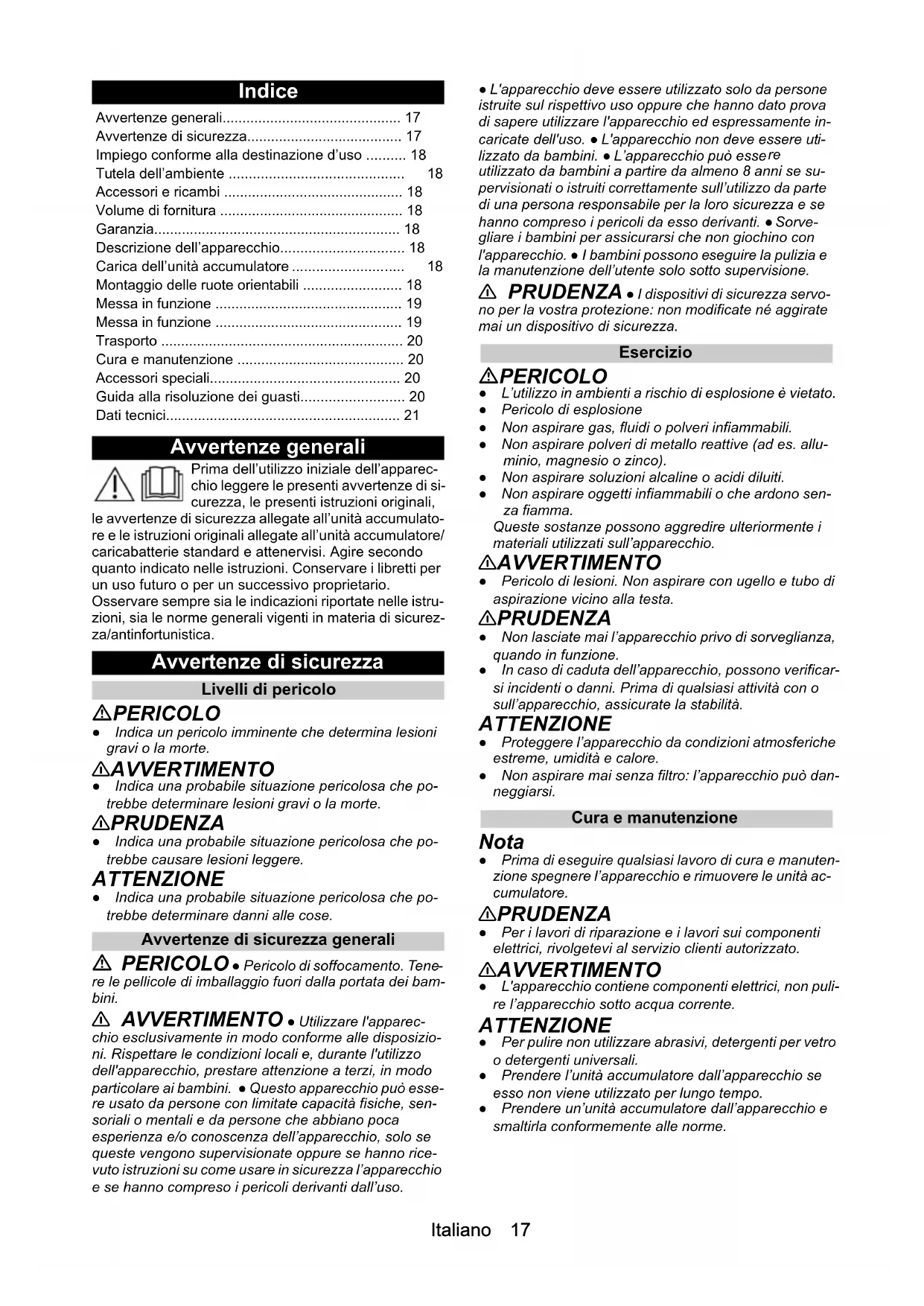 - utilizzato da bambini a partire da almeno 8 anni se su- pervisionati o istruiti correttamente sull’utilizzo da parte di una persona responsabile per la loro sicurezza e se hanno compreso i pericoli da esso derivanti. ● Sorve- gliare i bambini per assicurarsi che non giochino con l'apparecchio. ● I bambini possono eseguire la pulizia e la manutenzione dell’utente solo sotto supervisione. 몇 PRUDENZA ● I dispositivi di sicurezza servo- no per la vostra protezione: non modificate né aggirate mai un dispositivo di sicurezza. Esercizio PERICOLO ● L’utilizzo in ambienti a rischio di esplosione è vietato. ● Pericolo di esplosione ● Non aspirare gas, fluidi o polveri infiammabili. ● Non aspirare polveri di metallo reattive (ad es. allu- minio, magnesio o zinco). ● Non aspirare soluzioni alcaline o acidi diluiti. ● Non aspirare oggetti infiammabili o che ardono sen- za fiamma. Queste sostanze possono aggredire ulteriormente i materiali utilizzati sull’apparecchio. 몇 AVVERTIMENTO ● Pericolo di lesioni. Non aspirare con ugello e tubo di aspirazione vicino alla testa. 몇 PRUDENZA ● Non lasciate mai l’apparecchio privo di sorveglianza, quando in funzione. ● In caso di caduta dell’apparecchio, possono verificar- si incidenti o danni. Prima di qualsiasi attività con o sull’apparecchio, assicurate la stabilità. ATTENZIONE ● Proteggere l’apparecchio da condizioni atmosferiche estreme, umidità e calore. ● Non aspirare mai senza filtro: l’apparecchio può dan- neggiarsi. Cura e manutenzione Nota ● Prima di eseguire qualsiasi lavoro di cura e manuten- zione spegnere l’apparecchio e rimuovere le unità ac- cumulatore. 몇 PRUDENZA ● Per i lavori di riparazione e i lavori sui componenti elettrici, rivolgetevi al servizio clienti autorizzato. 몇 AVVERTIMENTO ● L'apparecchio contiene componenti elettrici, non puli- re l’apparecchio sotto acqua corrente. ATTENZIONE ● Per pulire non utilizzare abrasivi, detergenti per vetro o detergenti universali. ● Prendere l’unità accumulatore dall’apparecchio se esso non viene utilizzato per lungo tempo. ● Prendere un’unità accumulatore dall’apparecchio e smaltirla conformemente alle norme. Avvertenze generali p. 17