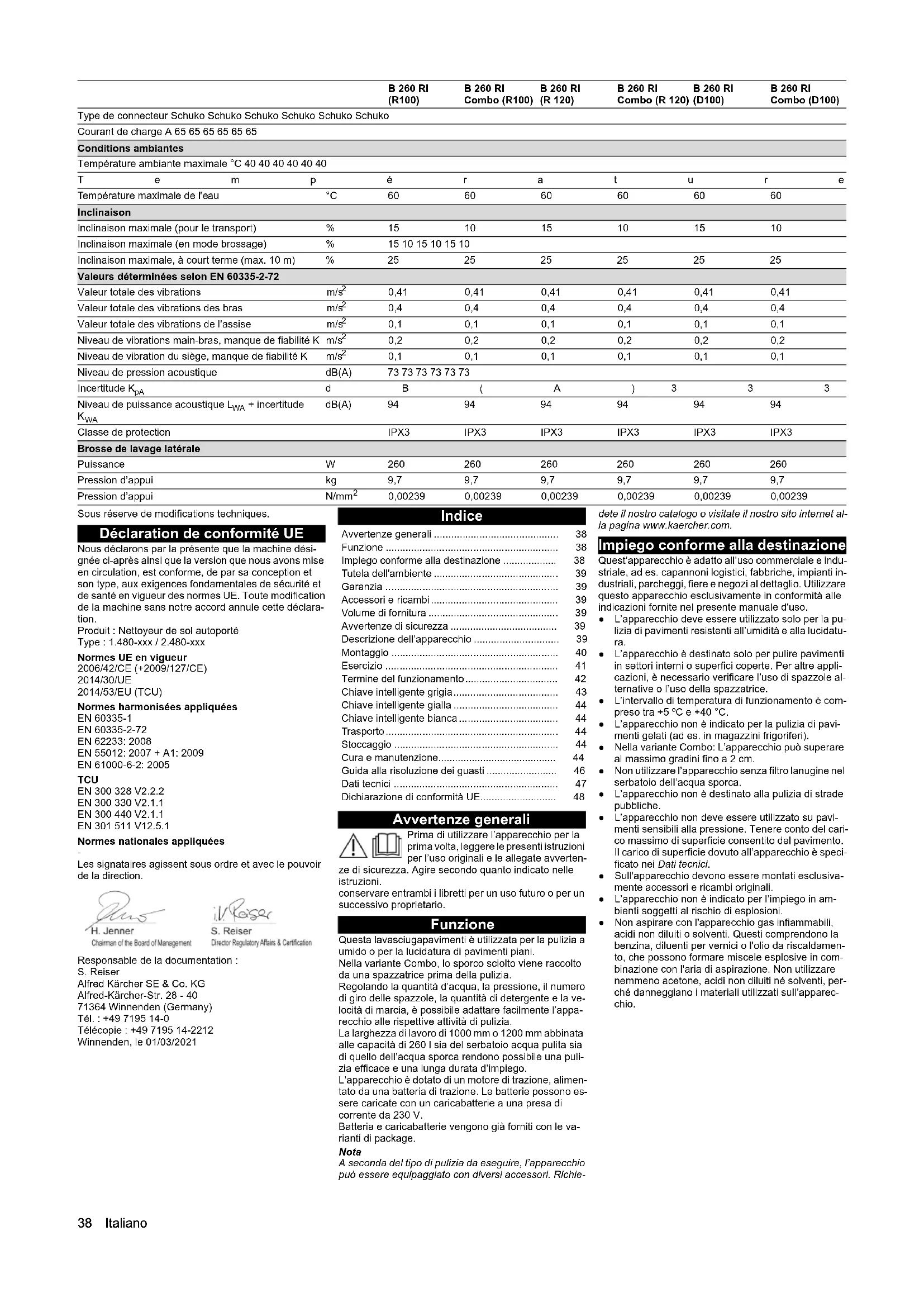 Les signataires agissent sous ordre et avec le pouvoir de la direction. Responsable de la documentation : S. Reiser Alfred Kärcher SE & Co. KG Alfred-Kärcher-Str. 28 - 40 71364 Winnenden (Germany) Tél. : +49 7195 14-0 Télécopie : +49 7195 14-2212 Winnenden, le 01/03/2021 Indice Avvertenze generali Prima di utilizzare l’apparecchio per la prima volta, leggere le presenti istruzioni per l’uso originali e le allegate avverten- ze di sicurezza. Agire secondo quanto indicato nelle istruzioni. conservare entrambi i libretti per un uso futuro o per un successivo proprietario. Funzione Questa lavasciugapavimenti è utilizzata per la pulizia a umido o per la lucidatura di pavimenti piani. Nella variante Combo, lo sporco sciolto viene raccolto da una spazzatrice prima della pulizia. Regolando la quantità d’acqua, la pressione, il numero di giro delle spazzole, la quantità di detergente e la ve- locità di marcia, è possibile adattare facilmente l’appa- recchio alle rispettive attività di pulizia. La larghezza di lavoro di 1000 mm o 1200 mm abbinata alle capacità di 260 l sia del serbatoio acqua pulita sia di quello dell’acqua sporca rendono possibile una puli- zia efficace e una lunga durata d’impiego. L’apparecchio è dotato di un motore di trazione, alimen- tato da una batteria di trazione. Le batterie possono es- sere caricate con un caricabatterie a una presa di corrente da 230 V. Batteria e caricabatterie vengono già forniti con le va- rianti di package. Nota A seconda del tipo di pulizia da eseguire, l’apparecchio può essere equipaggiato con diversi accessori. Richie- dete il nostro catalogo o visitate il nostro sito internet al- la pagina www.kaercher.com. Impiego conforme alla destinazione Quest’apparecchio è adatto all’uso commerciale e indu- striale, ad es. capannoni logistici, fabbriche, impianti in- dustriali, parcheggi, fiere e negozi al dettaglio. Utilizzare questo apparecchio esclusivamente in conformità alle indicazioni fornite nel presente manuale d'uso. ● L’apparecchio deve essere utilizzato solo per la pu- lizia di pavimenti resistenti all’umidità e alla lucidatu- ra. ● L’apparecchio è destinato solo per pulire pavimenti in settori interni o superfici coperte. Per altre appli- cazioni, è necessario verificare l’uso di spazzole al- ternative o l’uso della spazzatrice. ● L’intervallo di temperatura di funzionamento è com- preso tra +5 ºC e +40 °C. ● L’apparecchio non è indicato per la pulizia di pavi- menti gelati (ad es. in magazzini frigoriferi). ● Nella variante Combo: L’apparecchio può superare al massimo gradini fino a 2 cm. ● Non utilizzare l’apparecchio senza filtro lanugine nel serbatoio dell’acqua sporca. ● L’apparecchio non è destinato alla pulizia di strade pubbliche. ● L’apparecchio non deve essere utilizzato su pavi- menti sensibili alla pressione. Tenere conto del cari- co massimo di superficie consentito del pavimento. Il carico di superficie dovuto all’apparecchio è speci- ficato nei Dati tecnici. ● Sull'apparecchio devono essere montati esclusiva- mente accessori e ricambi originali. ● L’apparecchio non è indicato per l’impiego in am- bienti soggetti al rischio di esplosioni. ● Non aspirare con l'apparecchio gas infiammabili, acidi non diluiti o solventi. Questi comprendono la benzina, diluenti per vernici o l'olio da riscaldamen- to, che possono formare miscele esplosive in com- binazione con l'aria di aspirazione. Non utilizzare nemmeno acetone, acidi non diluiti né solventi, per- ché danneggiano i materiali utilizzati sull’apparec- chio. Type de connecteur Schuko Schuko Schuko Schuko Schuko Schuko Courant de charge A 65 65 65 65 65 65 Conditions ambiantes Température ambiante maximale °C 40 40 40 40 40 40 Température ambiante minimale °C555555 Température maximale de l'eau °C606060606060 Inclinaison Inclinaison maximale (pour le transport) %151015101510 Inclinaison maximale (en mode brossage) % 15 10 15 10 15 10 Inclinaison maximale, à court terme (max. 10 m) % 25 25 25 25 25 25 Valeurs déterminées selon EN 60335-2-72 Valeur totale des vibrations m/s