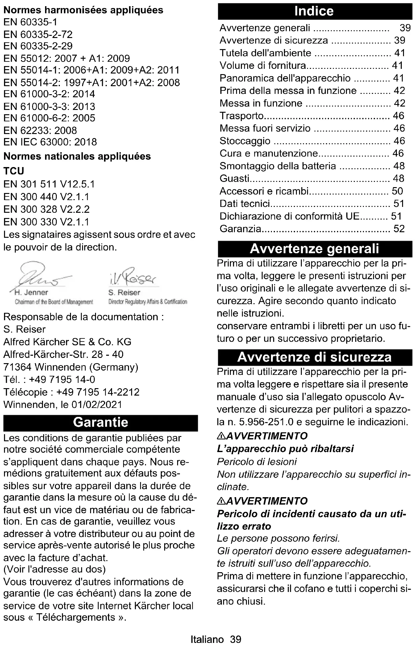 • dB(A) 2 Niveau de pression acoustique L DROITE + In- certitude K DROITE dB(A) 85Italiano 39 Normes harmonisées appliquées EN 60335-1 EN 60335-2-72 EN 60335-2-29 EN 55012: 2007 + A1: 2009 EN 55014-1: 2006+A1: 2009+A2: 2011 EN 55014-2: 1997+A1: 2001+A2: 2008 EN 61000-3-2: 2014 EN 61000-3-3: 2013 EN 61000-6-2: 2005 EN 62233: 2008 EN IEC 63000: 2018 Normes nationales appliquées TCU EN 301 511 V12.5.1 EN 300 440 V2.1.1 EN 300 328 V2.2.2 EN 300 330 V2.1.1 Les signataires agissent sous ordre et avec le pouvoir de la direction. Responsable de la documentation : S. Reiser Alfred Kärcher SE & Co. KG Alfred-Kärcher-Str. 28 - 40 71364 Winnenden (Germany) Tél. : +49 7195 14-0 Télécopie : +49 7195 14-2212 Winnenden, le 01/02/2021 Garantie Les conditions de garantie publiées par notre société commerciale compétente s’appliquent dans chaque pays. Nous re- médions gratuitement aux défauts pos- sibles sur votre appareil dans la durée de garantie dans la mesure où la cause du dé- faut est un vice de matériau ou de fabrica- tion. En cas de garantie, veuillez vous adresser à votre distributeur ou au point de service après-vente autorisé le plus proche avec la facture d’achat. (Voir l'adresse au dos) Vous trouverez d'autres informations de garantie (le cas échéant) dans la zone de service de votre site Internet Kärcher local sous « Téléchargements ». Indice Avvertenze generali Prima di utilizzare l’apparecchio per la pri- ma volta, leggere le presenti istruzioni per l’uso originali e le allegate avvertenze di si- curezza. Agire secondo quanto indicato nelle istruzioni. conservare entrambi i libretti per un uso fu- turo o per un successivo proprietario. Avvertenze di sicurezza Prima di utilizzare l’apparecchio per la pri- ma volta leggere e rispettare sia il presente manuale d’uso sia l’allegato opuscolo Av- vertenze di sicurezza per pulitori a spazzo- la n. 5.956-251.0 e seguirne le indicazioni. 몇 AVVERTIMENTO L’apparecchio può ribaltarsi Pericolo di lesioni Non utilizzare l’apparecchio su superfici in- clinate. 몇 AVVERTIMENTO Pericolo di incidenti causato da un uti- lizzo errato Le persone possono ferirsi. Gli operatori devono essere adeguatamen- te istruiti sull’uso dell’apparecchio. Prima di mettere in funzione l’apparecchio, assicurarsi che il cofano e tutti i coperchi si- ano chiusi. Avvertenze generali p. 39