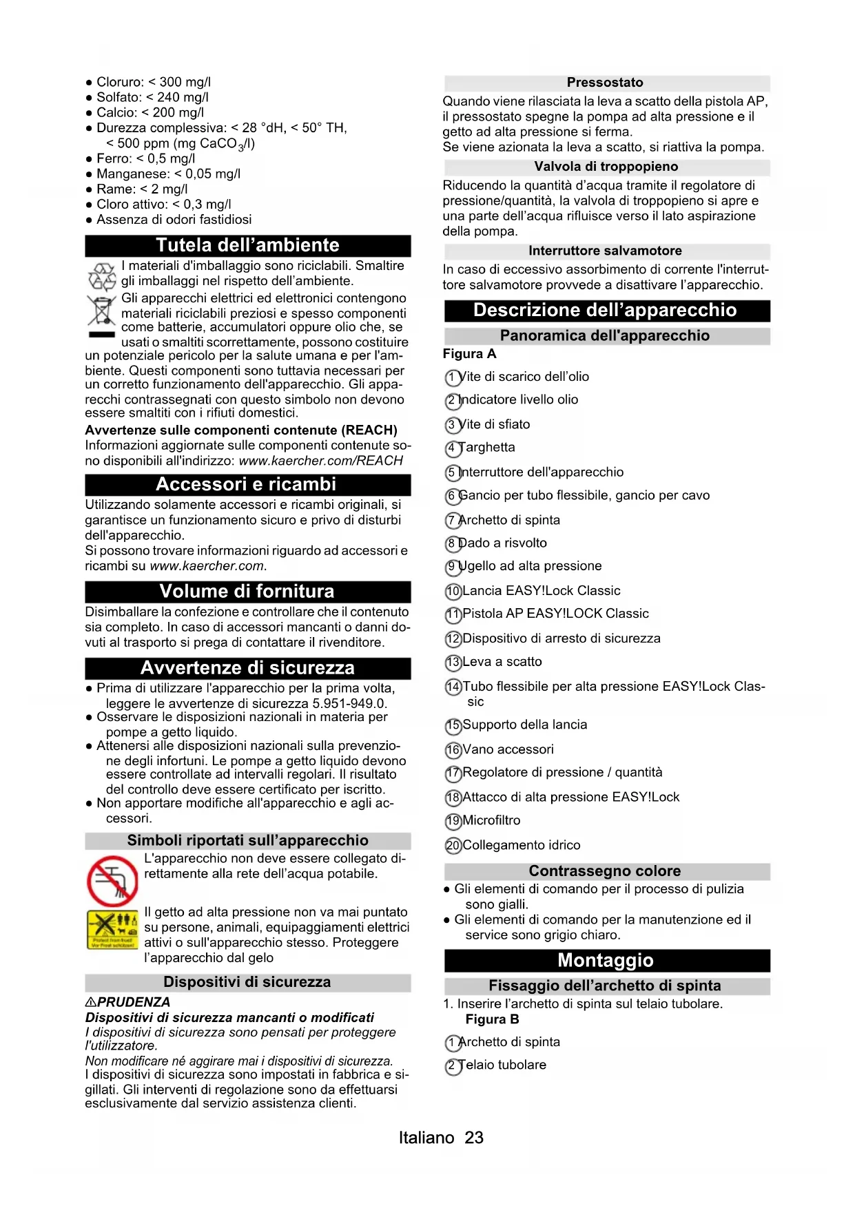 /l) ● Ferro: < 0,5 mg/l ● Manganese: < 0,05 mg/l ● Rame: < 2 mg/l ● Cloro attivo: < 0,3 mg/l ● Assenza di odori fastidiosi Tutela dell’ambiente I materiali d'imballaggio sono riciclabili. Smaltire gli imballaggi nel rispetto dell’ambiente. Gli apparecchi elettrici ed elettronici contengono materiali riciclabili preziosi e spesso componenti come batterie, accumulatori oppure olio che, se usati o smaltiti scorrettamente, possono costituire un potenziale pericolo per la salute umana e per l'am- biente. Questi componenti sono tuttavia necessari per un corretto funzionamento dell'apparecchio. Gli appa- recchi contrassegnati con questo simbolo non devono essere smaltiti con i rifiuti domestici. Avvertenze sulle componenti contenute (REACH) Informazioni aggiornate sulle componenti contenute so- no disponibili all'indirizzo: www.kaercher.com/REACH Accessori e ricambi Utilizzando solamente accessori e ricambi originali, si garantisce un funzionamento sicuro e privo di disturbi dell'apparecchio. Si possono trovare informazioni riguardo ad accessori e ricambi su www.kaercher.com. Volume di fornitura Disimballare la confezione e controllare che il contenuto sia completo. In caso di accessori mancanti o danni do- vuti al trasporto si prega di contattare il rivenditore. Avvertenze di sicurezza ● Prima di utilizzare l'apparecchio per la prima volta, leggere le avvertenze di sicurezza 5.951-949.0. ● Osservare le disposizioni nazionali in materia per pompe a getto liquido. ● Attenersi alle disposizioni nazionali sulla prevenzio- ne degli infortuni. Le pompe a getto liquido devono essere controllate ad intervalli regolari. Il risultato del controllo deve essere certificato per iscritto. ● Non apportare modifiche all'apparecchio e agli ac- cessori. Simboli riportati sull’apparecchio L'apparecchio non deve essere collegato di- rettamente alla rete dell’acqua potabile. Il getto ad alta pressione non va mai puntato su persone, animali, equipaggiamenti elettrici attivi o sull'apparecchio stesso. Proteggere l’apparecchio dal gelo Dispositivi di sicurezza 몇 PRUDENZA Dispositivi di sicurezza mancanti o modificati I dispositivi di sicurezza sono pensati per proteggere l'utilizzatore. Non modificare né aggirare mai i dispositivi di sicurezza. I dispositivi di sicurezza sono impostati in fabbrica e si- gillati. Gli interventi di regolazione sono da effettuarsi esclusivamente dal servizio assistenza clienti. Pressostato Quando viene rilasciata la leva a scatto della pistola AP, il pressostato spegne la pompa ad alta pressione e il getto ad alta pressione si ferma. Se viene azionata la leva a scatto, si riattiva la pompa. Valvola di troppopieno Riducendo la quantità d’acqua tramite il regolatore di pressione/quantità, la valvola di troppopieno si apre e una parte dell’acqua rifluisce verso il lato aspirazione della pompa. Interruttore salvamotore In caso di eccessivo assorbimento di corrente l'interrut- tore salvamotore provvede a disattivare l’apparecchio. Descrizione dell’apparecchio Panoramica dell'apparecchio Figura A 1 Vite di scarico dell’olio 2 Indicatore livello olio 3 Vite di sfiato 4 Targhetta 5 Interruttore dell'apparecchio 6 Gancio per tubo flessibile, gancio per cavo 7 Archetto di spinta 8 Dado a risvolto 9 Ugello ad alta pressione 10 Lancia EASY!Lock Classic 11 Pistola AP EASY!LOCK Classic 12 Dispositivo di arresto di sicurezza 13 Leva a scatto 14 Tubo flessibile per alta pressione EASY!Lock Clas- sic 15 Supporto della lancia 16 Vano accessori 17 Regolatore di pressione / quantità 18 Attacco di alta pressione EASY!Lock 19 Microfiltro 20 Collegamento idrico Contrassegno colore ● Gli elementi di comando per il processo di pulizia sono gialli. ● Gli elementi di comando per la manutenzione ed il service sono grigio chiaro. Montaggio Fissaggio dell’archetto di spinta