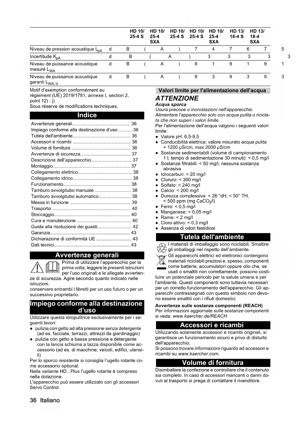 - dB(A)91919191919191 Niveau de puissance acoustique garanti L WA, d dB(A)93939393939393 HD 10/ 25-4 S HD 10/ 25-4 SXA HD 10/ 25-4 S HD 10/ 25-4 S HD 10/ 25-4 SXA HD 13/ 18-4 S HD 13/ 18-4 SXA Avvertenze generali p. 36