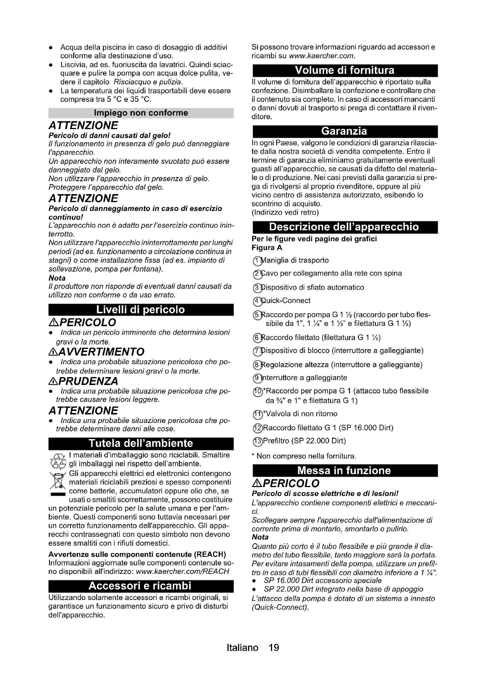 - Dichiarazione di conformità UE Italiano 19 ● Acqua della piscina in caso di dosaggio di additivi conforme alla destinazione d’uso. ● Liscivia, ad es. fuoriuscita da lavatrici. Quindi sciac- quare e pulire la pompa con acqua dolce pulita, ve- dere il capitolo Risciacquo e pulizia. ● La temperatura dei liquidi trasportabili deve essere compresa tra 5 °C e 35 °C. Impiego non conforme ATTENZIONE Pericolo di danni causati dal gelo! Il funzionamento in presenza di gelo può danneggiare l'apparecchio. Un apparecchio non interamente svuotato può essere danneggiato dal gelo. Non utilizzare l’apparecchio in presenza di gelo. Proteggere l’apparecchio dal gelo. ATTENZIONE Pericolo di danneggiamento in caso di esercizio continuo! L'apparecchio non è adatto per l’esercizio continuo inin- terrotto. Non utilizzare l'apparecchio ininterrottamente per lunghi periodi (ad es. funzionamento a circolazione continua in stagni) o come installazione fissa (ad es. impianto di sollevazione, pompa per fontana). Nota Il produttore non risponde di eventuali danni causati da utilizzo non conforme o da uso errato. Livelli di pericolo PERICOLO ● Indica un pericolo imminente che determina lesioni gravi o la morte. 몇 AVVERTIMENTO ● Indica una probabile situazione pericolosa che po- trebbe determinare lesioni gravi o la morte. 몇 PRUDENZA ● Indica una probabile situazione pericolosa che po- trebbe causare lesioni leggere. ATTENZIONE ● Indica una probabile situazione pericolosa che po- trebbe determinare danni alle cose. Tutela dell’ambiente I materiali d'imballaggio sono riciclabili. Smaltire gli imballaggi nel rispetto dell’ambiente. Gli apparecchi elettrici ed elettronici contengono materiali riciclabili preziosi e spesso componenti come batterie, accumulatori oppure olio che, se usati o smaltiti scorrettamente, possono costituire un potenziale pericolo per la salute umana e per l'am- biente. Questi componenti sono tuttavia necessari per un corretto funzionamento dell'apparecchio. Gli appa- recchi contrassegnati con questo simbolo non devono essere smaltiti con i rifiuti domestici. Avvertenze sulle componenti contenute (REACH) Informazioni aggiornate sulle componenti contenute so- no disponibili all'indirizzo: www.kaercher.com/REACH Accessori e ricambi Utilizzando solamente accessori e ricambi originali, si garantisce un funzionamento sicuro e privo di disturbi dell'apparecchio. Si possono trovare informazioni riguardo ad accessori e ricambi su www.kaercher.com. Volume di fornitura Il volume di fornitura dell’apparecchio è riportato sulla confezione. Disimballare la confezione e controllare che il contenuto sia completo. In caso di accessori mancanti o danni dovuti al trasporto si prega di contattare il riven- ditore. Garanzia In ogni Paese, valgono le condizioni di garanzia rilascia- te dalla nostra società di vendita competente. Entro il termine di garanzia eliminiamo gratuitamente eventuali guasti all’apparecchio, se causati da difetto del materia- le o di produzione. Nei casi previsti dalla garanzia si pre- ga di rivolgersi al proprio rivenditore, oppure al più vicino centro di assistenza autorizzato, esibendo lo scontrino di acquisto. (Indirizzo vedi retro) Descrizione dell’apparecchio Per le figure vedi pagine dei grafici Figura A 1 Maniglia di trasporto 2 Cavo per collegamento alla rete con spina 3 Dispositivo di sfiato automatico 4 Quick-Connect 5 Raccordo per pompa G 1 ½ (raccordo per tubo fles- sibile da 1”, 1 ¼” e 1 ½” e filettatura G 1 ½) 6 Raccordo filettato (filettatura G 1 ½) 7 Dispositivo di blocco (interruttore a galleggiante) 8 Regolazione altezza (interruttore a galleggiante) 9 Interruttore a galleggiante 10 *Raccordo per pompa G 1 (attacco tubo flessibile da ¾" e 1" e filettatura G 1) 11 *Valvola di non ritorno 12 Raccordo filettato G 1 (SP 16.000 Dirt) 13 Prefiltro (SP 22.000 Dirt) p. 22