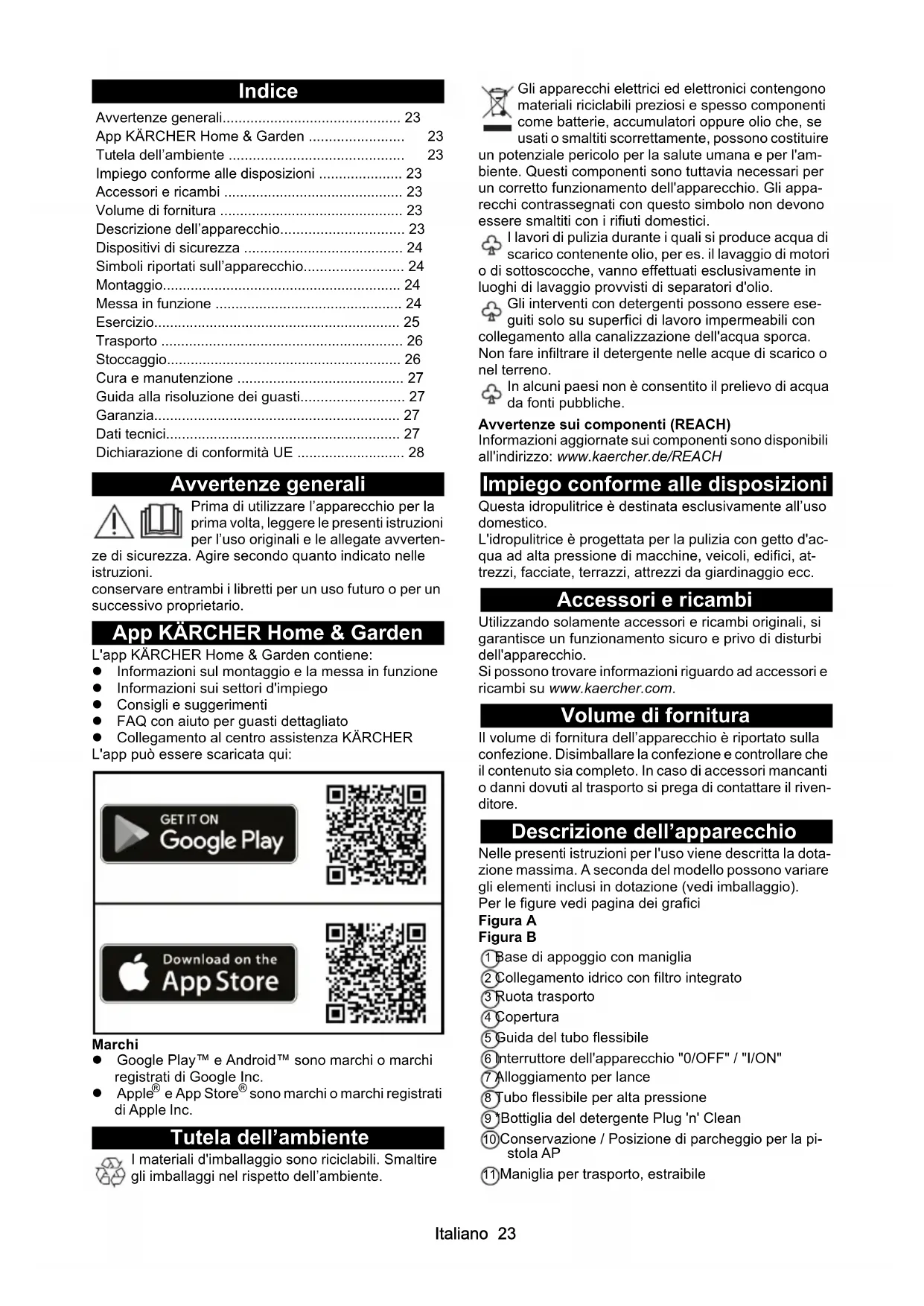 dB(A) 92 92 K 5 Premium Power Control Power Control Chairman of the Board of Management Director Regulatory Affairs & Certification H. Jenner S. ReiserItaliano 23 Indice Avvertenze generali Prima di utilizzare l’apparecchio per la prima volta, leggere le presenti istruzioni per l’uso originali e le allegate avverten- ze di sicurezza. Agire secondo quanto indicato nelle istruzioni. conservare entrambi i libretti per un uso futuro o per un successivo proprietario. App KÄRCHER Home & Garden L'app KÄRCHER Home & Garden contiene: Informazioni sul montaggio e la messa in funzione Informazioni sui settori d'impiego Consigli e suggerimenti FAQ con aiuto per guasti dettagliato Collegamento al centro assistenza KÄRCHER L'app può essere scaricata qui: Marchi Google Play™ e Android™ sono marchi o marchi registrati di Google Inc. Apple