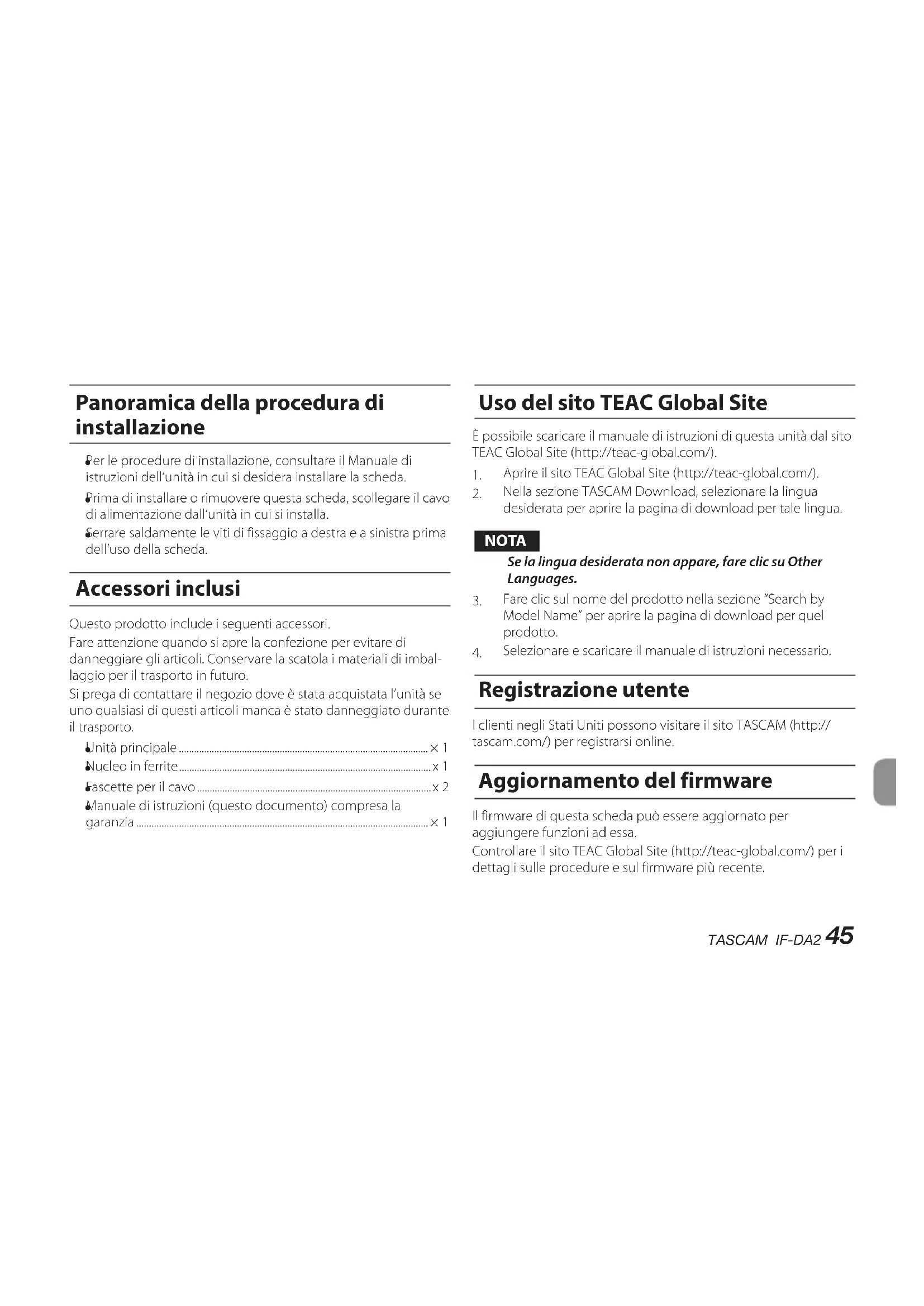 Per i clienti europei Smaltimento di apparecchiature elettriche ed elettroniche (a) Tutte le apparecchiature elettriche ed elettroniche devono essere smaltite separatamente dai rifiuti urbani mediante impianti di raccolta specifici designati dal governo o dalle autorità locali. (b) Lo smaltimento in modo corretto delle apparecchiature elettriche ed elettroniche contribuisce a risparmiare preziose risorse ed evitare potenziali effetti negativi sulla salute umana e l’ambiente. (c) Lo smaltimento non corretto di apparecchiature può avere gravi conseguenze sull’ambiente e sulla salute umana come risultato della presenza di sostanze pericolose nelle apparec- chiature elettriche ed elettroniche. (d) Il simbolo barrato della pattumiera indica che le apparecchiature elettriche ed elettroniche devono essere raccolte e smaltite separatamente dai rifiuti domestici. (e) I sistemi di raccolta sono a disposizione degli utenti finali. Per informazioni più dettagliate sullo smaltimento delle vecchie apparecchiature elettriche ed elettroniche, contattare il comune, il servizio di smaltimento rifiuti o il negozio dove è stato acquistato l’apparecchio.44 TASCAM IF-DA2 Introduzione Grazie per l’acquisto di una scheda di interfaccia TASCAM IF-DA2 Dante. Prima di collegare e utilizzare questa scheda, si prega di leggere attentamente questo manuale per essere sicuri di capire come impostare correttamente e collegarla, nonché il funzionamento delle sue numerose funzioni utili e comode. Dopo aver terminato la lettura di questo manuale, si prega di conservarlo in un luogo sicuro per future consultazioni. È possibile scaricare questo manuale dal sito TEAC Global Site (http://teac-global.com/). Caratteristiche di queste schede