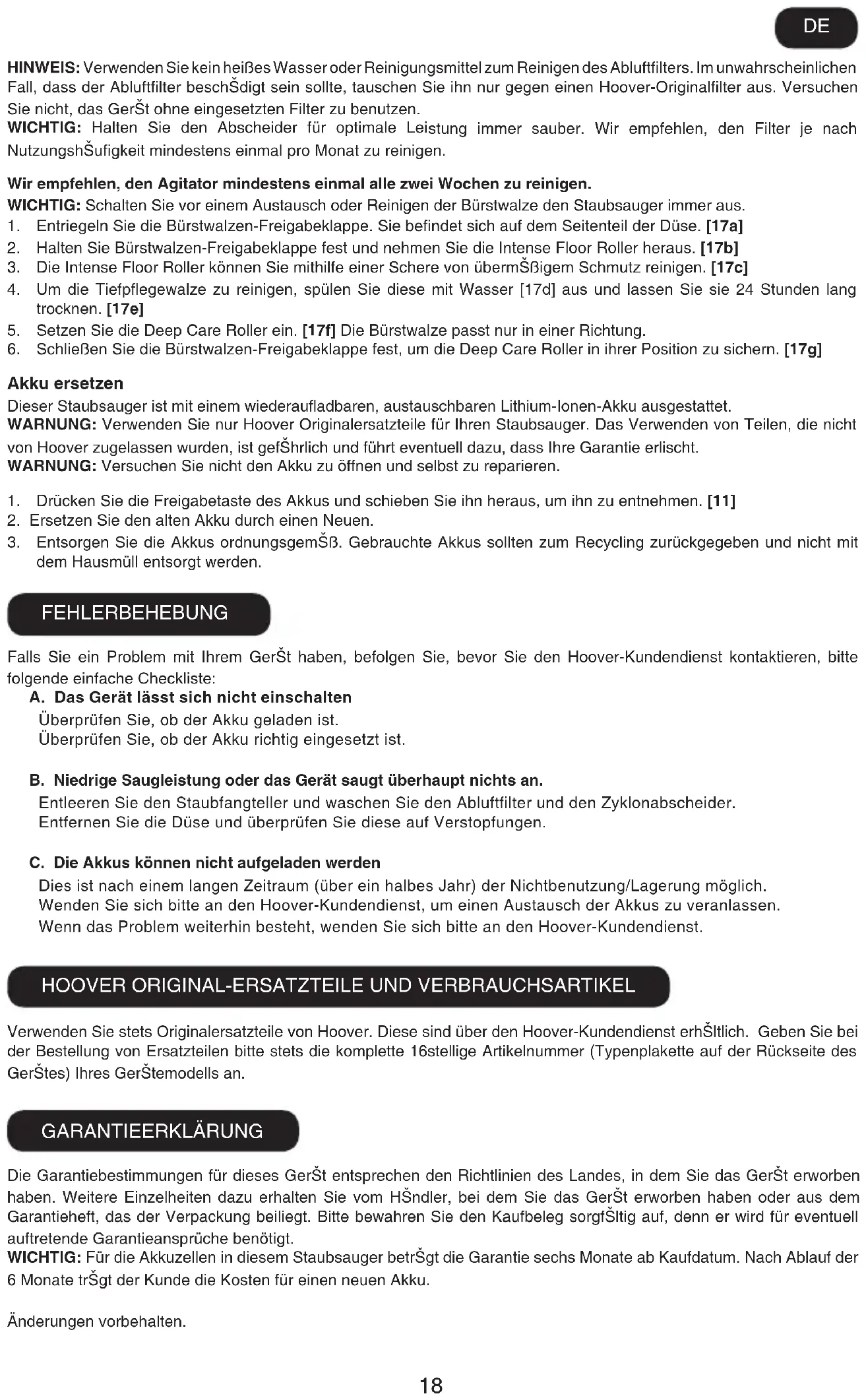 6. Chiudere la levetta di rilascio della spazzola rotante assicurandosi che il rullo Deep Care sia nella corretta posizione. [17g] Sostituzione delle batterie L’apparecchio è dotato di un set batterie ricaricabili al litio che possono essere sostituite. ATTENZIONE: Utilizzare solo parti di ricambio originali per il vostro apparecchio. L’uso di parti non originali Hoover può risultare pericoloso ed invalida la garanzia. ATTENZIONE: Non tentare di aprire o riparare la batteria.