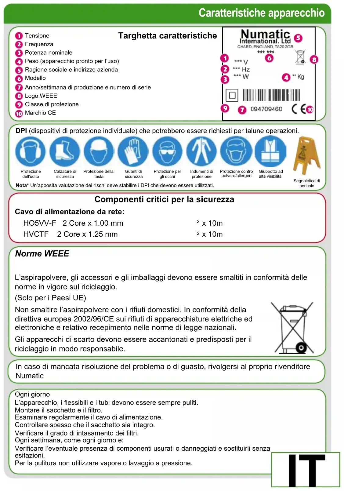 x 10m In caso di mancata risoluzione del problema o di guasto, rivolgersi al proprio rivenditore Numatic Ogni giorno L’apparecchio, i essibili e i tubi devono essere sempre puliti. Montare il sacchetto e il ltro. Esaminare regolarmente il cavo di alimentazione. Controllare spesso che il sacchetto sia integro. Vericare il grado di intasamento dei ltri. Ogni settimana, come ogni giorno e: Vericare l’eventuale presenza di componenti usurati o danneggiati e sostituirli senza esitazioni. Per la pulitura non utilizzare vapore o lavaggio a pressione. Caratteristiche apparecchio