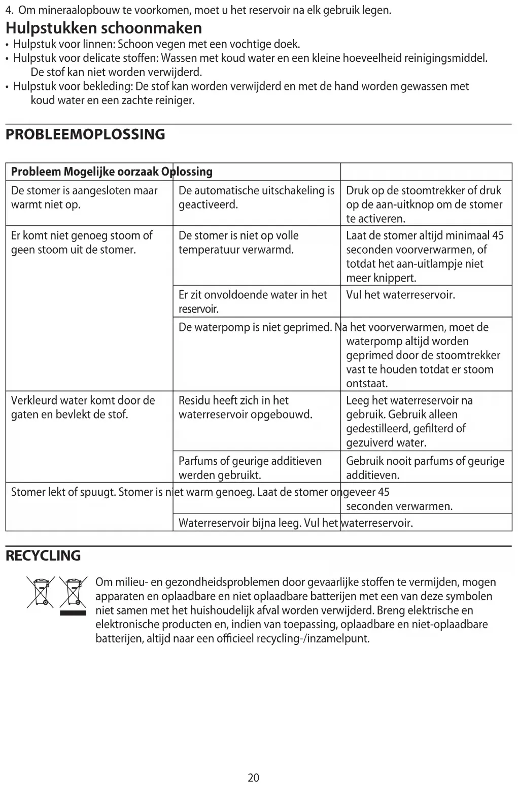 - Accessorio per tappezzeria: Il tessuto può essere rimosso e lavato a mano con acqua fredda e un detersivo delicato. RISOLUZIONE PROBLEMI Problema Possibile causa Soluzione Il vaporizzatore è collegato alla presa di corrente ma non si scalda. Si è attivato l'autospegnimento. Premere il pulsante di emissione vapore o quello di accensione per attivare il vaporizzatore. Dal vaporizzatore non fuoriesce vapore o non ne esce abbastanza. Il vaporizzatore non ha raggiunto la piena temperatura. Lasciare preriscaldare il vaporizzatore per almeno 45 secondi, o no a quando la spia di accensione smetterà di lampeggiare. Non c'è abbastanza acqua nel serbatoio dell'acqua. Riempire il serbatoio dell'acqua. La pompa dell'acqua non è stata caricata. Dopo aver pre-riscaldato, caricare la pompa dell'acqua tenendo premuto il pulsante di emissione vapore no a quando si forma il vapore. Dai fori fuoriesce acqua colorata che macchia il tessuto. Si è accumulato del residuo nel serbatoio dell'acqua. Svuotare il serbatoio dell'acqua dopo ogni uso. Utilizzare solo acqua distillata, ltrata o puricata. Sono stati utilizzati additivi profumati o essenze. Non utilizzare additivi profumati o essenze. Il vaporizzatore perde o sputa acqua. Il vaporizzatore non è abbastanza caldo. Lasciare che il vaporizzatore si riscaldi per circa 45 secondi. Il serbatoio dell'acqua sta funzionando lentamente. Riempire il serbatoio dell'acqua. RICICLO