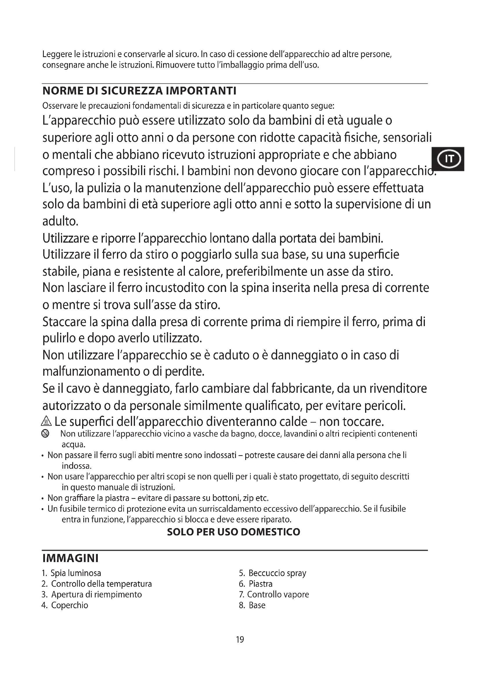 Osservare le precauzioni fondamentali di sicurezza e in particolare quanto segue: L’apparecchio può essere utilizzato solo da bambini di età uguale o superiore agli otto anni o da persone con ridotte capacità fisiche, sensoriali o mentali che abbiano ricevuto istruzioni appropriate e che abbiano compreso i possibili rischi. I bambini non devono giocare con l’apparecchio. L’uso, la pulizia o la manutenzione dell’apparecchio può essere effettuata solo da bambini di età superiore agli otto anni e sotto la supervisione di un adulto. Utilizzare e riporre l’apparecchio lontano dalla portata dei bambini. Utilizzare il ferro da stiro o poggiarlo sulla sua base, su una superficie stabile, piana e resistente al calore, preferibilmente un asse da stiro. Non lasciare il ferro incustodito con la spina inserita nella presa di corrente o mentre si trova sull’asse da stiro. Staccare la spina dalla presa di corrente prima di riempire il ferro, prima di pulirlo e dopo averlo utilizzato. Non utilizzare l’apparecchio se è caduto o è danneggiato o in caso di malfunzionamento o di perdite. Se il cavo è danneggiato, farlo cambiare dal fabbricante, da un rivenditore autorizzato o da personale similmente qualificato, per evitare pericoli. h Le superfici dell’apparecchio diventeranno calde – non toccare. b Non utilizzare l’apparecchio vicino a vasche da bagno, docce, lavandini o altri recipienti contenenti acqua.