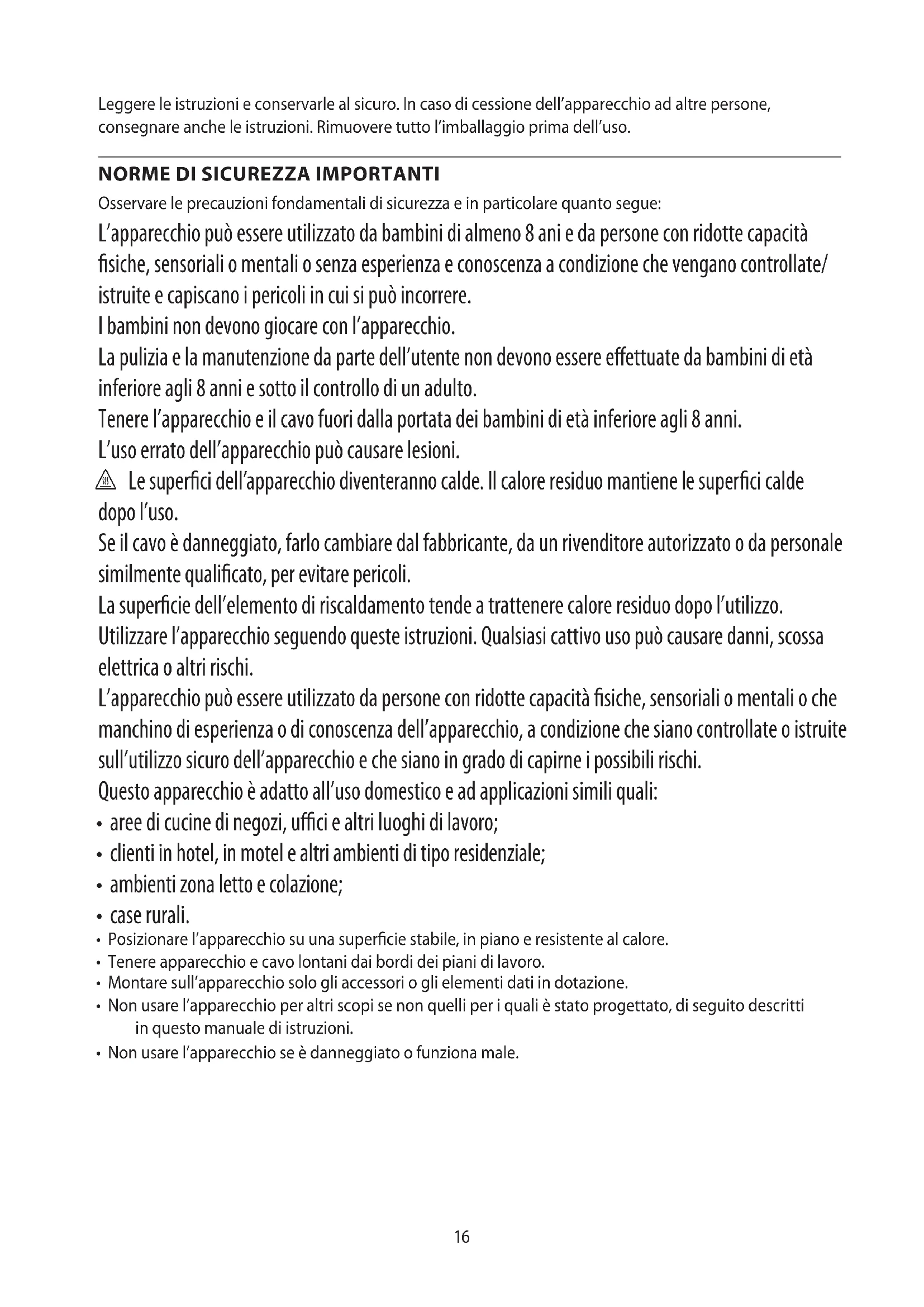 Osservare le precauzioni fondamentali di sicurezza e in particolare quanto segue: L’apparecchio può essere utilizzato da bambini di almeno 8 ani e da persone con ridotte capacità siche, sensoriali o mentali o senza esperienza e conoscenza a condizione che vengano controllate/ istruite e capiscano i pericoli in cui si può incorrere. I bambini non devono giocare con l’apparecchio. La pulizia e la manutenzione da parte dell’utente non devono essere eettuate da bambini di età inferiore agli 8 anni e sotto il controllo di un adulto. Tenere l’apparecchio e il cavo fuori dalla portata dei bambini di età inferiore agli 8 anni. L’uso errato dell’apparecchio può causare lesioni. h Le superci dell’apparecchio diventeranno calde. Il calore residuo mantiene le superci calde dopo l’uso. Se il cavo è danneggiato, farlo cambiare dal fabbricante, da un rivenditore autorizzato o da personale similmente qualicato, per evitare pericoli. La supercie dell’elemento di riscaldamento tende a trattenere calore residuo dopo l’utilizzo. Utilizzare l’apparecchio seguendo queste istruzioni. Qualsiasi cattivo uso può causare danni, scossa elettrica o altri rischi. L’apparecchio può essere utilizzato da persone con ridotte capacità siche, sensoriali o mentali o che manchino di esperienza o di conoscenza dell’apparecchio, a condizione che siano controllate o istruite sull’utilizzo sicuro dell’apparecchio e che siano in grado di capirne i possibili rischi. Questo apparecchio è adatto all’uso domestico e ad applicazioni simili quali: