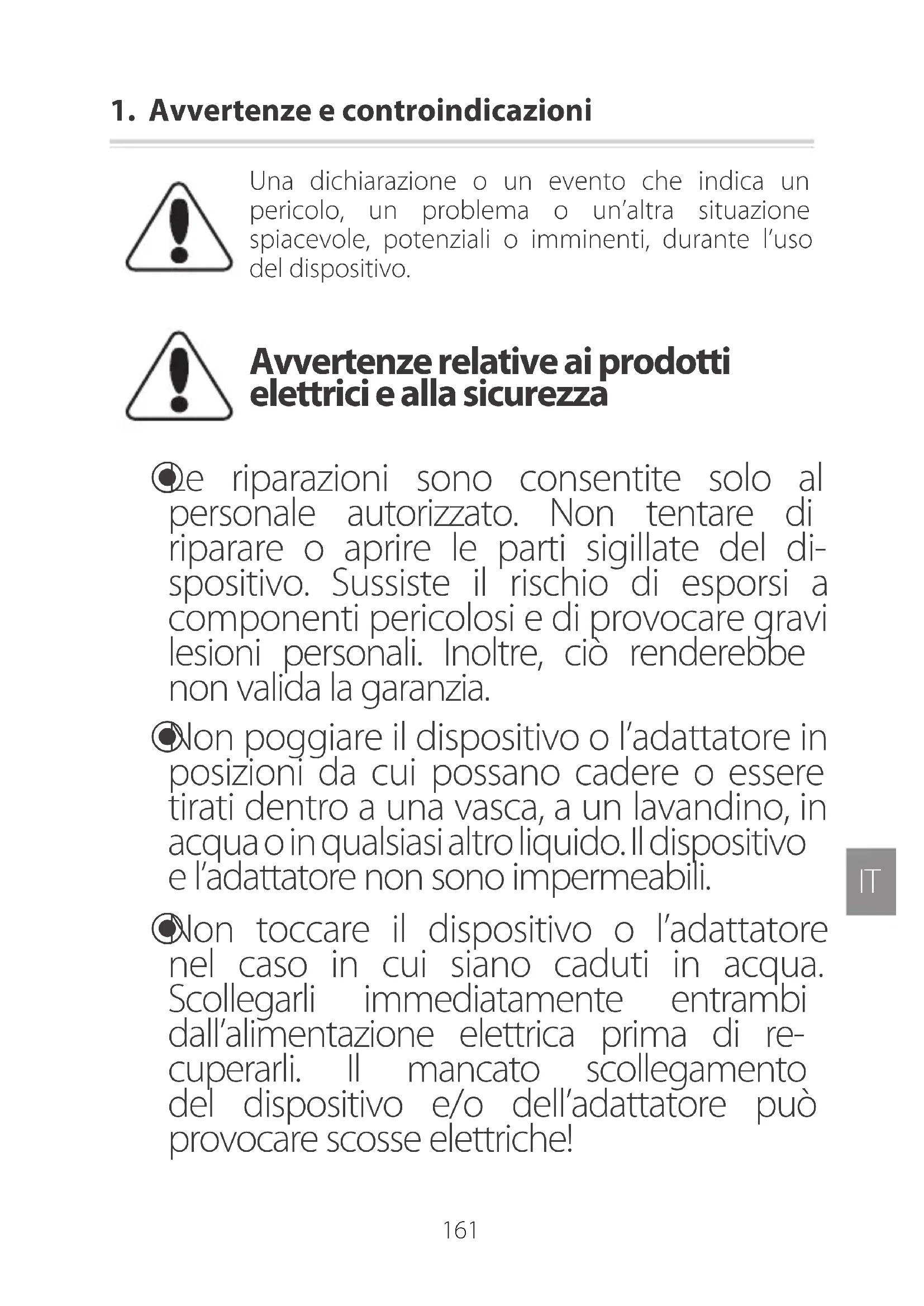Non toccare il dispositivo o l’adattatore nel caso in cui siano caduti in acqua. Scollegarli immediatamente entrambi dall’alimentazione elettrica prima di re- cuperarli. Il mancato scollegamento del dispositivo e/o dell’adattatore può provocare scosse elettriche! FaceTite EU124 7326D ALL ED371-10 released.indd 161 17/03/2019 13:29:23ITIT