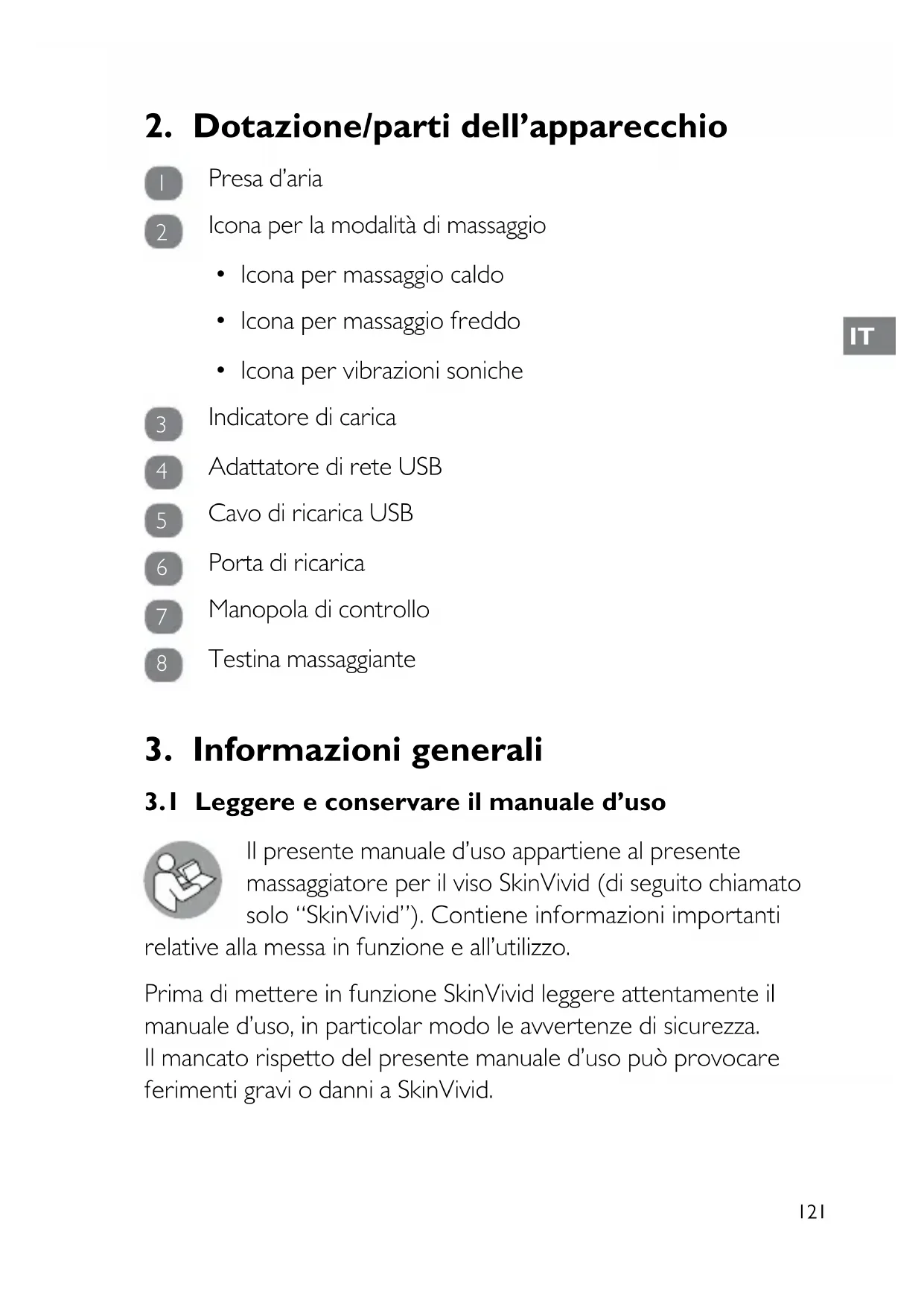 Il presente manuale d’uso appartiene al presente massaggiatore per il viso SkinVivid (di seguito chiamato solo “SkinVivid”). Contiene informazioni importanti relative alla messa in funzione e all’utilizzo. Prima di mettere in funzione SkinVivid leggere attentamente il manuale d’uso, in particolar modo le avvertenze di sicurezza. Il mancato rispetto del presente manuale d’uso può provocare ferimenti gravi o danni a SkinVivid.122