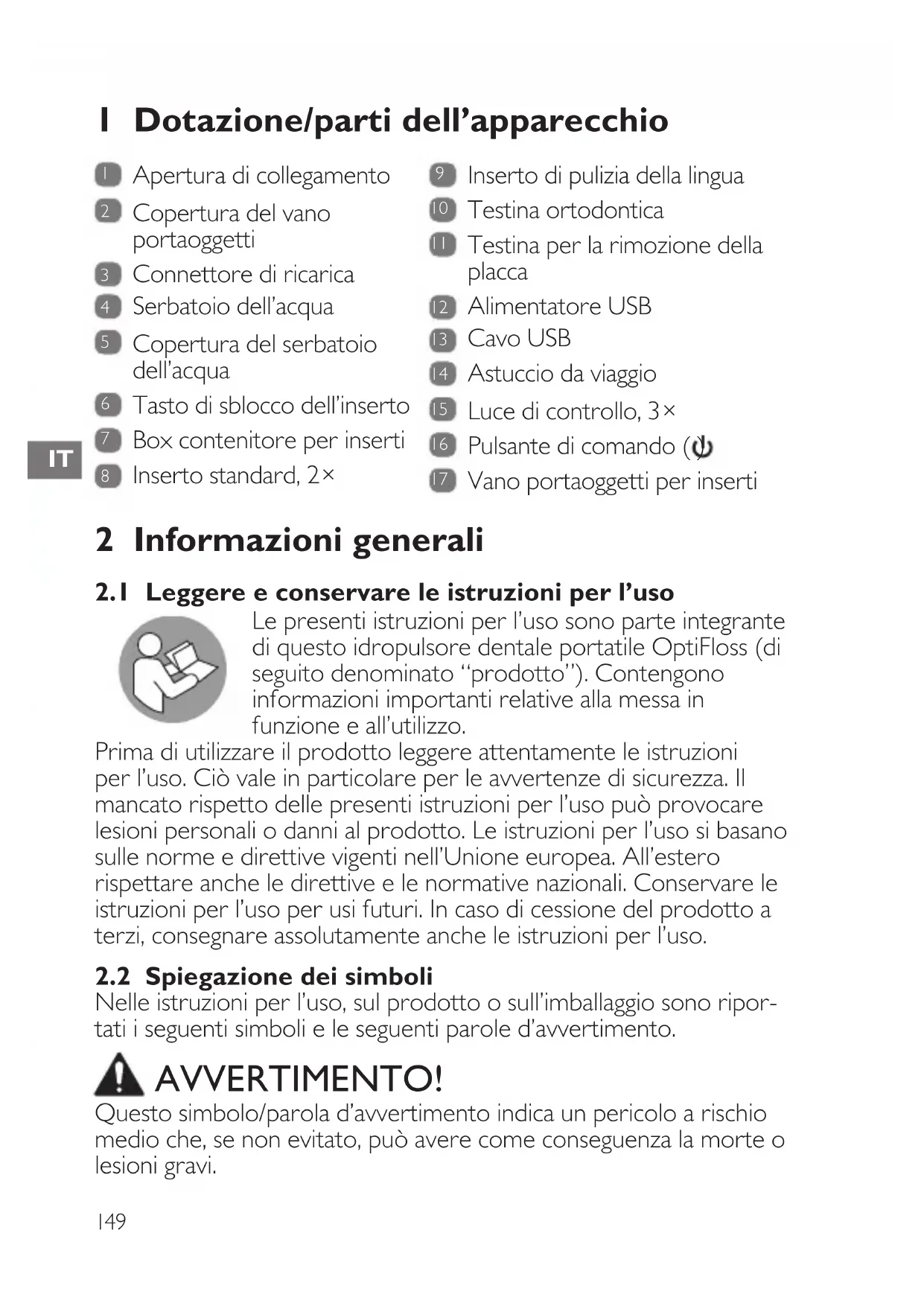 2.1 Leggere e conservare le istruzioni per l’uso _____________________ 149