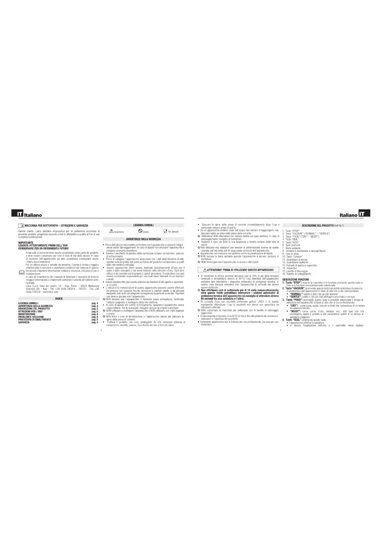 VT3117 - Macchine per confezionamento sottovuoto LAICA - Manuale utente e istruzioni gratuiti