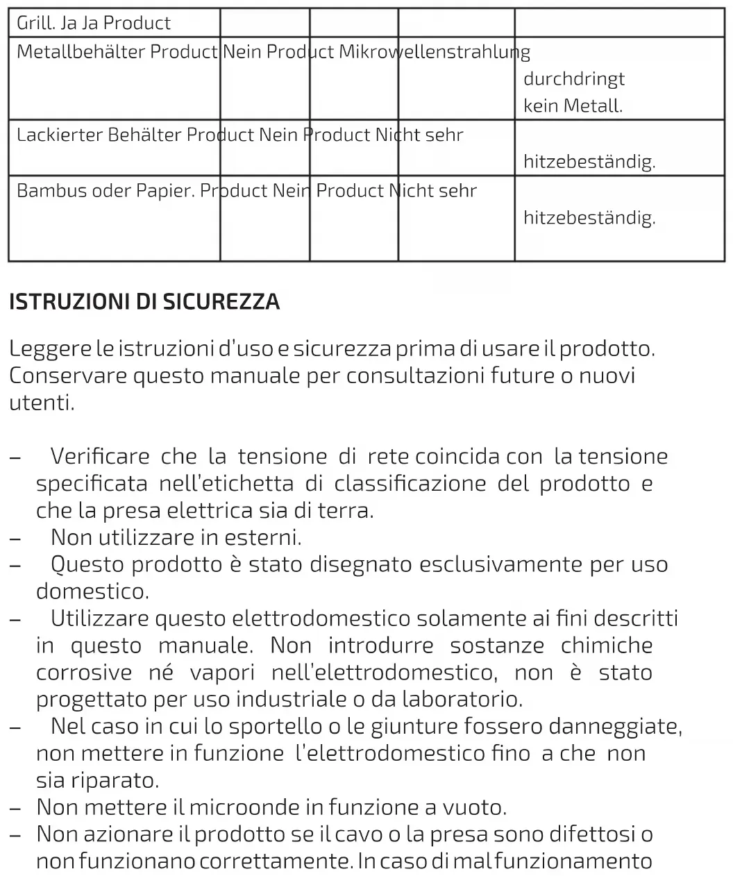 Leggere le istruzioni d’uso e sicurezza prima di usare il prodotto. Conservare questo manuale per consultazioni future o nuovi utenti. - Vericare che la tensione di rete coincida con la tensione specicata nell’etichetta di classicazione del prodotto e che la presa elettrica sia di terra. - Non utilizzare in esterni. - Questo prodotto è stato disegnato esclusivamente per uso domestico. - Utilizzare questo elettrodomestico solamente ai ni descritti in questo manuale. Non introdurre sostanze chimiche corrosive né vapori nell’elettrodomestico, non è stato progettato per uso industriale o da laboratorio. - Nel caso in cui lo sportello o le giunture fossero danneggiate, non mettere in funzione l’elettrodomestico no a che non sia riparato. - Non mettere il microonde in funzione a vuoto. - Non azionare il prodotto se il cavo o la presa sono difettosi o non funzionano correttamente. In caso di mal funzionamentoo averia, contattare il Servizio di Assistenza Tecnica ufciale di Cecotec. - Utilizzare utensili adatti al microonde. Vericare che gli utensili non entrino a contatto con le pareti interne del prodotto durante il funzionamento. - Non utilizzare l’interno del microonde per la conservazione. - Non friggere alimenti nel microonde. - Per evitare il rischio di incendio, seguire le seguenti indicazioni: - Non cucinare eccessivamente gli alimenti. - Ritirare le pellicole dai sacchetti di carta o di plastica prima di collocare i sacchetti nel microonde. - Non riscaldare liquidi nè alimenti in recipienti sigillati. - In caso di fumo o amme all’interno, mantenere chiuso lo sportello dell’elettrodomestico, spegnerlo e scollegarlo dalla presa della corrente. - Non collocare cibo né utensili caldi o congelati sul piatto girevole per evitare che si rompa. - Dopo ogni uso, il recipiente impiegato potrebbe essere molto caldo. Utilizzare guanti per evitare scottature o danni. - Durante il funzionamento del microonde in modalità Grill o modalità Combination (1, 2 o 3), è possibile che tutte le parti dell’elettrodomestico raggiungano una temperatura elevata, incluse lo sportello e la parte superiore del prodotto. Utilizzare guanti o altri tipi di protezione. - Questo elettrodomestico può essere usato da bambini a partire dagli 8 anni di età sotto la sorveglianza continua di un adulto. - Questo prodotto può essere usato da persone con capacità siche, sensoriali o mentali limitate, o con mancanza di esperienza e conoscenza solo sotto sorveglianza o avendoricevuto istruzioni riguardanti l’uso dell’apparato in modo sicuro e comprendono i rischi che lo stesso implica. - Sorvegliare i bambini per assicurarsi che non giochino con il prodotto. È necessario sorvegliare rigidamente nel caso in cui il prodotto venga utilizzato da o vicino a bambini. - Questo prodotto è un sistema ISM Gruppo 2 Classe B. La denizione di Gruppo 2 contiene tutto il sistema ISM (Industriale, Scientico e Medico) nel quale si genera e/o utilizza energia di radiofrequenza sotto forma di radiazione elettromagnetica per il trattamento materiale e tutto il sistema di elettroerosione. Il sistema di Classe B è un tipo di gruppo adeguato in strutture domestiche o direttamente collegate alla corrente elettrica a basso voltaggio per il rifornimento di stabilimenti a ni domestici. - Qualsiasi servizio di manutenzione o riparazione che comporta il ritiro di uno dei coperchi o l’esposizione a cavi, dovrà essere effettuato da personale qualicato. - È importante utilizzare materiali e recipienti compatibili a microonde per essere utilizzati in modo sicuro. La seguente tabella mostra quali sono i materiali adatti e non: Materiale del recipiente Grill Combi Microonde Avvertenze Ceramica resistente al calore. Sì Sì Sì Non utilizzare ceramica decorata con vetro o bordi. Plastica resistente al calore No No Sì Evitare di scaldare in modo prolungato.Vetro resistente al calore. Sì Sì Sì Pellicola trasparente. No No Sì Non utilizzare per cucinare carne, le alte temperature potrebbero danneggiarlo. Griglia Sì Sì No Recipiente in metallo. No No No Le radiazioni del microonde non oltrepassano il metallo. Recipiente laccato. No No No Poco resistente al calore. Bambù o carta. No No No Poco resistente al calore.