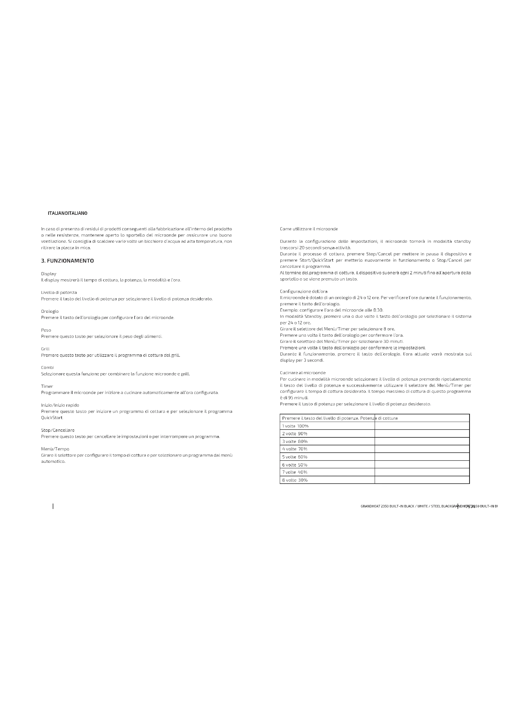 Leggere attentamente le seguenti istruzioni prima di usare il prodotto. Conservare questo manuale per riferimenti futuri o nuovi utenti. Verificare che la tensione di rete coincida con quella specificata nell’etichetta di classificazione del prodotto e che la presa elettrica sia di terra. Il dispositivo deve essere collegato ad una presa di terra. Il microonde è dotato di cavo e presa di corrente. Deve essere collegato a una presa da parete correttamente installata e collegata a terra. In caso di scarica elettrica, la connessione a terra riduce tale rischio. Non utilizzare in esterni. Questo prodotto è stato progettato esclusivamente per uso domestico. È stato disegnato specificamente per riscaldare, cucinare o disidratare alimenti. Non è adatto per uso industriale o da laboratorio. Utilizzare questo apparato ai fini descritti in questo manuale. Non scaldare prodotti chimici né vapori corrosivi in questo dispositivo; non è progettato per usi industriali né di laboratorio. Nel caso in cui le giunture siano danneggiate, non utilizzare il prodotto fino a che venga riparato. Non mettere in funzione il dispositivo a vuoto. Non cercare di utilizzare il dispositivo con lo sportello aperto per evitare il rischio di esporsi a energia dannosa per irradiazione da microonde. Non utilizzare il dispositivo se il suo cavo o presa sono danneggiati o se non funziona correttamente. Qualora il dispositivo non funzionasse correttamente, contattare il servizio di Assistenza Tecnica. Utilizzare utensili adatti al microonde. Verificare che gli utensili non tocchino l’interno delle pareti del dispositivo durante il funzionamento. 01387_01388_01389_GrandHeat 2350 Built-In Black_White_Steel black_Manual_YV_01200623.indd 20-2101387_01388_01389_GrandHeat 2350 Built-In Black_White_Steel black_Manual_YV_01200623.indd 20-21 26/6/20 14:2026/6/20 14:20Non utilizzare l’interno del microonde per la conservazione. Non friggere alimenti nel microonde. Per ridurre il rischio di incendio: Non eccedere con la cottura del cibo. Ritirare le pellicole dai sacchetti di carta o di plastica prima di collocare i sacchetti nel microonde. Non collocare il prodotto vicino a fonti di calore, umidità o materiali infiammabili. Non scaldare liquidi né alimenti in recipienti sigillati. Non mettere in funzionamento il dispositivo con il piatto girevole, il supporto e l’asse non installato correttamente. Non utilizzare l’interno del microonde per conservare alimenti. Non riporre carta, utensili da cucina né alimenti dentro il microonde quando il dispositivo non è in uso. In caso di fumo o fiamme all’interno, mantenere chiuso lo sportello dell’elettrodomestico, spegnerlo e scollegarlo dalla presa della corrente. Non collocare cibo né utensili caldi o congelati sul piatto girevole per evitare che si rompa. Dopo ogni uso, il recipiente impiegato potrebbe essere molto caldo. Utilizzare guanti per evitare scottature e altri danni. Tutte le parti del dispositivo raggiungeranno temperature alte durante e dopo il funzionamento compreso lo sportello e la parte superiore del microonde. Utilizzare guanti o altri tipi di protezione. Qualsiasi servizio di manutenzione o riparazione che comporta il ritiro di uno dei coperchi o l’esposizione a cavi, dovrà essere effettuato da personale qualificato. Sorvegliare i bambini per assicurarsi che non giochino con il prodotto. Questo elettrodomestico può essere utilizzato da bambini a partire dagli 8 anni sotto la sorveglianza continua di un adulto. Questo prodotto può essere usato da persone con capacità fisiche, sensoriali o mentali limitate, o con mancanza di esperienza e conoscenza solo sotto sorveglianza o avendo ricevuto istruzioni riguardanti l’uso dell’apparato in modo sicuro e comprendono i rischi che lo stesso implica. Sorvegliare i bambini per assicurarsi che non giochino con il prodotto. È necessario sorvegliare rigidamente nel caso in cui il prodotto venga utilizzato da o vicino a bambini. Questo prodotto è un sistema ISM Gruppo 2 Classe B. La definizione di Gruppo 2 contiene tutto il sistema ISM (Industriale, Scientifico e Medico) nel quale si genera e/o utilizza energia di radiofrequenza sotto forma di radiazione elettromagnetica per il trattamento materiale e tutto il sistema di elettroerosione. Il sistema di Classe B è un tipo di gruppo adeguato in strutture domestiche o direttamente collegati alla corrente elettrica a basso voltaggio per il rifornimento di stabilimenti a fini domestici. È importante utilizzare materiali e recipienti compatibili a microonde per essere utilizzati in modo sicuro. La seguente tabella mostra quali sono i materiali adatti e non: Materiali adatti a microonde Materiale del recipiente Microonde Grill Combi Vetro resistente al calore Sì Sì Sì Vetro non resistente al calore No No No 01387_01388_01389_GrandHeat 2350 Built-In Black_White_Steel black_Manual_YV_01200623.indd 22-2301387_01388_01389_GrandHeat 2350 Built-In Black_White_Steel black_Manual_YV_01200623.indd 22-23 26/6/20 14:2026/6/20 14:20Ceramica resistente al calore Sì Sì Sì Plastica adatta a microonde Sì No No Carta assorbente Sì No No Vassoio metallico No Sì No Griglia metallica No Sì No Carta e recipienti in alluminio No Sì No È consigliabile usare utensili fabbricati in materiale trasparente all’interno del microonde. Tale uso permette riscaldare gli alimenti in modo ottimale poiché l’energia passa attraverso degli stessi. Il microonde non può trapassare il metallo, di conseguenza non devono essere usati piatti in metallo o utensili con bordi metallici. Non usare prodotti di carta riciclata quando si cucina al microonde, possono contenere frammenti di metallo che potrebbero provocare scintille e/o incendio. Si consiglia l’uso di piatti rotondi od ovali ma non quadrati, dato che gli alimenti negli angoli di solito si cucinano di più. È possibile usare striscioline strette in alluminio per evitare che le aree esposte si cuociano eccessivamente. Prestare 