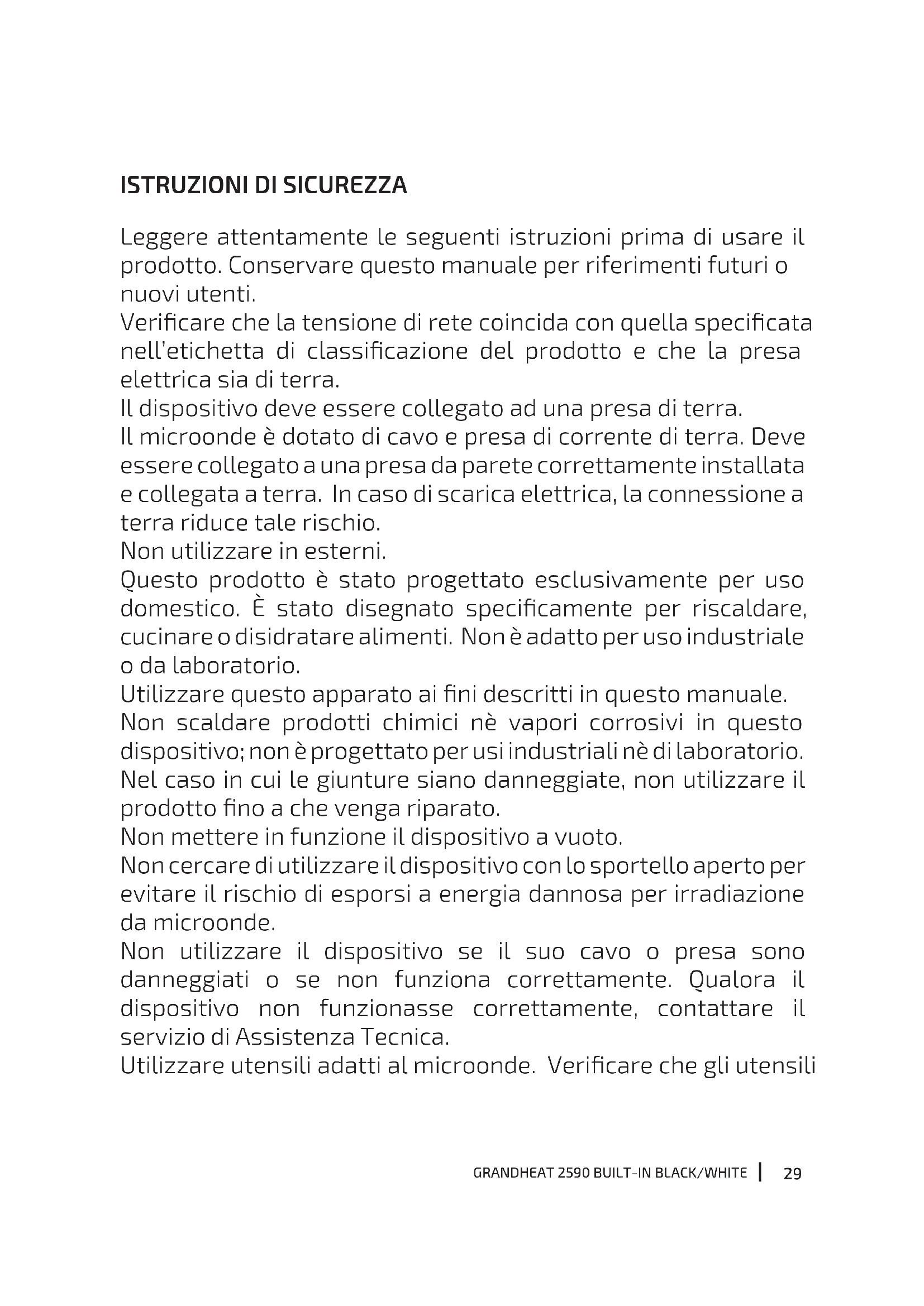 ITALIANO Toccare una volta l’icona Microwave/Grill/Combi Il display mostrerà “P100". Premere 4 volte l’icona Microwave/Grill/Combi o girare il selettore per selezionare la modalità Combi. 1. Toccare l’icona Start/+30sec/Conrm per confermare. Il display mostrerà “C-1”. Girare il selettore per selezionare il tempo di cottura desiderato: “10:00”. Toccare l’icona Start/+30sec/Conrm per iniziare il funzionamento. Avviso: a metà del processo di cottura, il dispositivo verrà interrotto e suonerà 2 volte. È per ricordare di girare gli alimenti per cucinarli uniformemente. Una volta girati, premere Start/+30sec/Conrm per continuare a cucinare. QuickStart Al selezionare questo programma, il dispositivo cucinerà gli alimenti in poco tempo a massima potenza (100% potenza microonde). Il tempo massimo di cottura di questo programma è di 95 minuti. Aprire lo sportello e collocare gli alimenti nel microonde. Chiudere lo sportello. In modalità Standby, premere Start/+30sec/Conrm per cucinare al 100% del livello di potenza. Ogni volta che si tocca l’icona, il tempo di cottura aumenterà di 30 secondi. In modalità microonde, Grill, Combi o Scongelamento, ogni volta che si preme il pulsante, verrà aumentato il tempo di cottura in 30 secondi. In modalità Standby, girare il selettore in senso antiorario per congurare il tempo di cottura (il livello di potenza è 100 % per difetto, non è modicabile). Dopo la congurazione del tempo, toccare l’icona Start/+30sec/Conrm per cominciare a cucinare. Scongelamento secondo il peso Toccare l’icona di Scongelamento secondo il peso/tempo, il display mostrerà dEF1”. Girare il selettore per selezionare il peso degli alimenti, da 100 g a 2000 g. Toccare l’icona Start/+30sec/Conrm per iniziare il processo di scongelamento. Scongelamento secondo il tempo Toccare l’icona di Scongelamento secondo il peso/tempo, il display mostrerà dEF2”. Girare il selettore per selezionare il tempo di scongelamento desiderato. Il tempo massimo è di 95 minuti. Toccare l’icona Start/+30sec/Conrm per iniziare il processo di scongelamento. Timer Toccare l’icona Orologio/Timer, il display mostrerà 00:00. Girare il selettore per selezionare il tempo di cottura desiderato. Il tempo massimo è di 95 minuti. Toccare l’icona Start/+30sec/Conrm per confermare. Trascorso il tempo di cottura, il dispositivo suonerà per 5 volte.GRANDHEAT 2590 BUILT-IN BLACK/WHITE