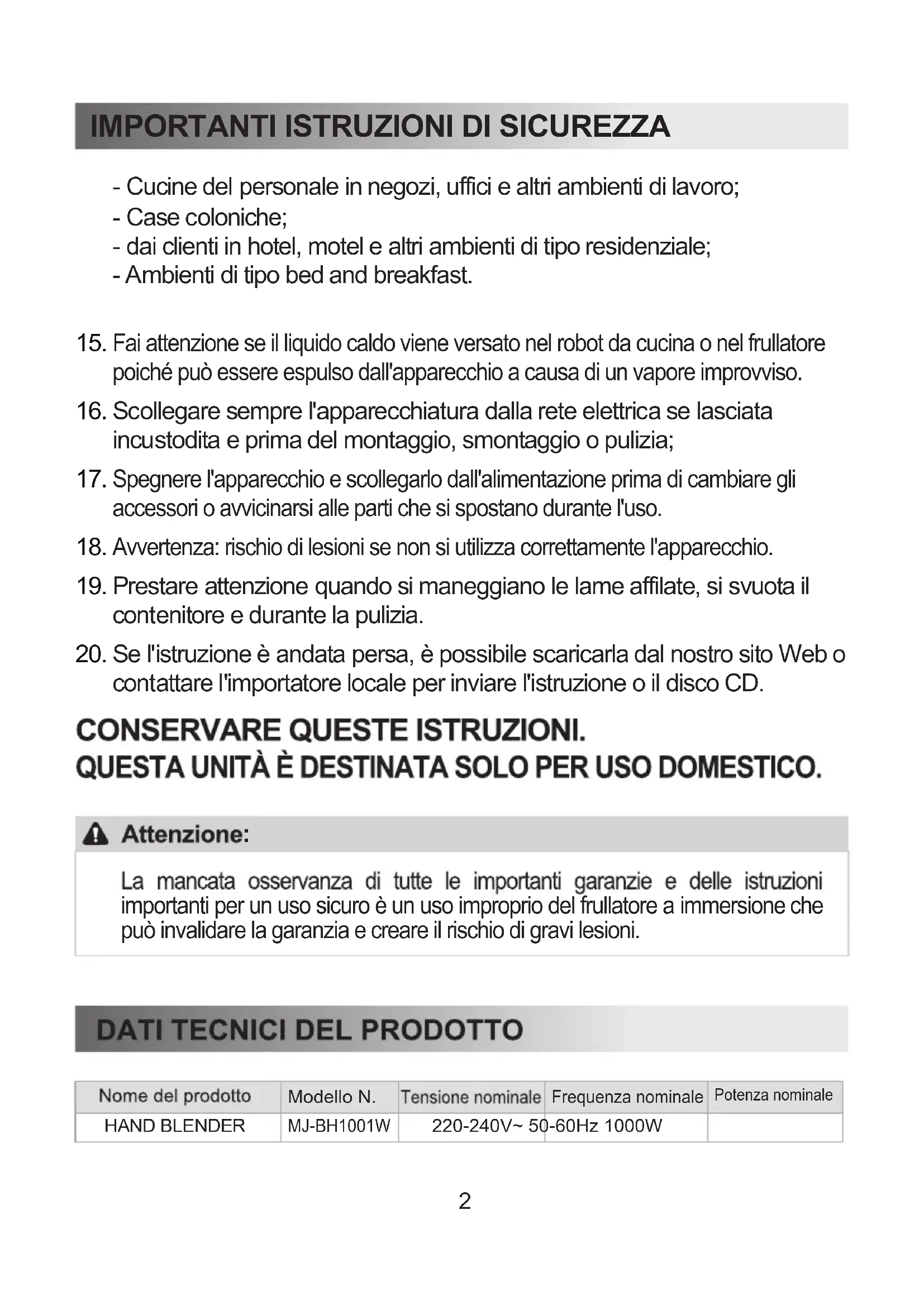 - Cucine del personale in negozi, uffici e altri ambienti di lavoro; - Case coloniche; - dai clienti in hotel, motel e altri ambienti di tipo residenziale; - Ambienti di tipo bed and breakfast. Fai attenzione se il liquido caldo viene versato nel robot da cucina o nel frullatore poiché può essere espulso dall'apparecchio a causa di un vapore improvviso. Scollegare sempre l'apparecchiatura dalla rete elettrica se lasciata incustodita e prima del montaggio, smontaggio o pulizia; Spegnere l'apparecchio e scollegarlo dall'alimentazione prima di cambiare gli accessori o avvicinarsi alle parti che si spostano durante l'uso. Avvertenza: rischio di lesioni se non si utilizza correttamente l'apparecchio. Prestare attenzione quando si maneggiano le lame affilate, si svuota il contenitore e durante la pulizia. Se l'istruzione è andata persa, è possibile scaricarla dal nostro sito Web o contattare l'importatore locale per inviare l'istruzione o il disco CD. importanti per un uso sicuro è un uso improprio del frullatore a immersione che può invalidare la garanzia e creare il rischio di gravi lesioni.