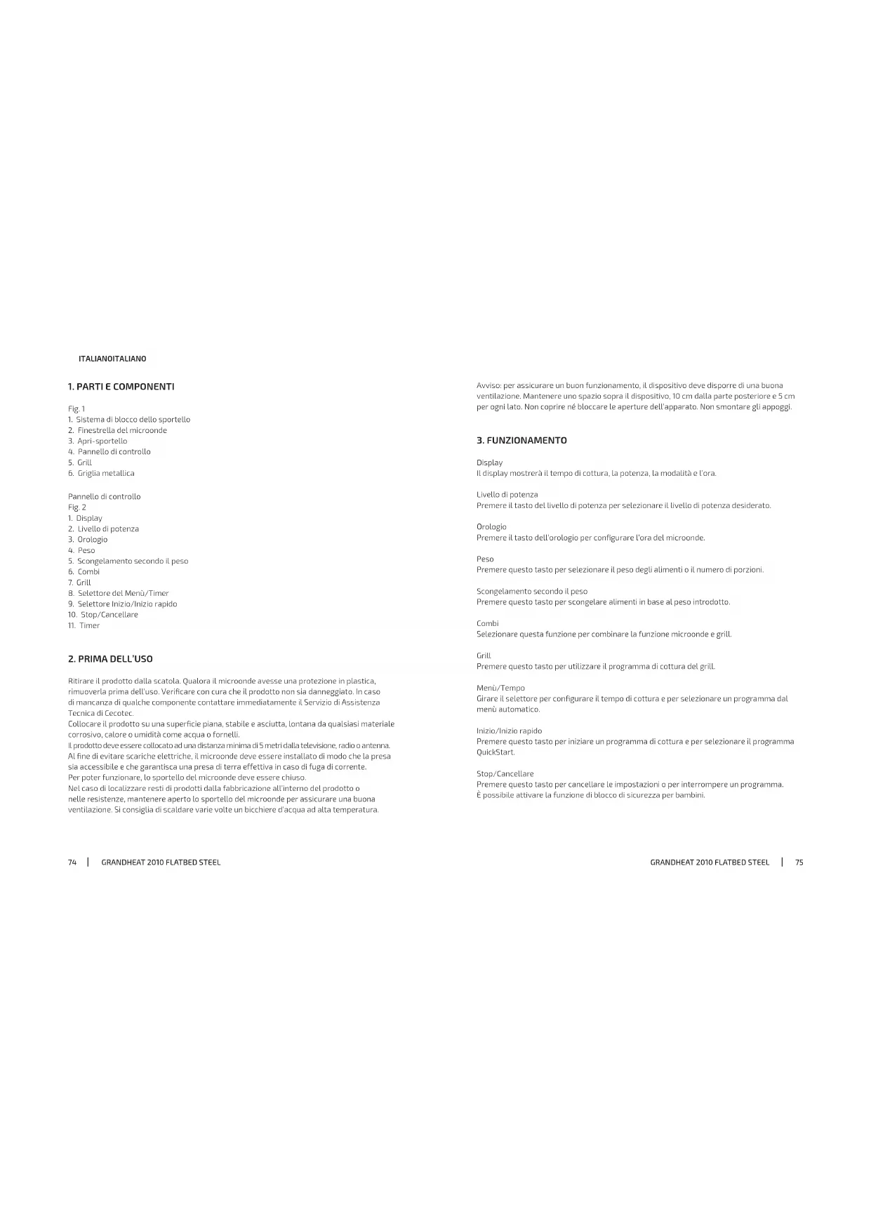 Pulire periodicamente il prodotto da residui di cibo accumulati. Scollegare il cavo dalla corrente della parete prima di iniziare la pulizia. Non sommergere il prodotto in acqua o in altri tipi di liquidi durante la pulizia. La mancanza di manutenzione e di pulizia del prodotto potrebbe deteriorare la supercie e ripercuotersi sulla sua vita utile Mantenere l’interno del dispositivo pulito. Girare il selettore del Menù/Timer per congurare 25:00. Premere il tasto di Inizio/Inizio rapido. Combinazione 2 55 % microonde e 45 % grill. Consigli per preparare pudding, frittate, patate e pollame. Esempio: congurare la combinazione 2 per 12 minuti. Premere 2 volte il tasto Combi. Il display mostrerà CO-2. Girare il selettore del Menù/Timer per congurare 12:00. Premere il tasto di Inizio/Inizio rapido. Avviso: durante il processo premere il tasto Combi per vericare il livello di potenza. Premere il tasto Combi. Combinazione Tempo di cottura Uso Microonde Grill 1 volta COMBI. 1 30% 70% Pesce, patate o gratinato. 2 volte COMBI. 2 55% 45% Pudding, frittata, patate o pollame. Blocco di sicurezza per bambini Questa funzione è stata ideata per evitare l’accensione da parte dei bambini. In caso di interruzione d’uso del dispositivo per 1 minuto, questa funzione si attiverà automaticamente. Tutti i tasti saranno inattivi. Per disattivare questa funzione, aprire o chiudere lo sportello. Funzione timer Questa funzione consente di congurare un programma di cottura all’ora desiderata. Esempio: sono le 8:00 e si desidera iniziare il processo alle 11:30. Dalla modalità standby selezionare il programma di cottura desiderato. Premere una volta il tasto del timer. Girare il selettore del Menù/Timer per selezionare 11 ore (ora). Premere una volta il tasto del timer. Girare il selettore del Menù/Timer per congurarlo alle ore 11:30 (selezionare 30 minuti). Premere una volta il tasto di Inizio/Inizio rapido. Avviso: la funzione QuickStart non si può programmare. Programmi del Menù automatico. Questi programmi prevedono una potenza e tempo di cottura congurati per difetto. Quando si usano questi programmi, selezionare solamente il tipo di alimento e peso.GRANDHEAT 2010 FLATBED STEELGRANDHEAT 2010 FLATBED STEEL 8180 ITALIANO ITALIANO
