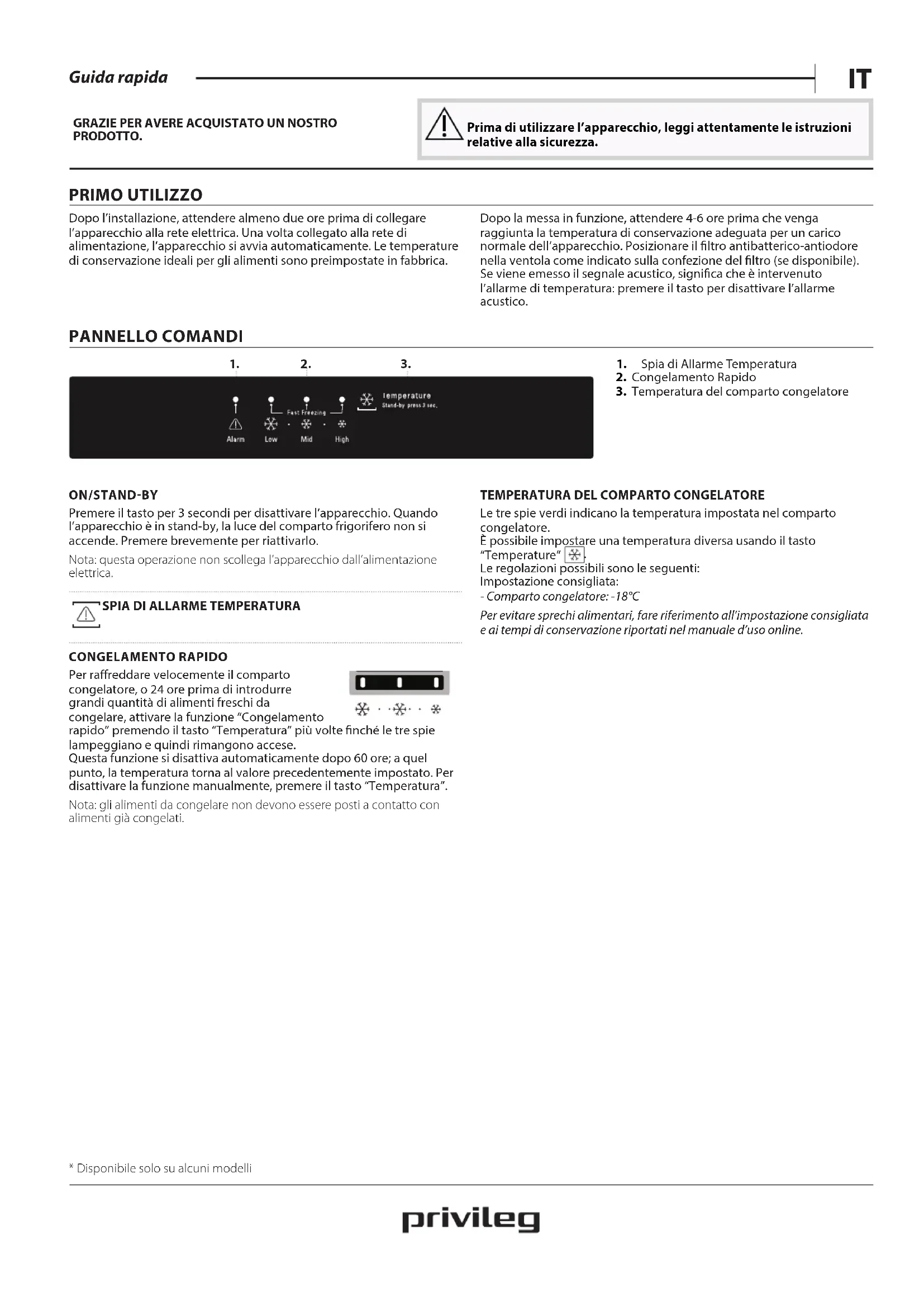 PRODOTTO. Prima di utilizzare l’apparecchio, leggi attentamente le istruzioni relative alla sicurezza. PRIMO UTILIZZO Dopo l’installazione, attendere almeno due ore prima di collegare l’apparecchio alla rete elettrica. Una volta collegato alla rete di alimentazione, l’apparecchio si avvia automaticamente. Le temperature di conservazione ideali per gli alimenti sono preimpostate in fabbrica. Dopo la messa in funzione, attendere 4-6 ore prima che venga raggiunta la temperatura di conservazione adeguata per un carico normale dell’apparecchio. Posizionare il ltro antibatterico-antiodore nella ventola come indicato sulla confezione del ltro (se disponibile). Se viene emesso il segnale acustico, signica che è intervenuto l’allarme di temperatura: premere il tasto per disattivare l’allarme acustico. PANNELLO COMANDI