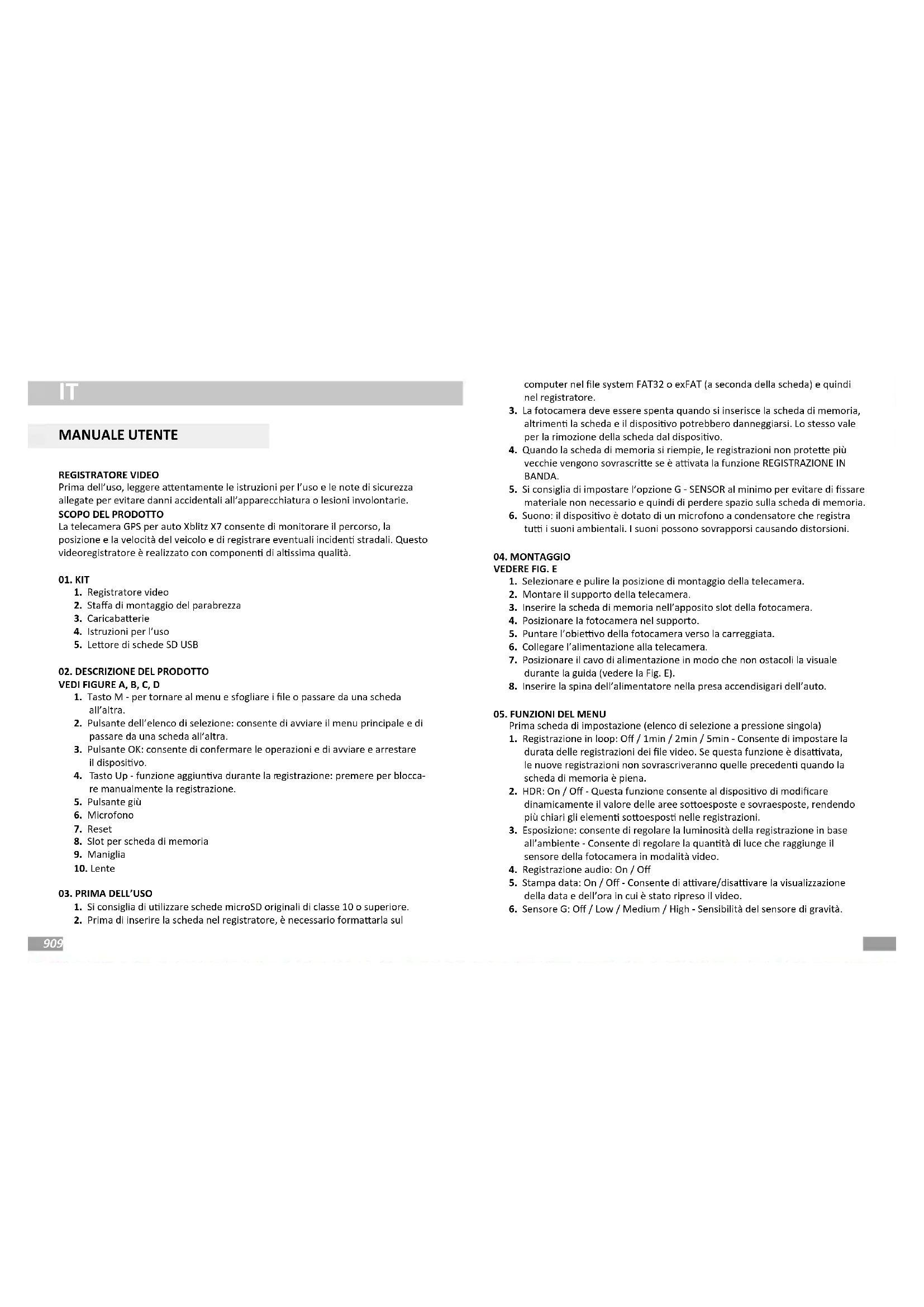 baeria o con l’alimentazione a baeria. Si basa sul fao che quando viene rilevato un impao (a seconda della sensibilità del sensore impostata), la telecamera si avvia e registra per un periodo di tempo in base alle impos-96 97 tazioni del ciclo di registrazione o no a quando la baeria non si scarica e quindi si spegne; ciò consente all’unità di rimanere in modalità standby il più a lungo possibile. Le registrazioni in modalità parcheggio possono essere di qualità inferiore a causa della minore frequenza dei fotogrammi che caraerizza questa modalità. Il produore non si assume alcuna responsa- bilità per la mancata registrazione di eventuali danni causa dall’uso della modalità di parcheggio.