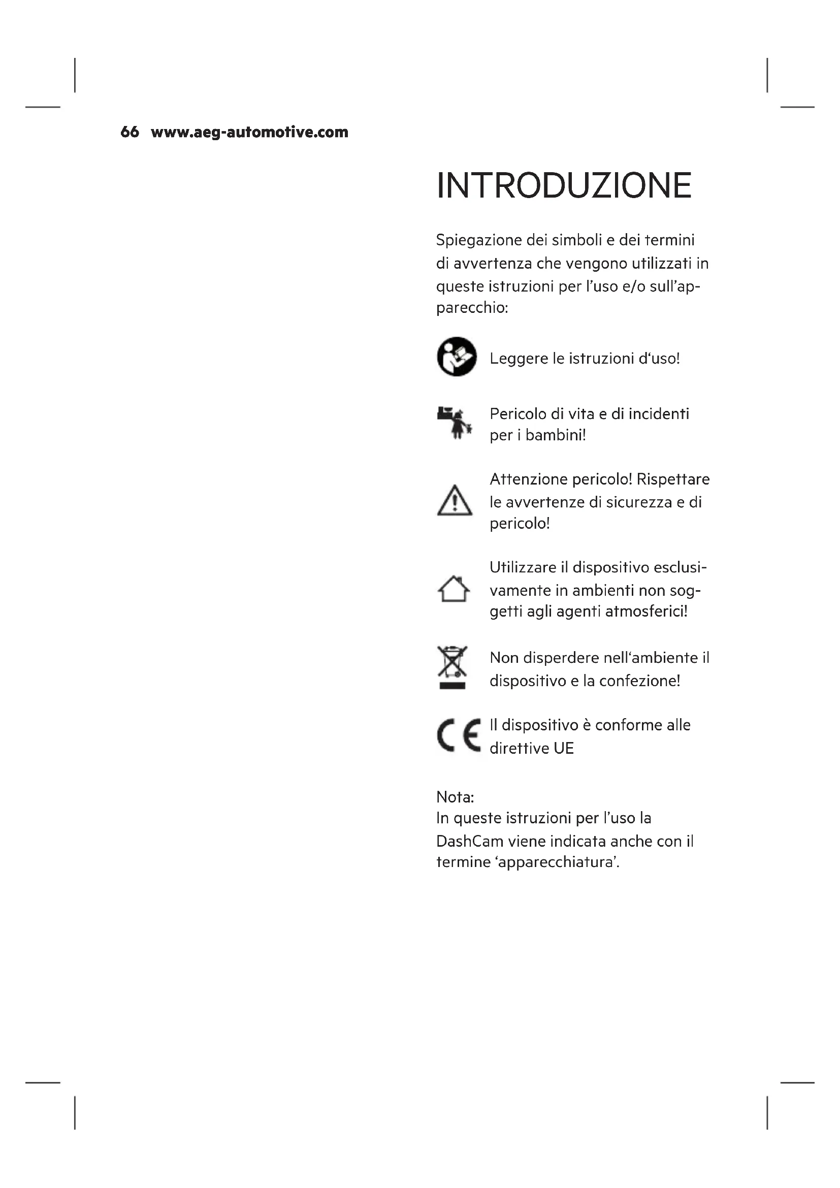 Apertura non autorizzata dell’apparecchio. In tali casi la garanzia deca- de. Avvertenza! Pericolo di vita e di incidenti per i bambini!. Pericolo di soocamento e strangolamento! Tenere l’apparecchio lontano dallawww.aeg-automotive.com